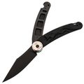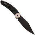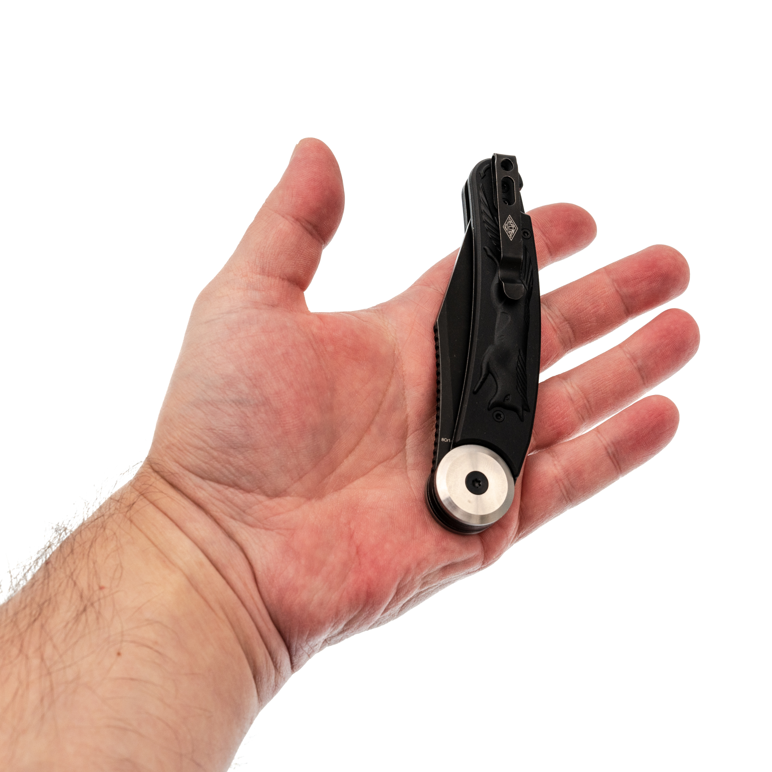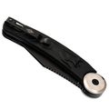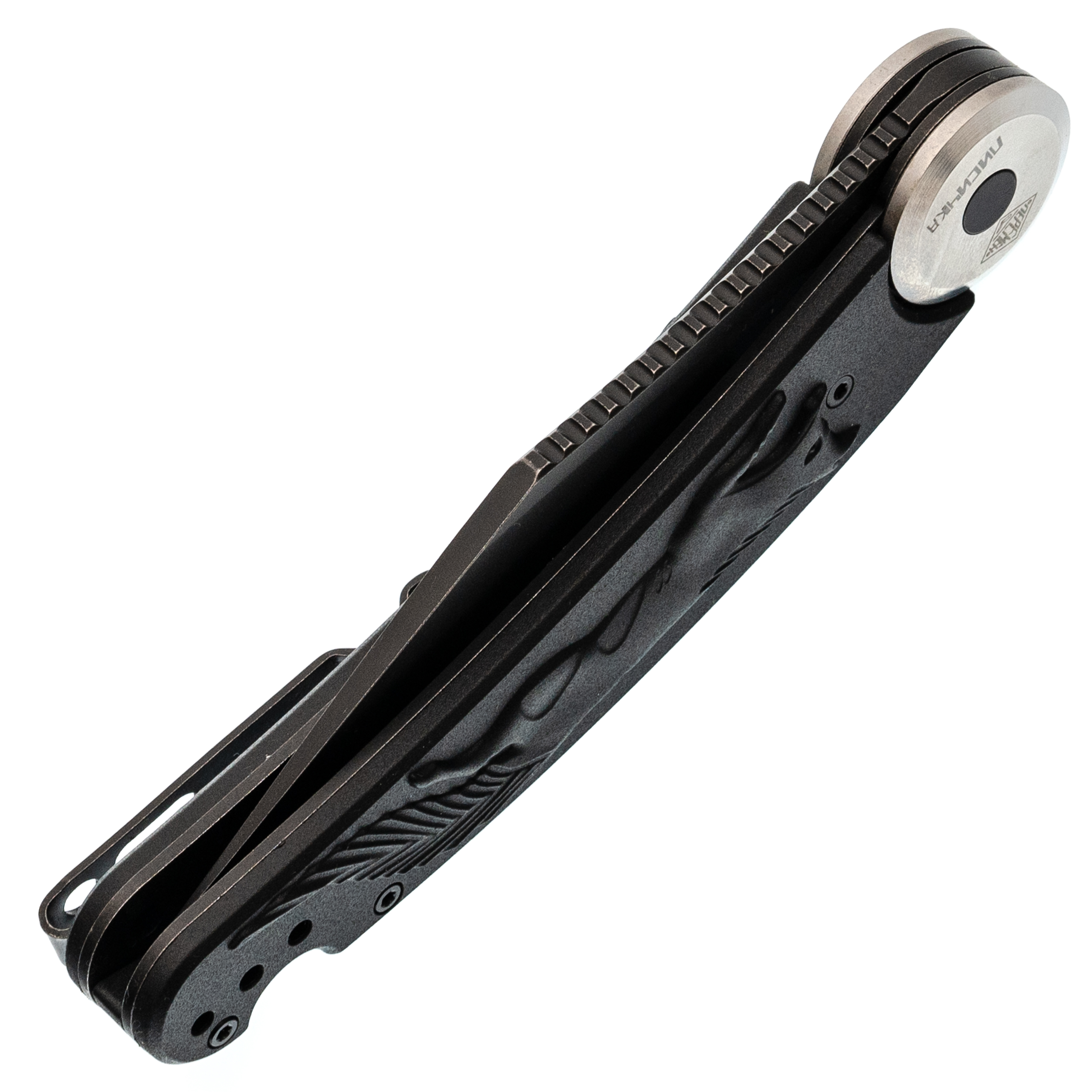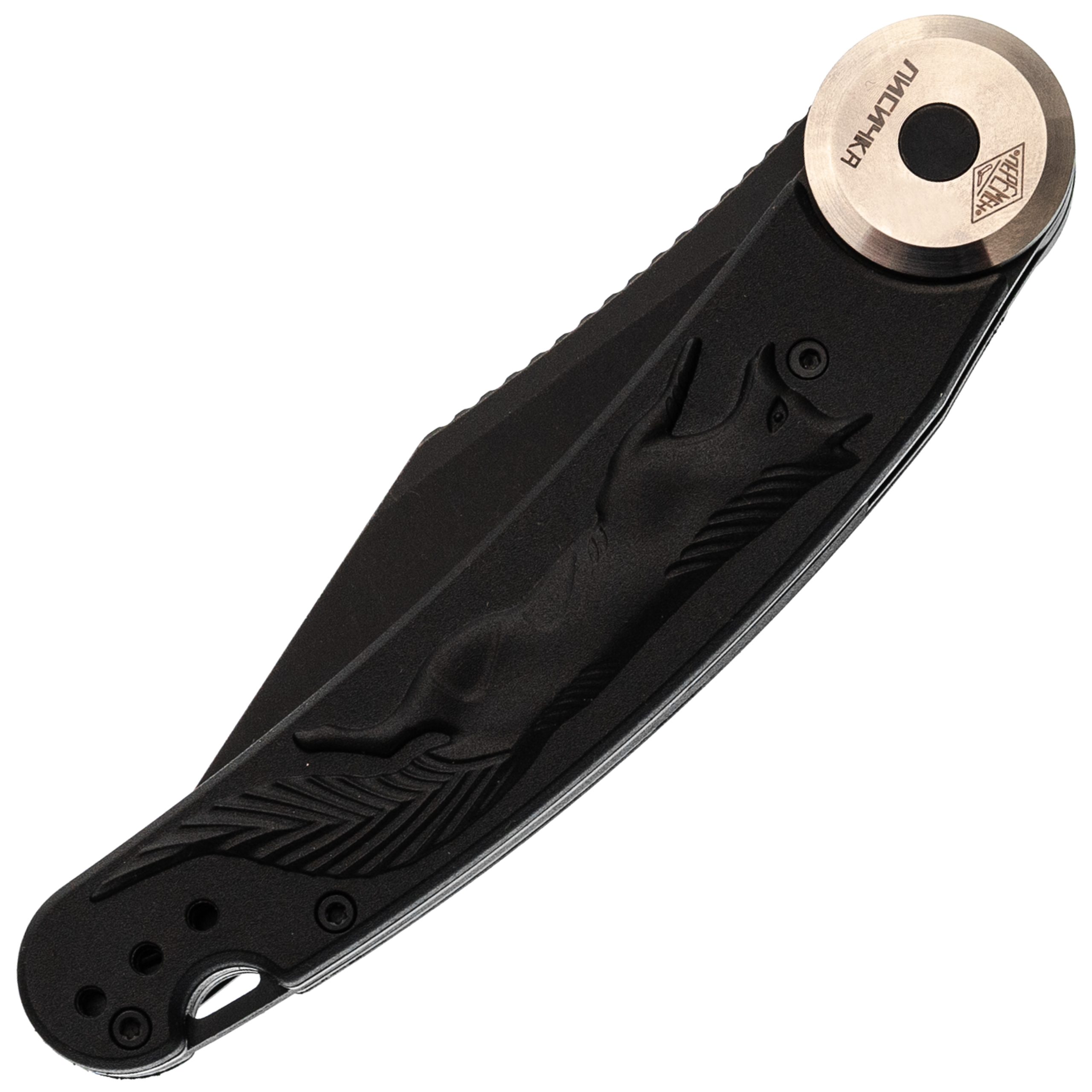 Здесь применена оригинальная конструкция: рукоять разделяется на две половины и вращается вокруг оси. В открытом положении она фиксируется штифтом, превращая нож в монолитную конструкцию. Это очень надежный замок, который исключает случайное складывание во время работы. Плата за такую жесткость - необходимость открывать нож двумя руками, но для спокойного использования это не проблема. Накладки выполнены из черного FRN с рельефным рисунком в виде лисицы, что добавляет ножу индивидуальности и улучшает сцепление с рукой.