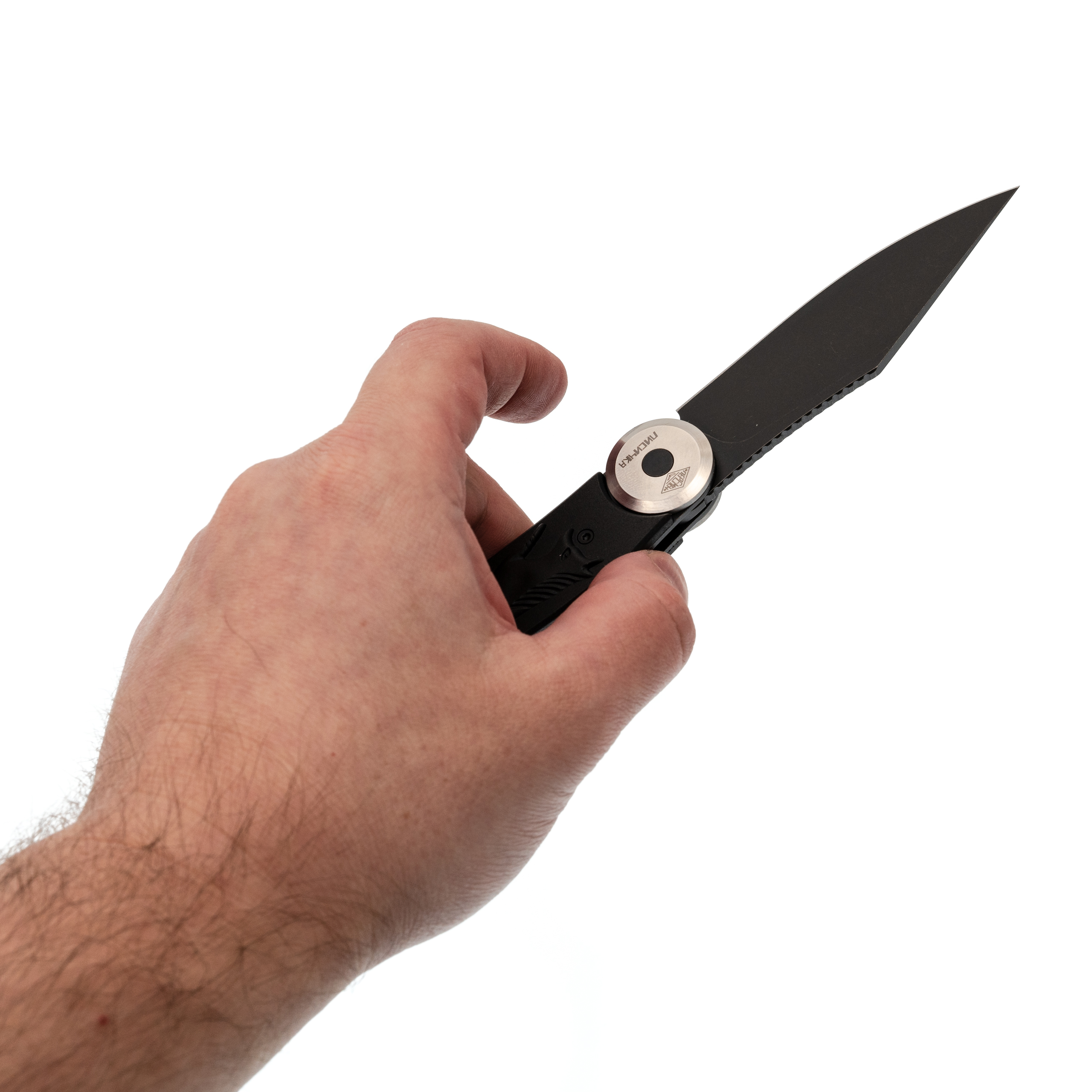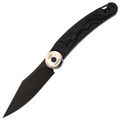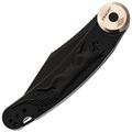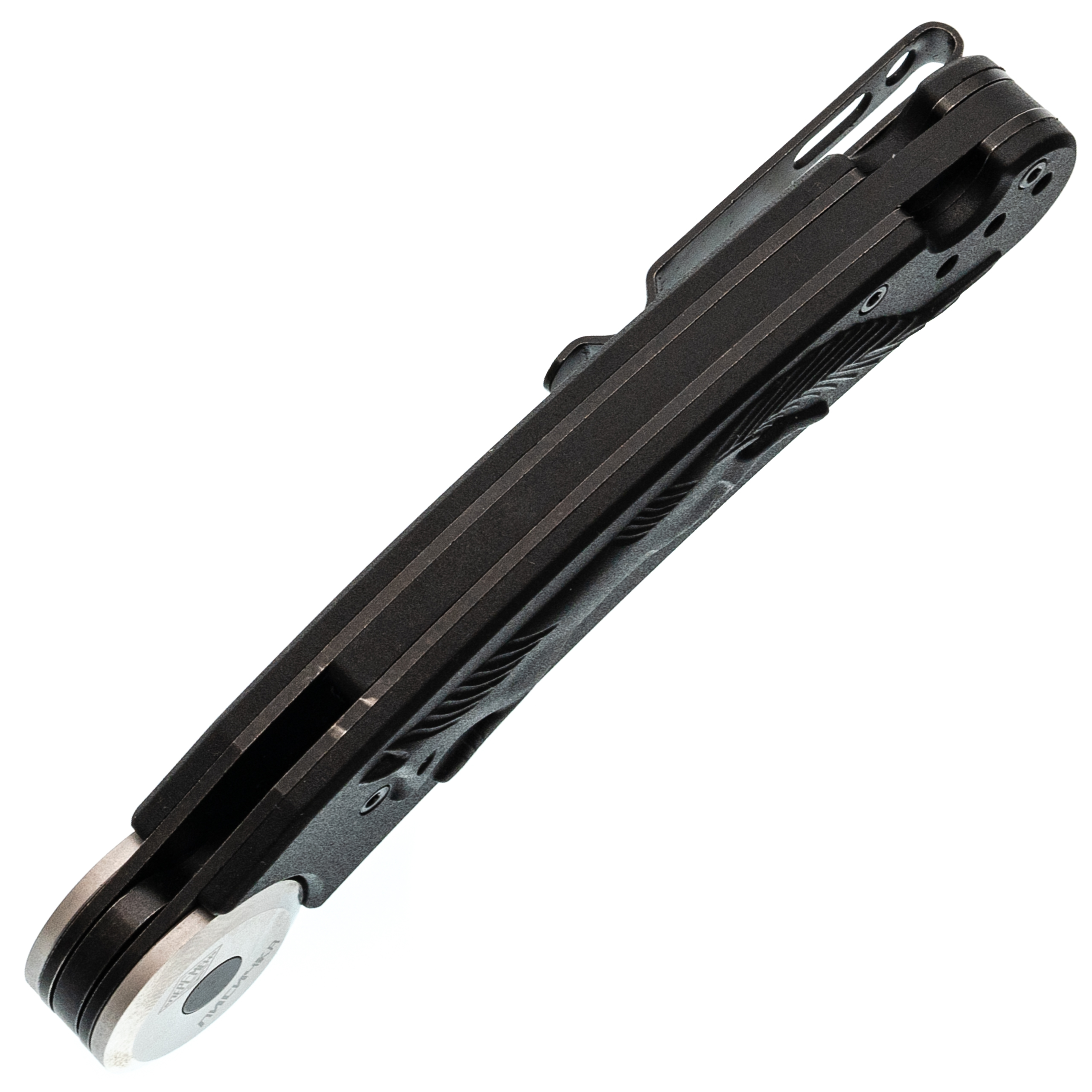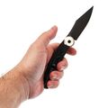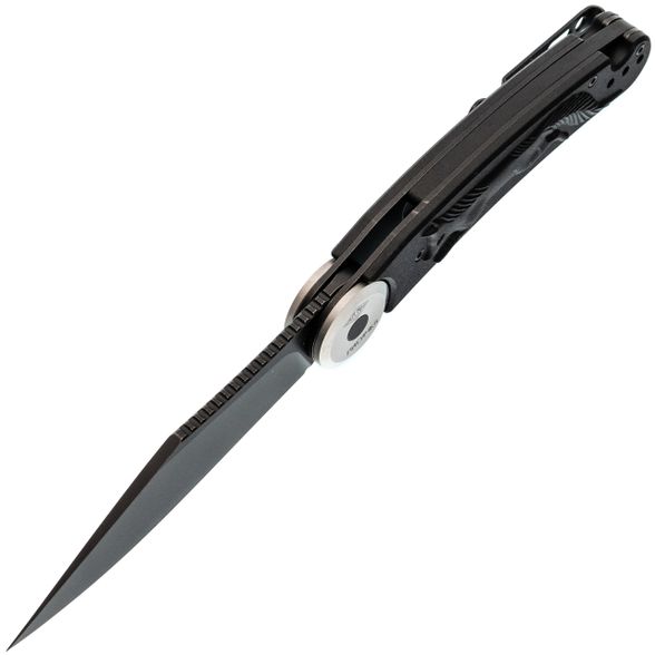 Форма клинка выбрана не случайно - профиль Clip-Point идеален для точных и аккуратных резов. Прямые спуски от обуха позволяют ножу буквально врезается в материал. Это отличная геометрия для резки продуктов, строгания дерева или разрезания строп. На обухе выполнена насечка для упора пальцем - мелочь, а контроль над инструментом повышает заметно. Поверхность клинка в этой версии имеет покрытие Black Stonewash. Это практичное решение: темный цвет скрывает мелкие царапины, которые неизбежно появляются в процессе использования, и придает ножу стильный вид.