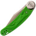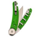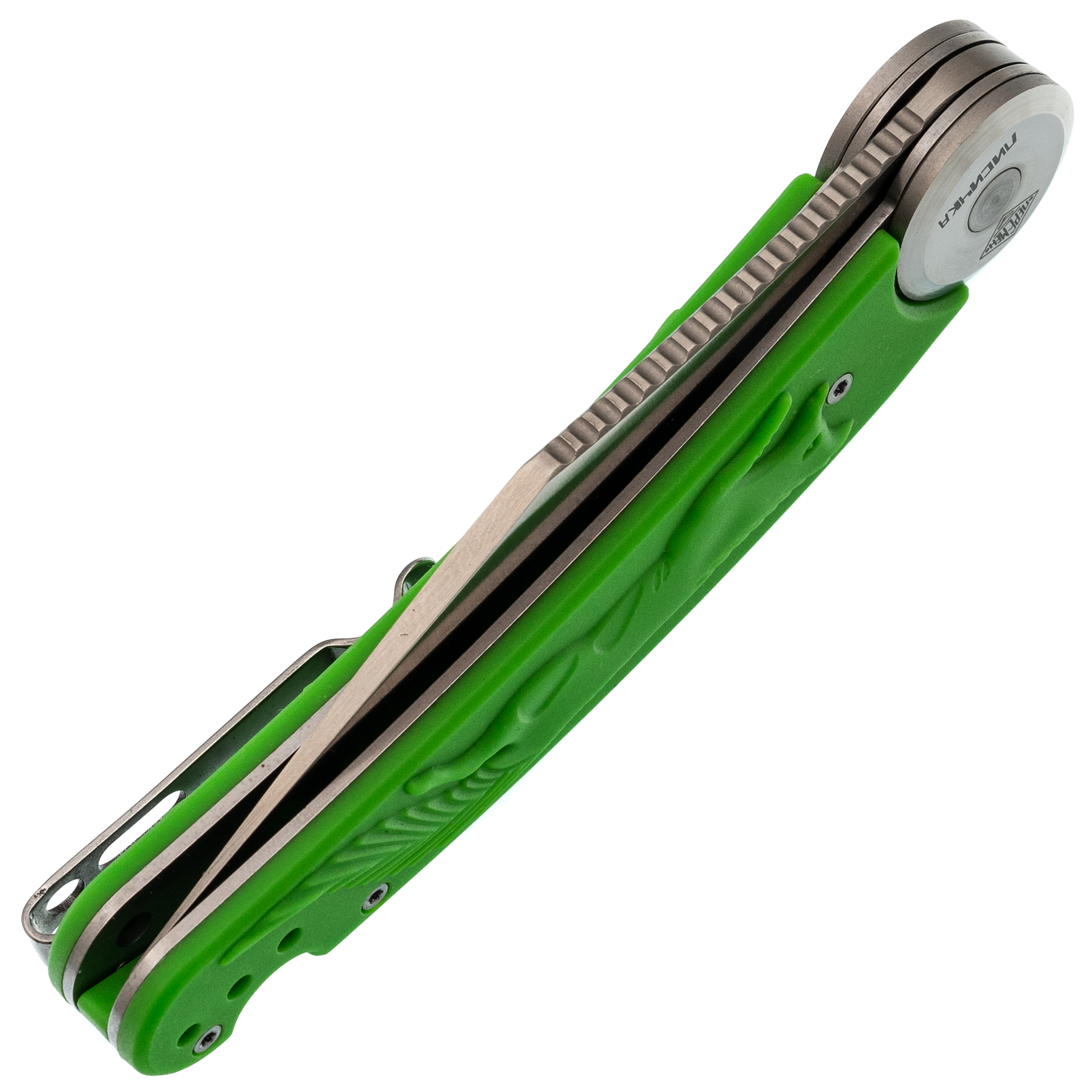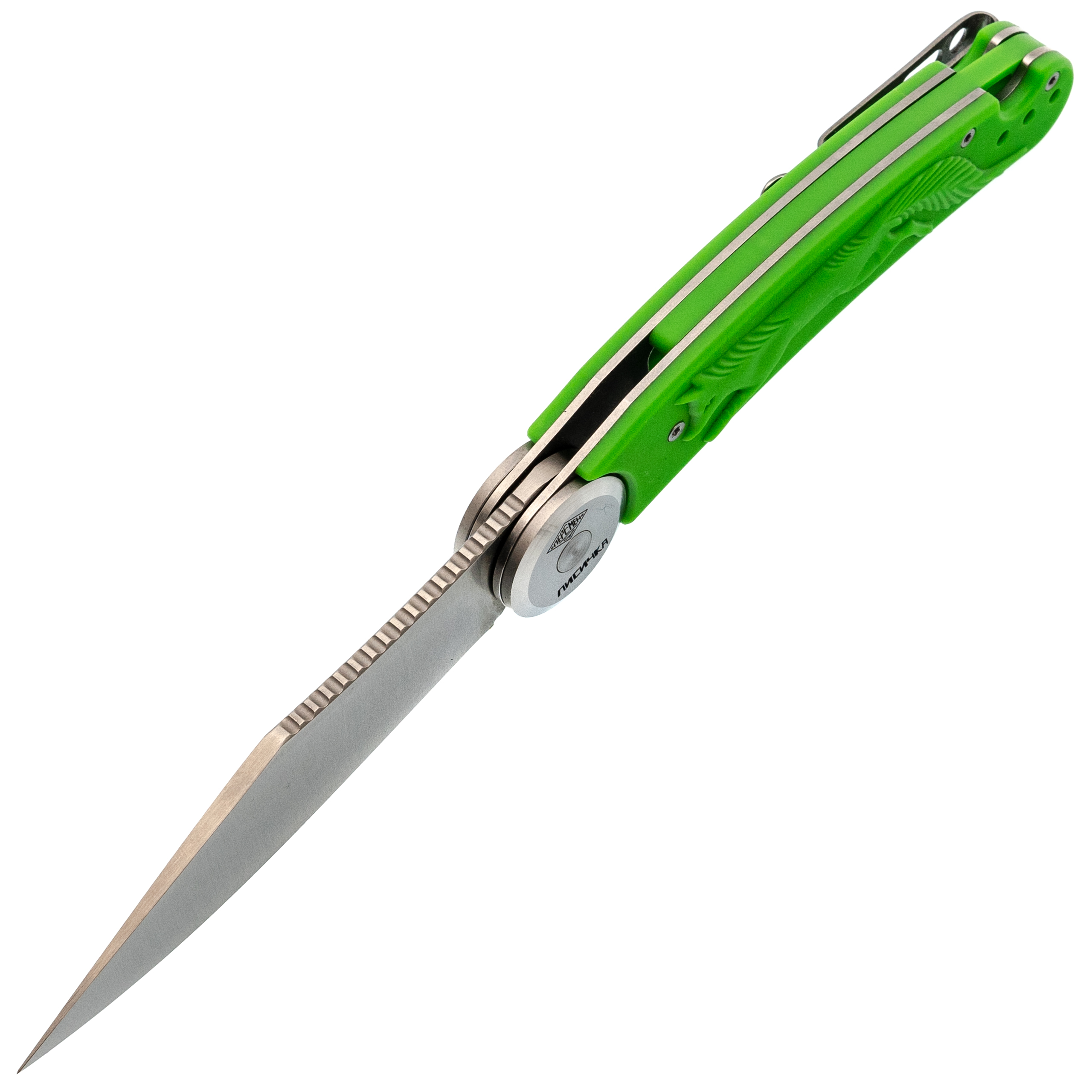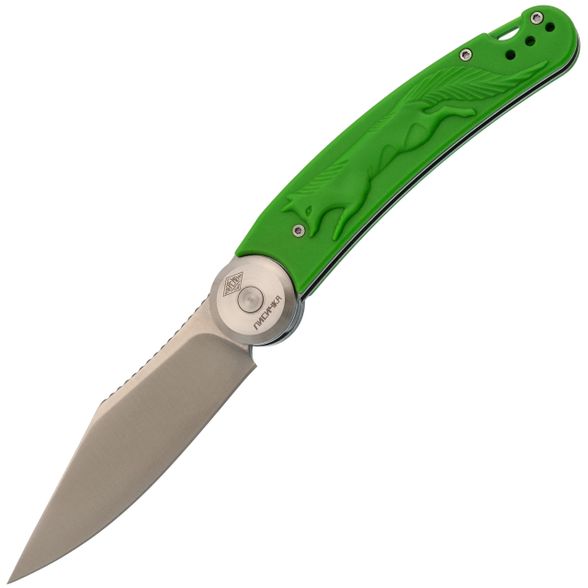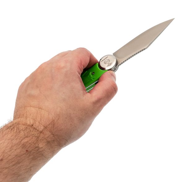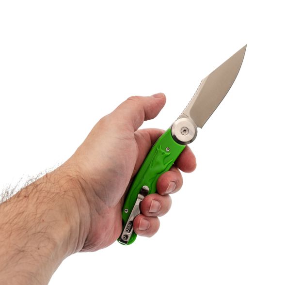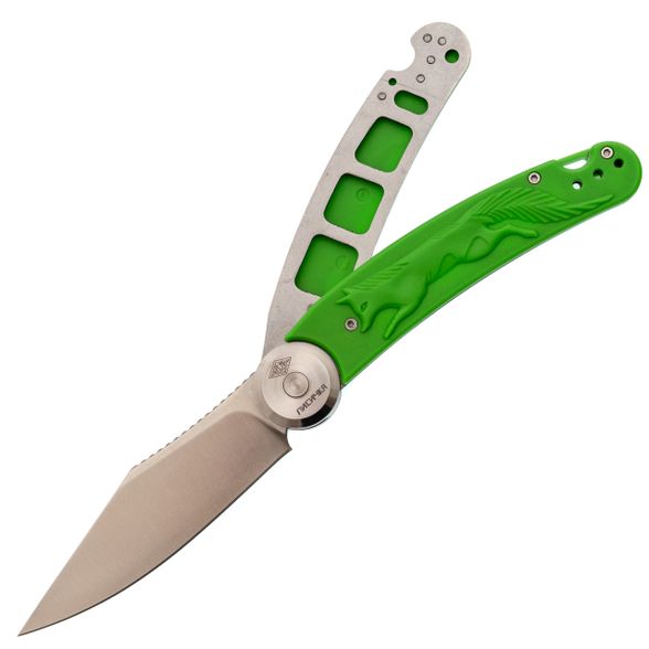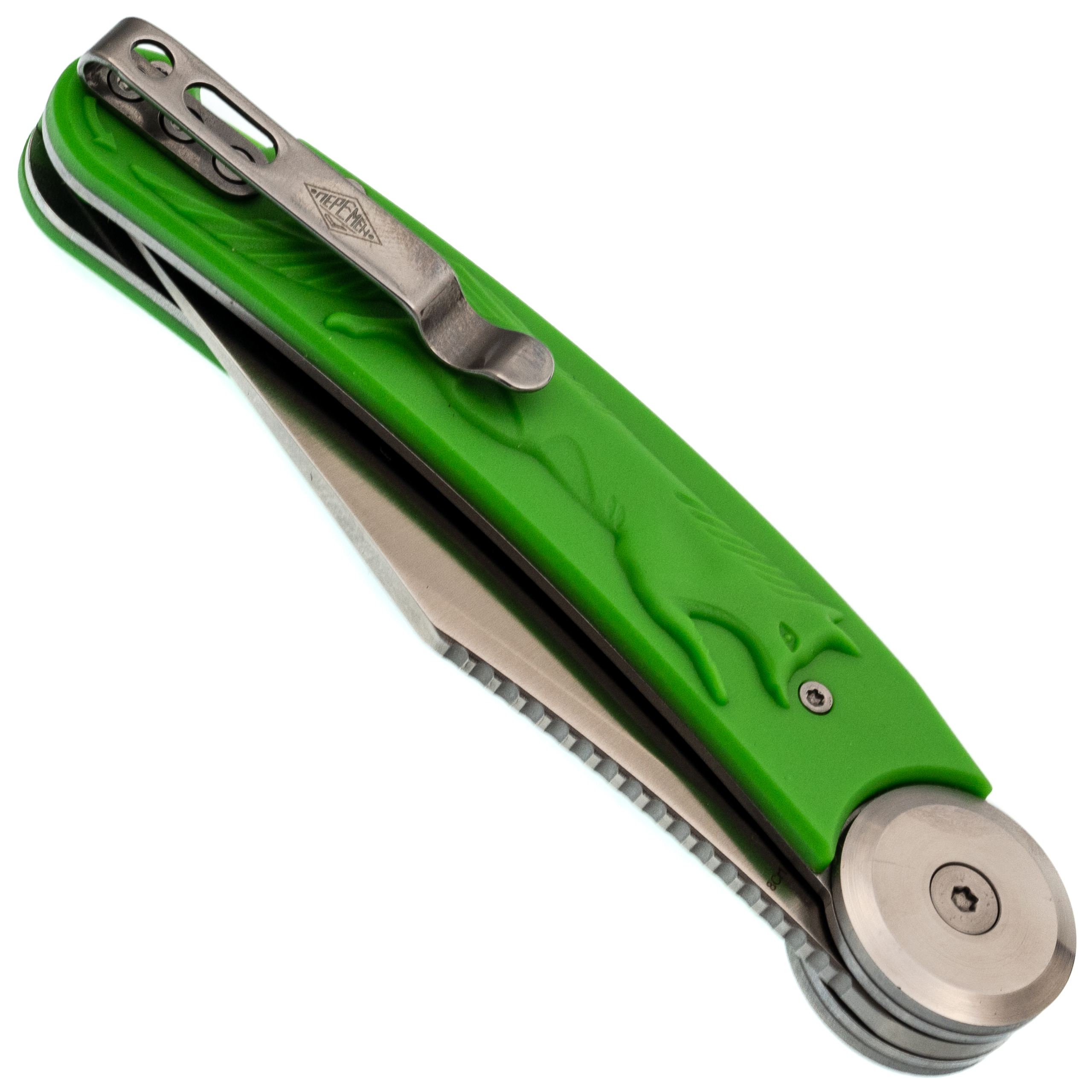 Замок здесь необычный - рамочный, с поворотной конструкцией. Когда нож открыт, он сидит намертво, без малейших люфтов. Это одна из самых безопасных систем: клинок не сложится на пальцы даже при самой грубой работе. Да, открывается он двумя руками, зато в использовании вы получаете абсолютную надежность. Рукоять в этой версии выполнена в зеленом цвете. На накладках изображена та самая лисица, которая дала название модели. Цветная рукоять делает нож заметным, и его сложнее потерять в городских условиях.