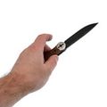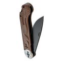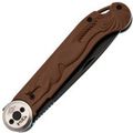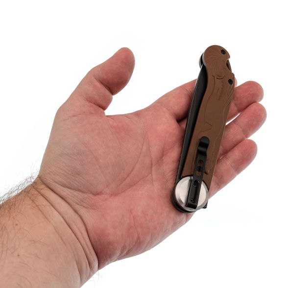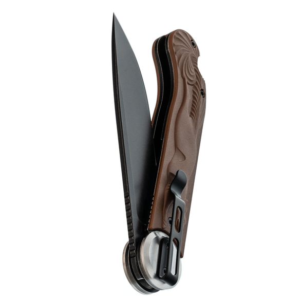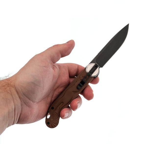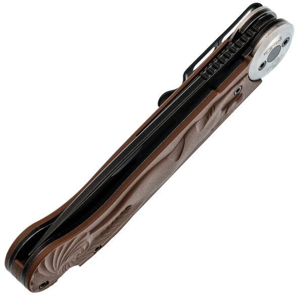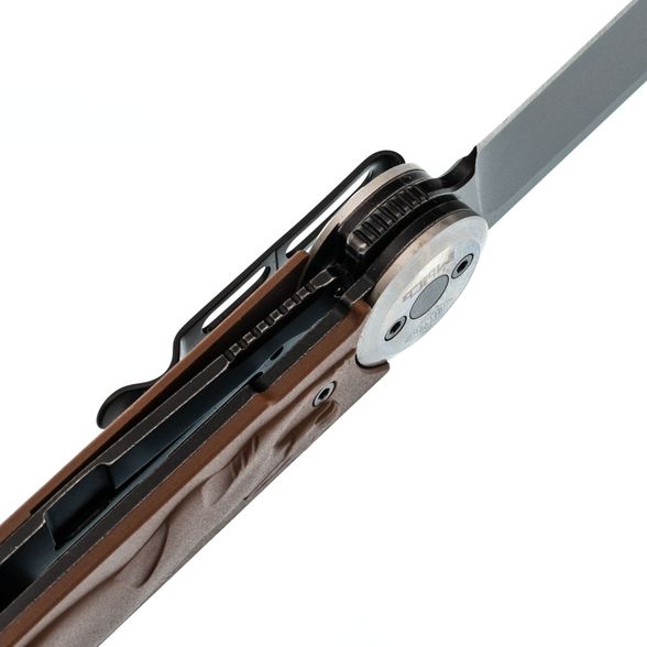 Рукоять данной модели выполнена из сочетания FRN и нержавеющей стали, что обеспечивает высокую прочность и комфорт даже при длительной эксплуатации. Накладки из FRN выполнены в элегантном коричневом цвете, отсылая к традиционным деревянным рукоятям прошлых лет и придавая ножу винтажный шарм. В конструкции осевого узла используются качественные подшипники, гарантирующие стремительное и плавное открытие клинка, а надёжный замок Liner-Lock обеспечивает безопасное использование. Дополнительное широкое темлячное отверстие позволяет владельцу украсить нож стильным темляком, подчеркнув индивидуальность и характер этого современного инструмента.
