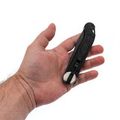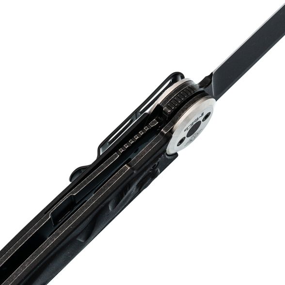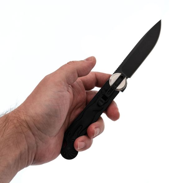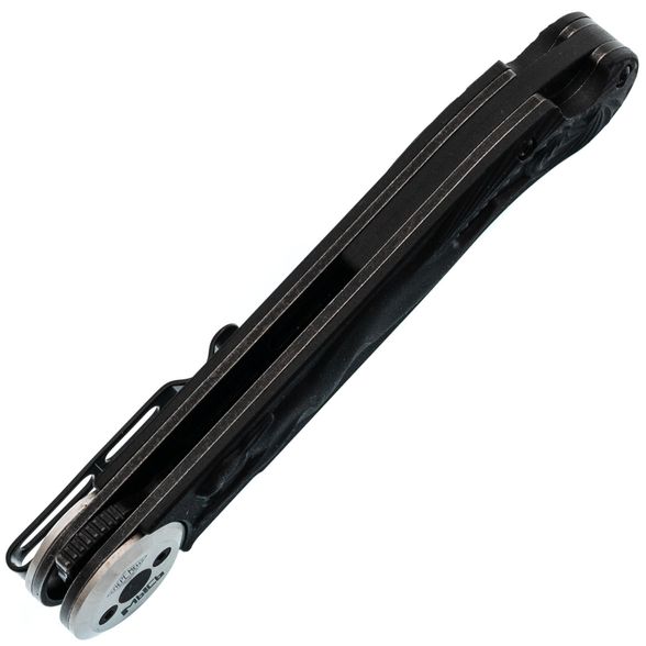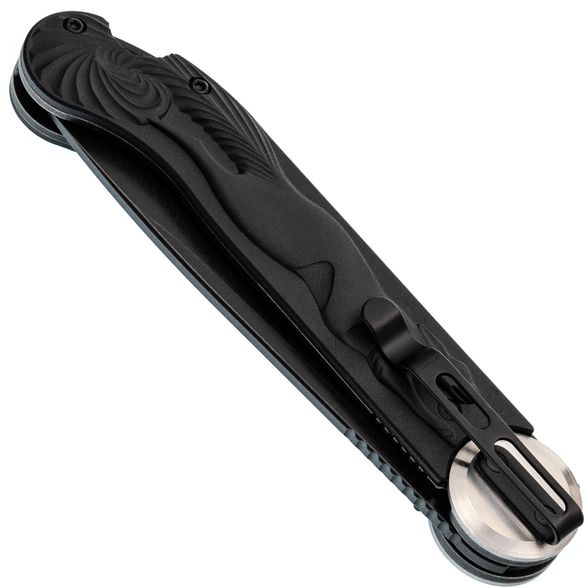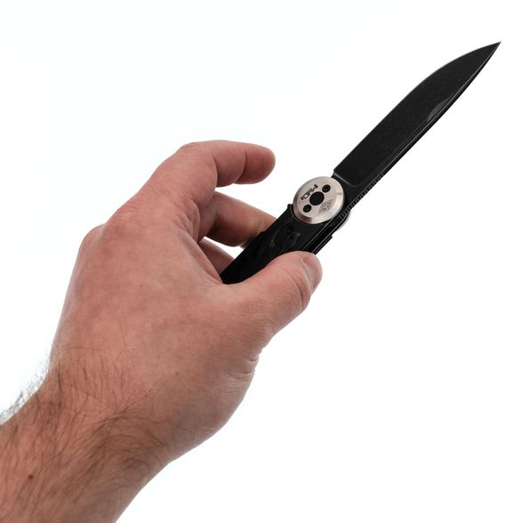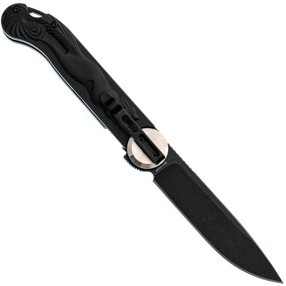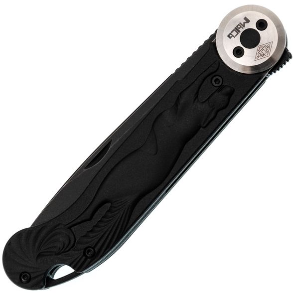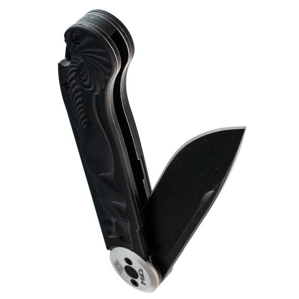 Рукоять ножа сочетает в себе нержавеющую сталь и термопластик FRN. Основа рукояти выполнена из стали, которая образует прочную конструкцию и крупный осевой узел, а накладки из FRN формируют удобный хват. FRN – это легкий, прочный и всепогодный материал, устойчивый к воде и выцветанию. На накладках изображена мысь, что отсылает к эстетике советских ножей. В отличие от своих предшественников, модель оборудована замком Liner-Lock, который повышает безопасность и надежность в работе. Нож также оснащен отверстием для темляка и переставляемой клипсой для ношения в положении Tip-Down.