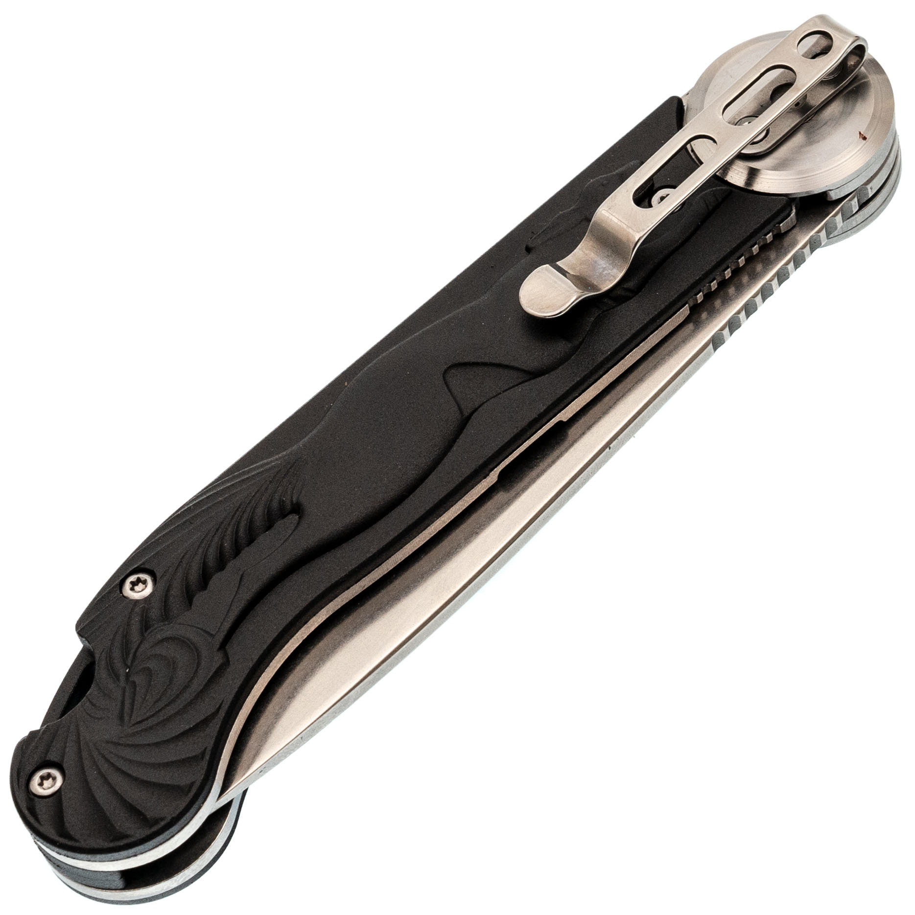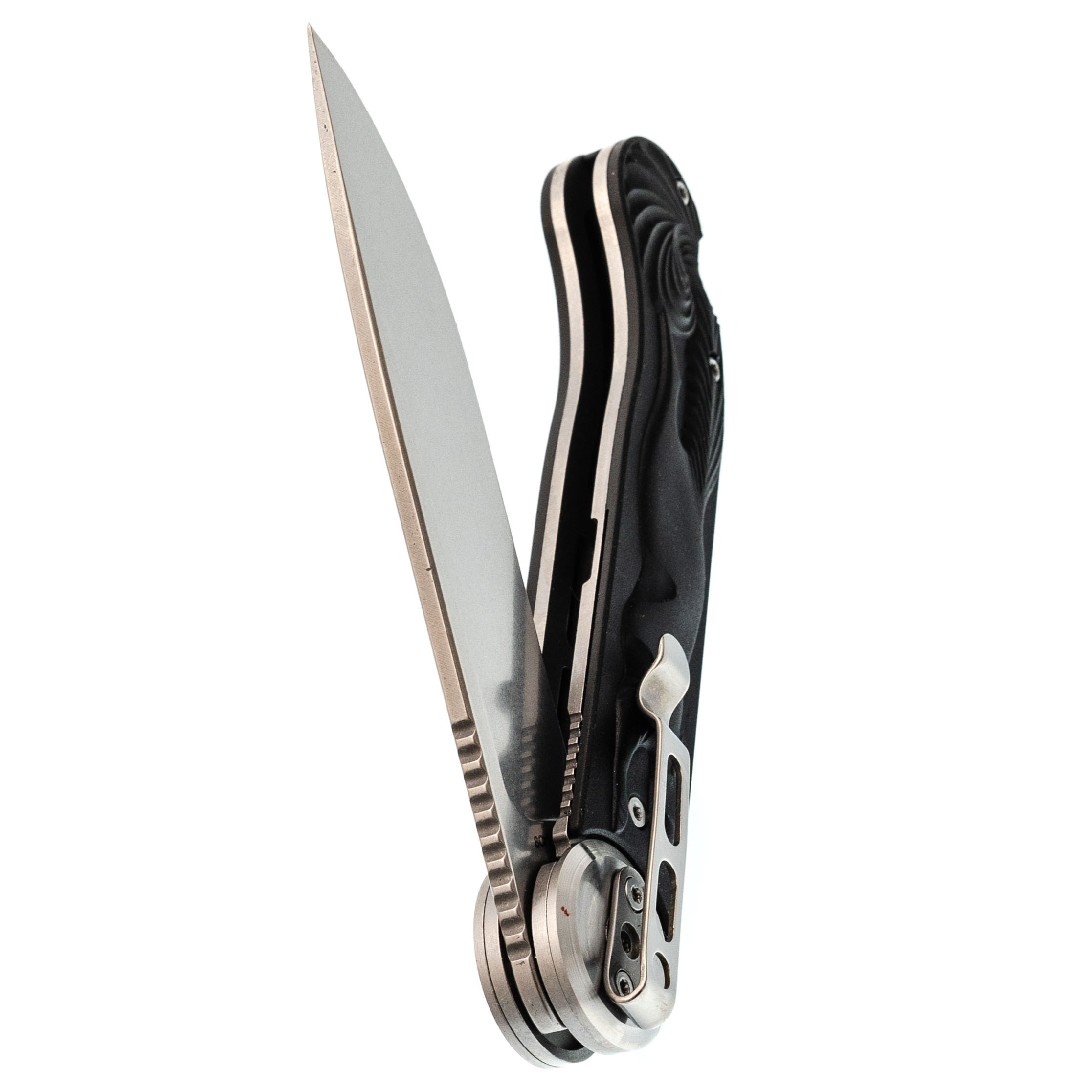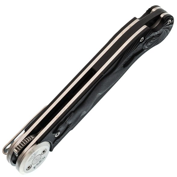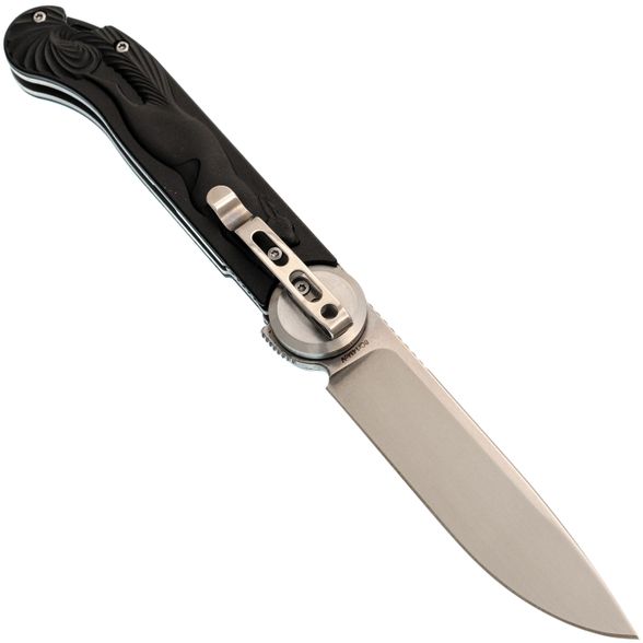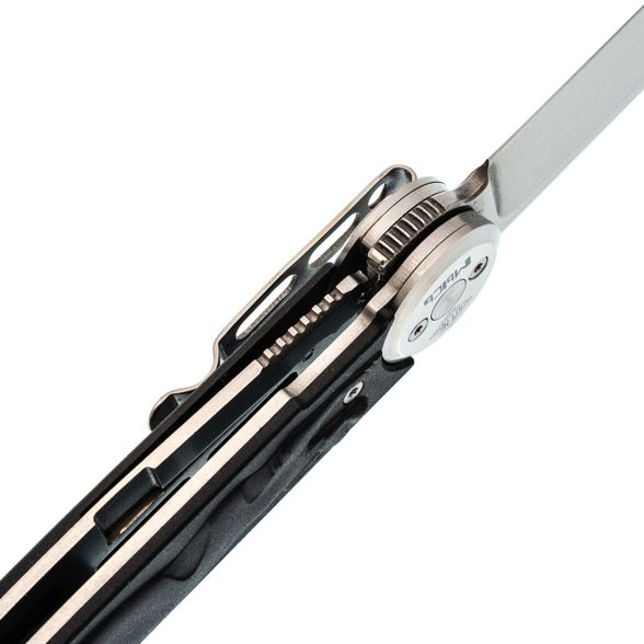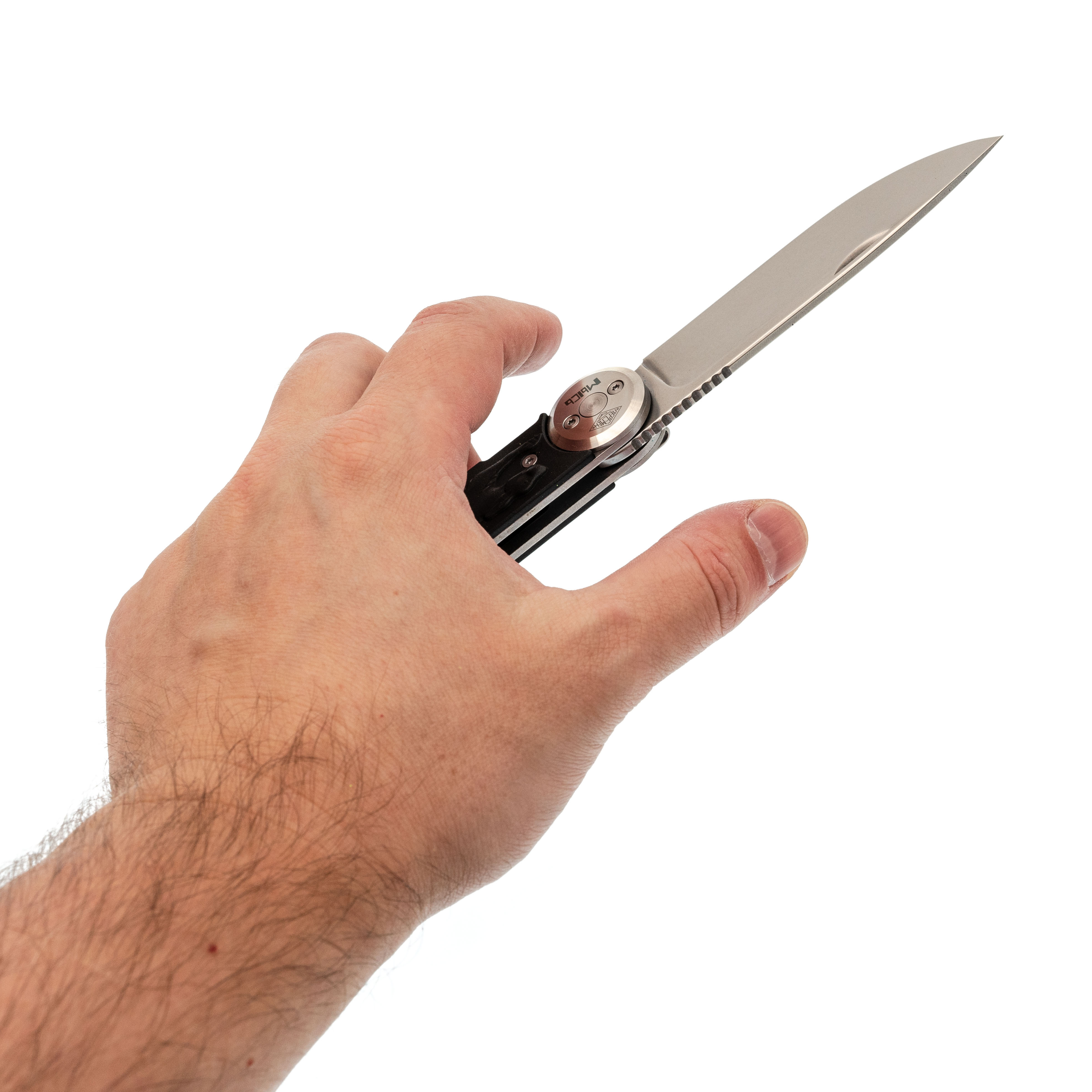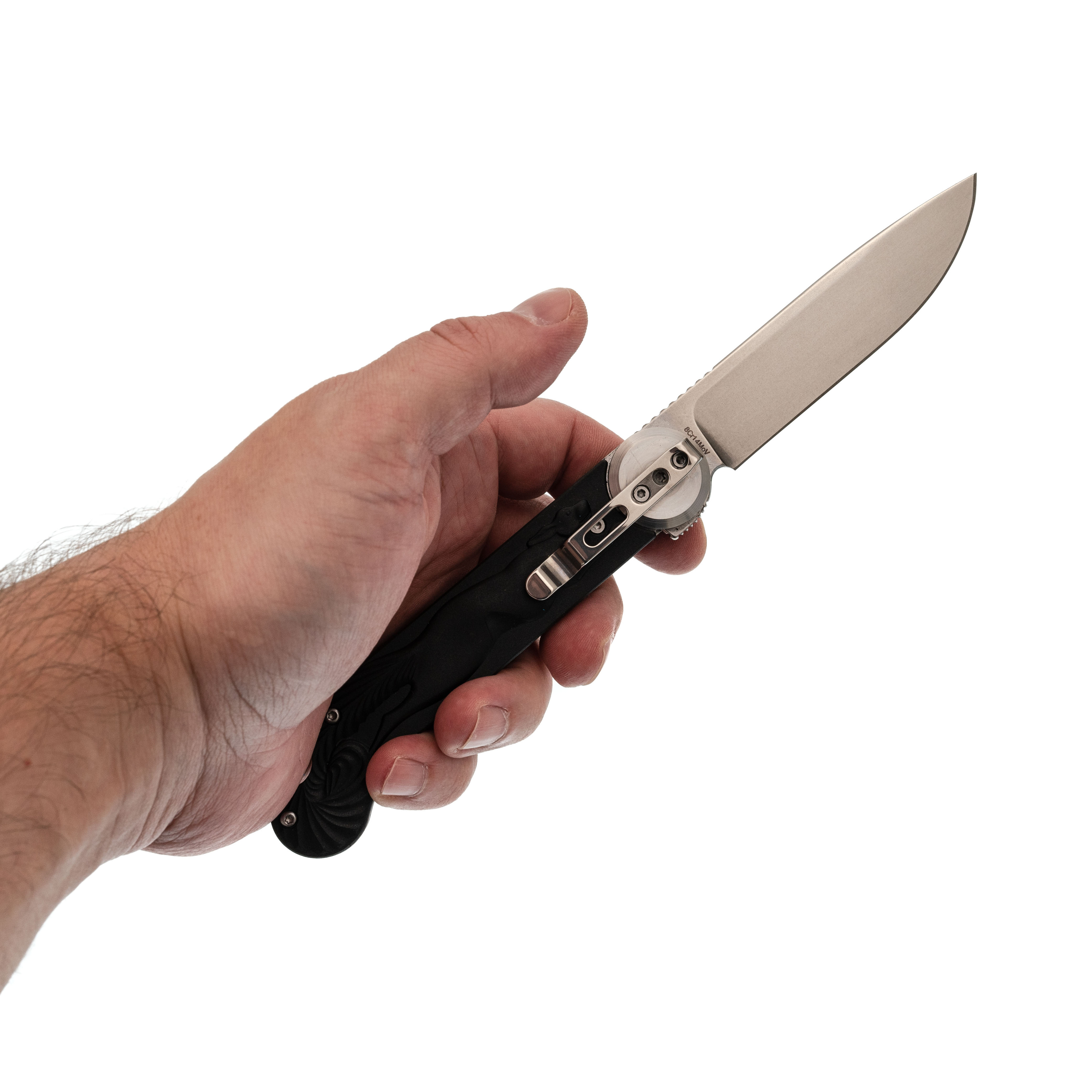 Рукоять выполнена с использованием высококачественного FRN в сочетании с элементами нержавеющей стали, что гарантирует надёжность, долговечность и комфортный хват. Накладки из FRN представлены в строгом чёрном цвете, что подчёркивает классический облик модели и придаёт ей элегантную утончённость. Осевой узел оснащён высокоэффективными подшипниками, обеспечивающими стремительное и плавное открытие клинка, а система блокировки Liner-Lock гарантирует безопасность даже при активном использовании. Дополнительное широкое темлячное отверстие позволяет украсить нож индивидуальным темляком, подчёркивая уникальный стиль этого современного ремейка.