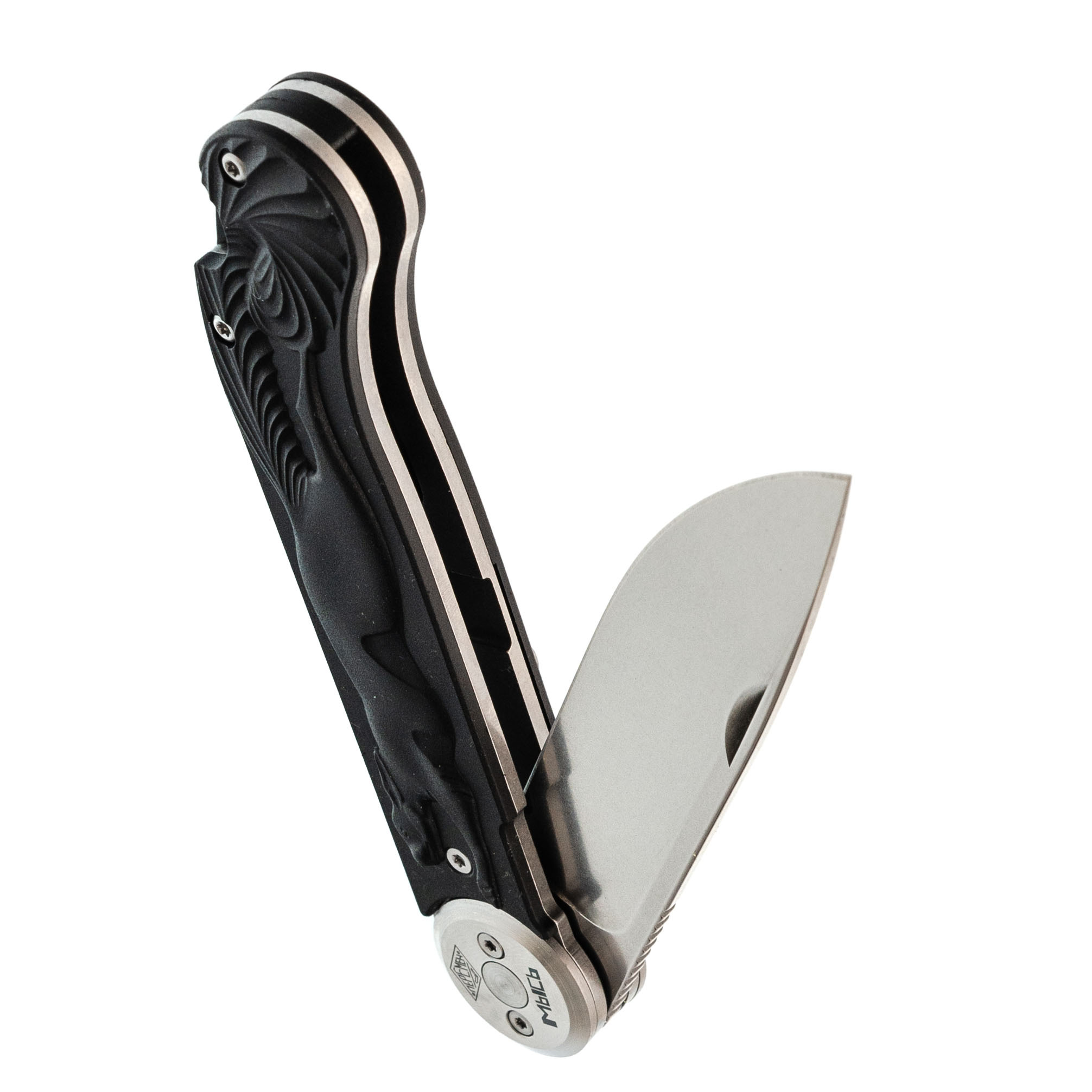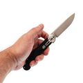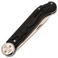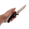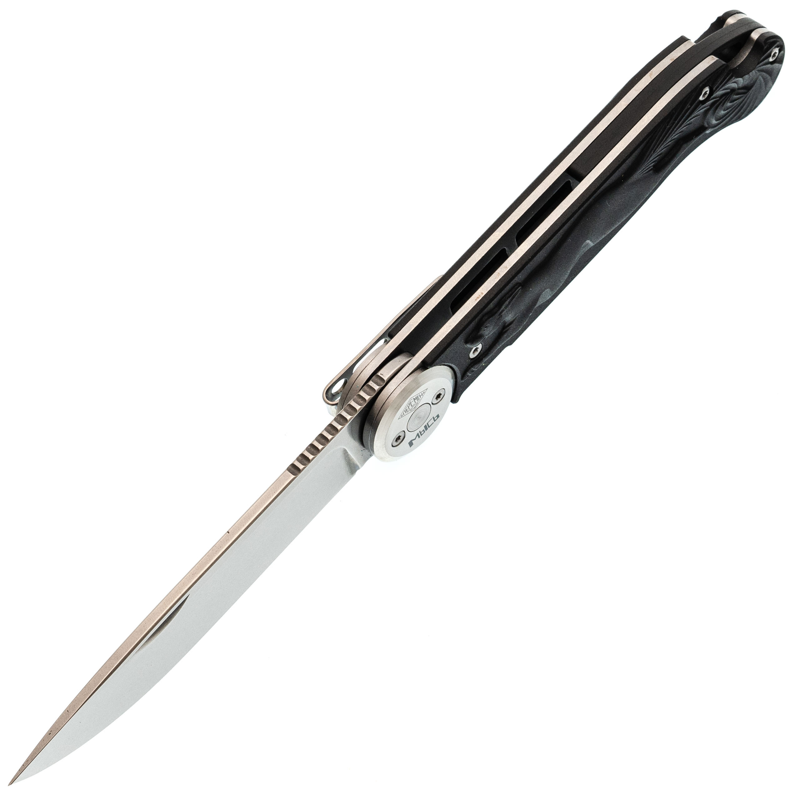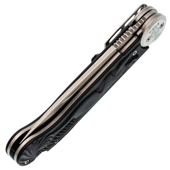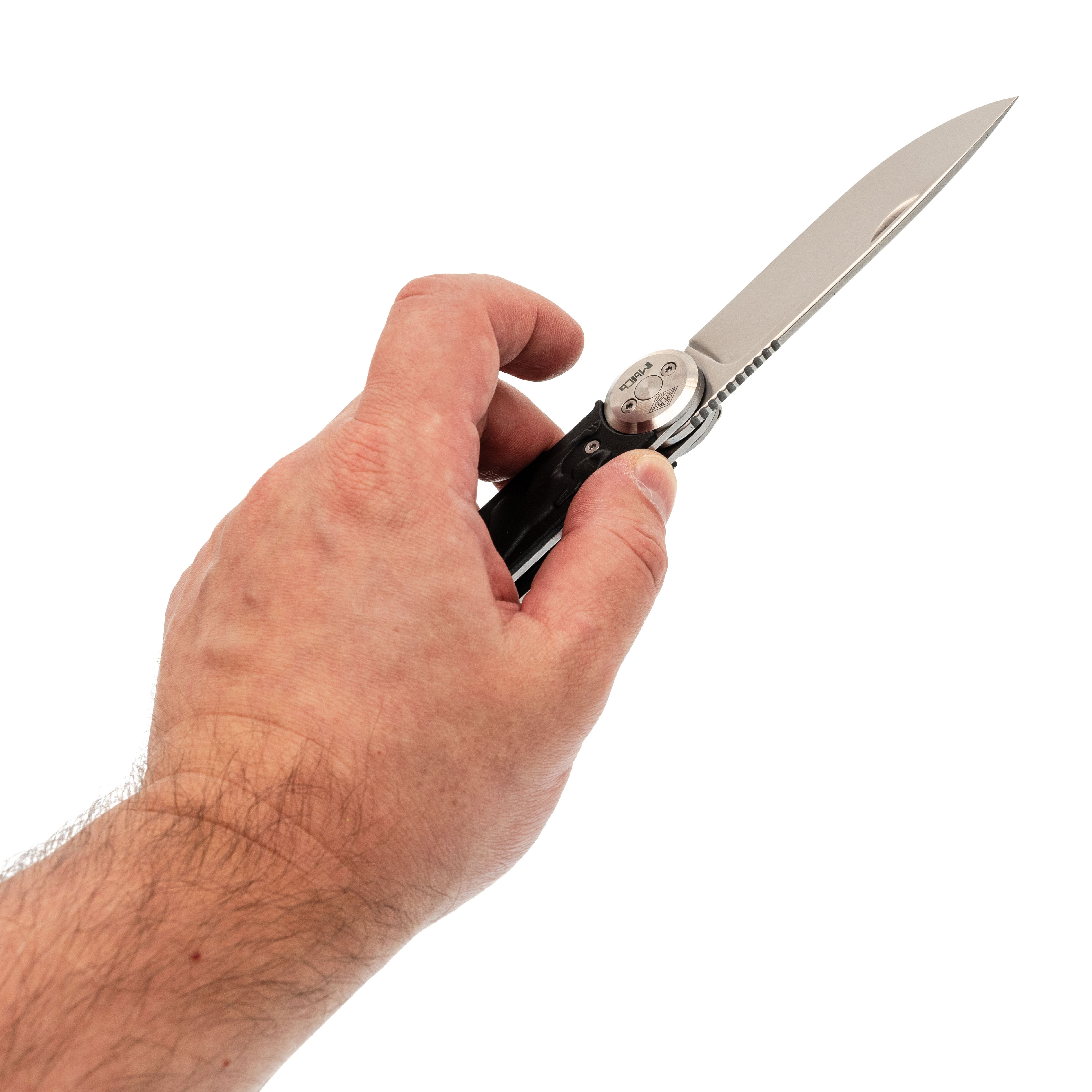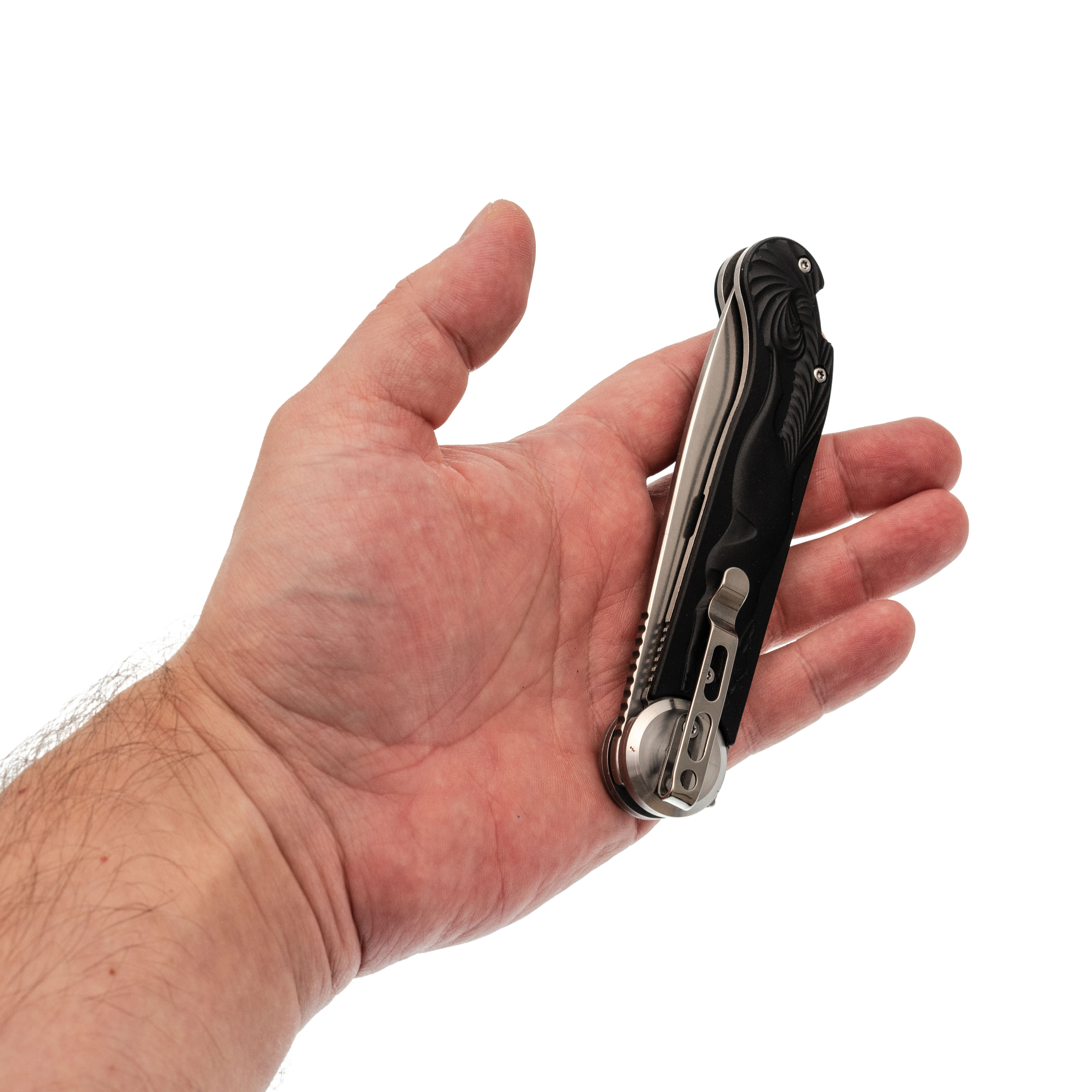 Рукоять выполнена с использованием высококачественного FRN в сочетании с элементами нержавеющей стали, что гарантирует надёжность, долговечность и комфортный хват. Накладки из FRN представлены в строгом чёрном цвете, что подчёркивает классический облик модели и придаёт ей элегантную утончённость. Осевой узел оснащён высокоэффективными подшипниками, обеспечивающими стремительное и плавное открытие клинка, а система блокировки Liner-Lock гарантирует безопасность даже при активном использовании. Дополнительное широкое темлячное отверстие позволяет украсить нож индивидуальным темляком, подчёркивая уникальный стиль этого современного ремейка.