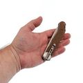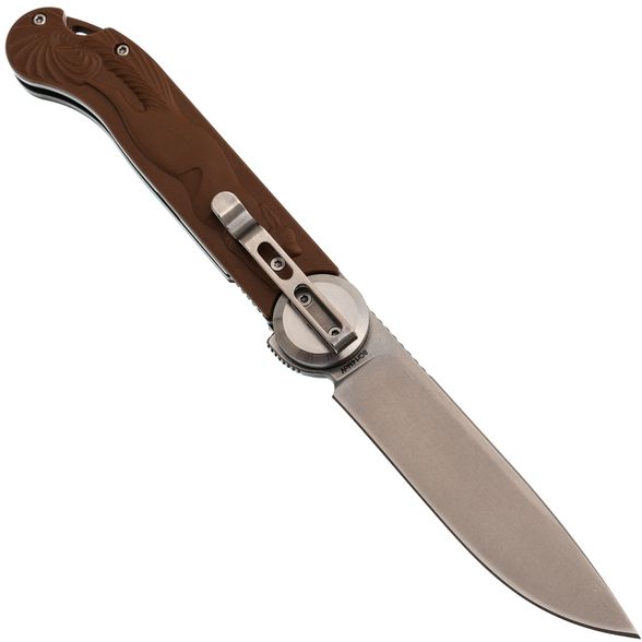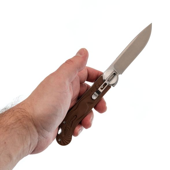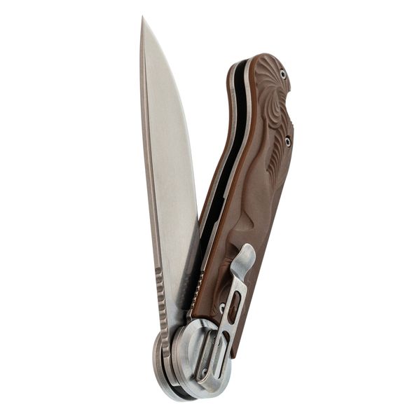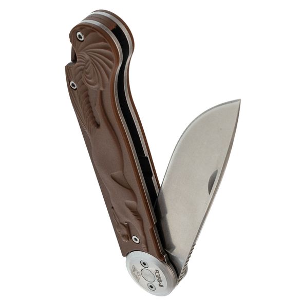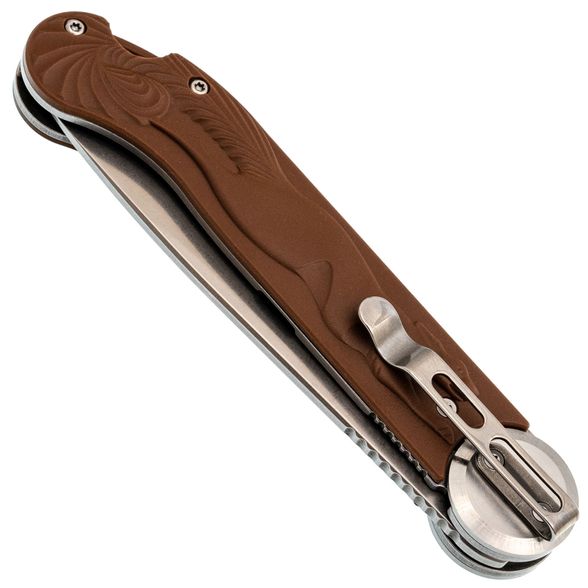 Рукоять сочетает нержавеющую сталь и FRN, накладки имеют коричневый цвет, создавая винтажный облик, напоминающий о деревянных рукоятях старых ножей. Рельефное изображение белки придаёт модели уникальность. Осевой узел оснащён подшипниками для плавного открывания, а замок Liner-Lock делает работу с ножом более безопасной. Завершает картину широкое отверстие для темляка.