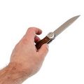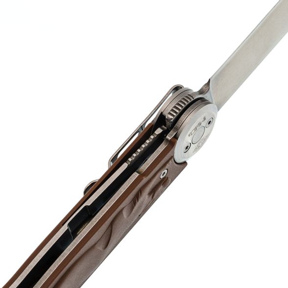 Клинок из стали 8Cr14MoV отличается коррозионной стойкостью, высокой ударной вязкостью и лёгкостью в заточке. Универсальный профиль Drop-Point делает его удобным для различных задач, а высокие прямые спуски обеспечивают хорошую режущую геометрию. Stonewash обеспечивает клинку благородный матовый оттенок и скрывает мелкие царапины от использования. Открыть нож можно флиппером или ногтевым зацепом – в зависимости от предпочтений пользователя.