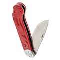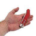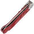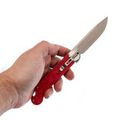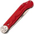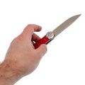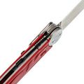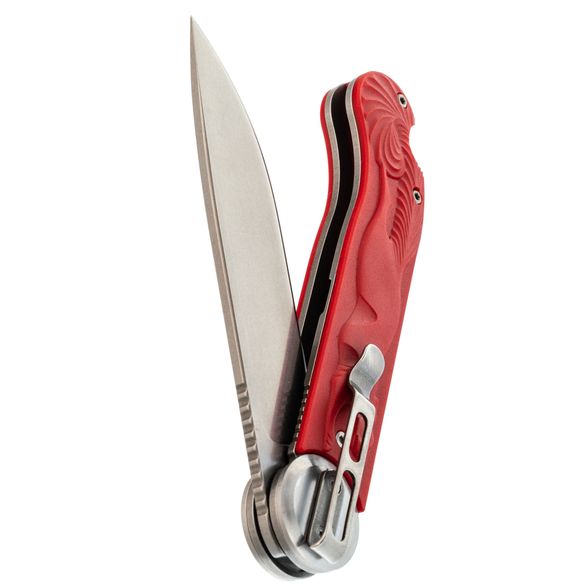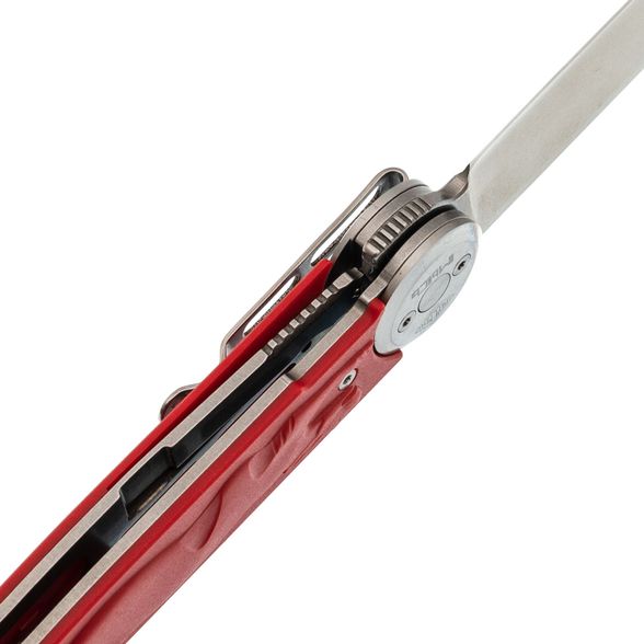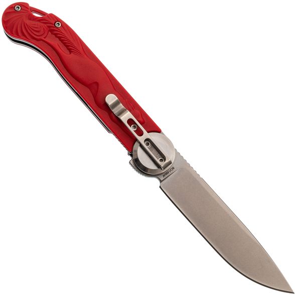 Рукоять Мыси изготовлна из нержавеющей стали с накладками из FRN (стеклонаполненного термопластика). FRN обладает высокой прочностью, устойчивостью к влаге и легкостью, а в сочетании с металлическим каркасом обеспечивает надёжный хват. Красный цвет накладок придаёт ножу яркий, жизнерадостный облик, подчёркивая его связь с исторической моделью. Интересная деталь – текстура накладок, на которых изображена белка в прыжке, отсылающая к названию модели. В осевом узле использованы подшипники, обеспечивающие плавное и быстрое раскрытие клинка. Замок Liner-Lock отвечает за безопасность в использовании, а широкое темлячное отверстие позволит владельцу украсить нож темляком по своему вкусу.