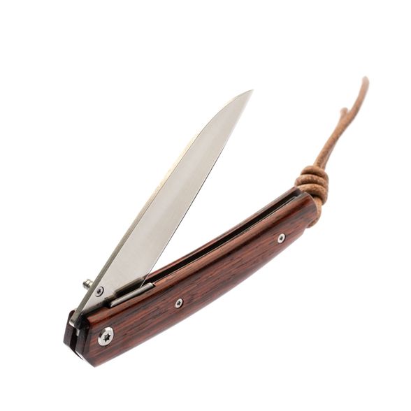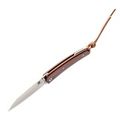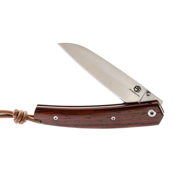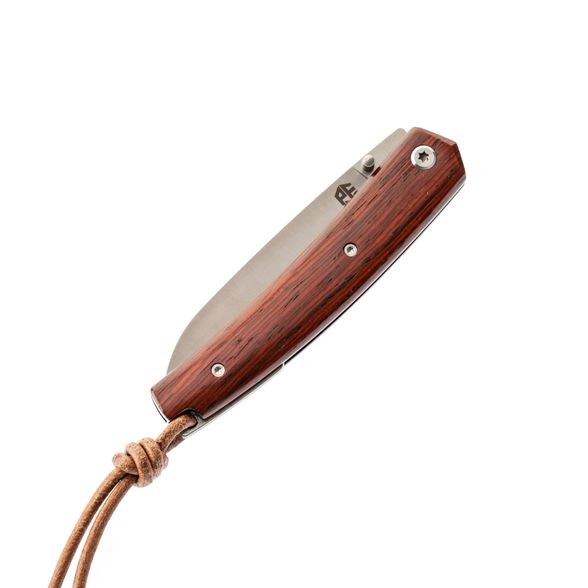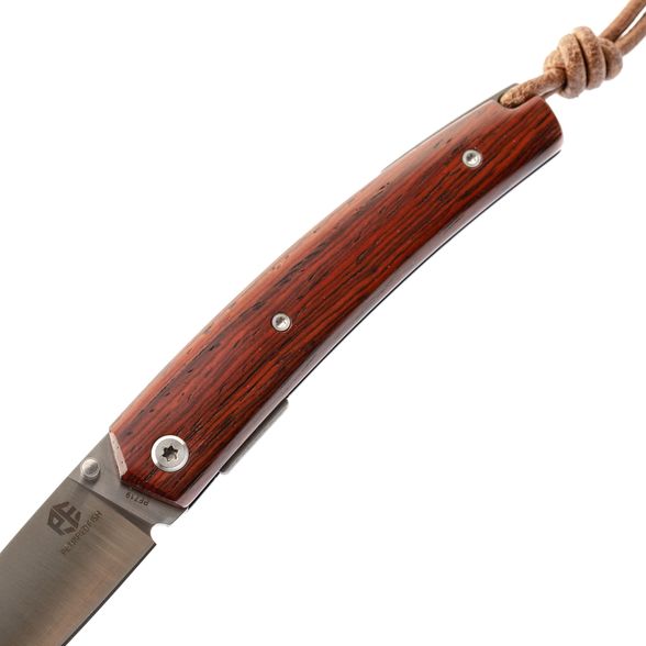 Складной нож Petrified Fish 719 - модель с тонким клинком, предназначенная для EDC-использования. Лезвие изготовлено из стали Sandvik 12C27, его длина составляет 85 мм, а максимальная толщина у обуха - всего 1,5 мм. Рукояти в данной модели выполнена в виде полированных накладок из сандалового дерева, прикрученных винтами к стальным лайнерам. Для фиксации клинка нож Petrified Fish PF 719 оснащен системой Liner Lock, для раскрытия используется флип с односторонним шпеньком под правую руку. На торце рукояти расположен бекспейсер с темлячным отверстием и вставленным в него кожаным темляком.