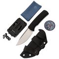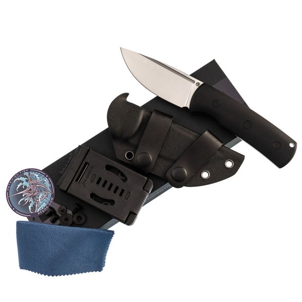 Туристический аксессуар продается в комплекте с чехлом ножнами из натуральной кожи с дополнительными удерживающими лямками на металлических кнопках. Также имеется пластиковое крепление на пояс, набор винтов, протирочный материал и фирменная эмблема производителя.