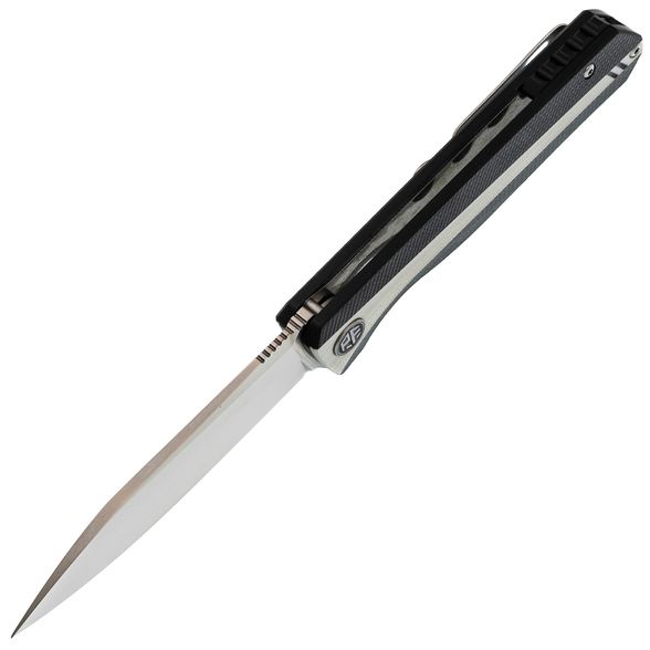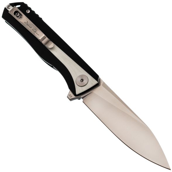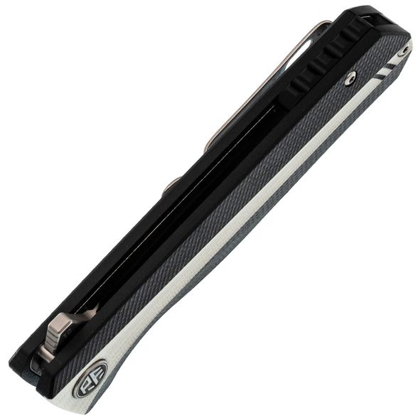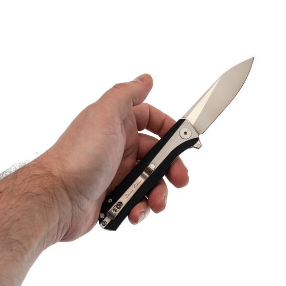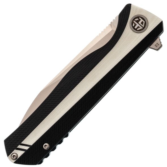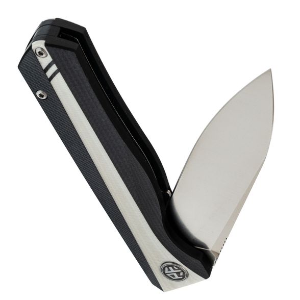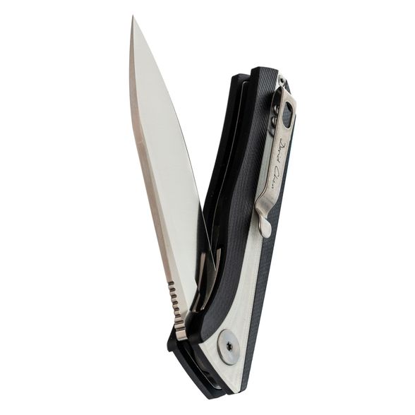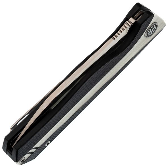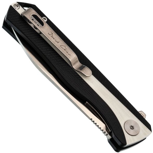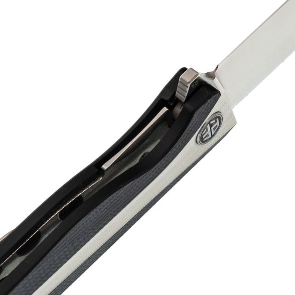 Рукоять выполнена из стеклотекстолита G10 — прочного, устойчивого к влаге и механическим воздействиям материала. Он не скользит в руке, не боится перепадов температур и химического воздействия, благодаря чему он отлично подходит для универсальных ножей. Форма рукояти нейтральная и удобная, обеспечивающая комфортный хват. Надёжность конструкции дополняет замок Liner-Lock, фиксирующий клинок при раскрытии. Для удобного ношения предусмотрена карманная клипса, а декоративная белая вставка придаёт модели аккуратный внешний вид.