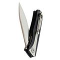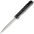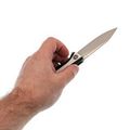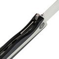 Клинок выполнен в классической форме Drop-Point с высокими прямыми спусками, что обеспечивает отличные режущие характеристики. Сталь D2 отличается высокой износостойкостью и продолжительное время сохраняет остроту, уменьшая необходимость в частой заточке. Механика открытия построена на плавнике флиппера, который обеспечивает моментальное извлечение клинка из рукояти.
