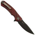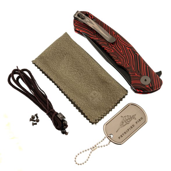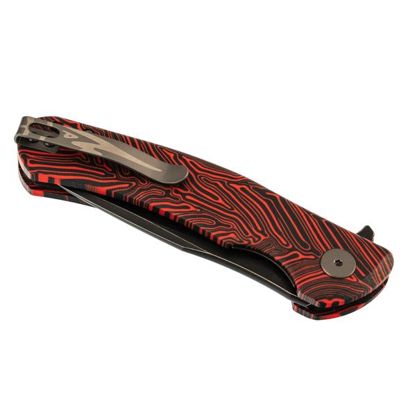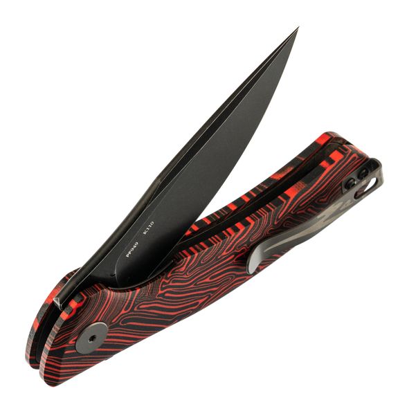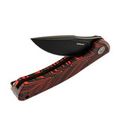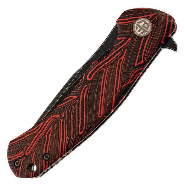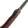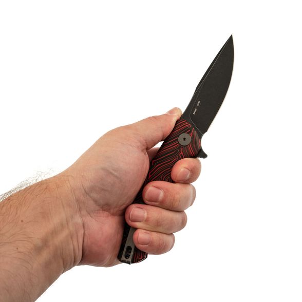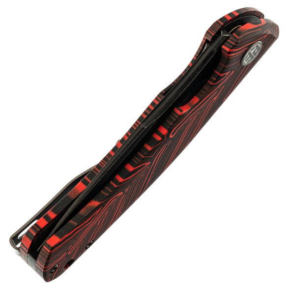 Рукоять, изготовленная из G10, привлекает внимание своим уникальным внешним видом. Слоистая структура придает рукояти стильный и современный вид, а красно-черные цвета делают ее визуально яркой и запоминающейся. G10 - это не только красивый, но и практичный выбор, поскольку материал обладает высокой прочностью и устойчивостью к влаге. Такая рукоять надежно и комфортно лежит в руке, обеспечивая уверенное использование ножа в любых условиях. Этот нож - идеальное сочетание функциональности и привлекательного дизайна.