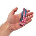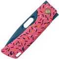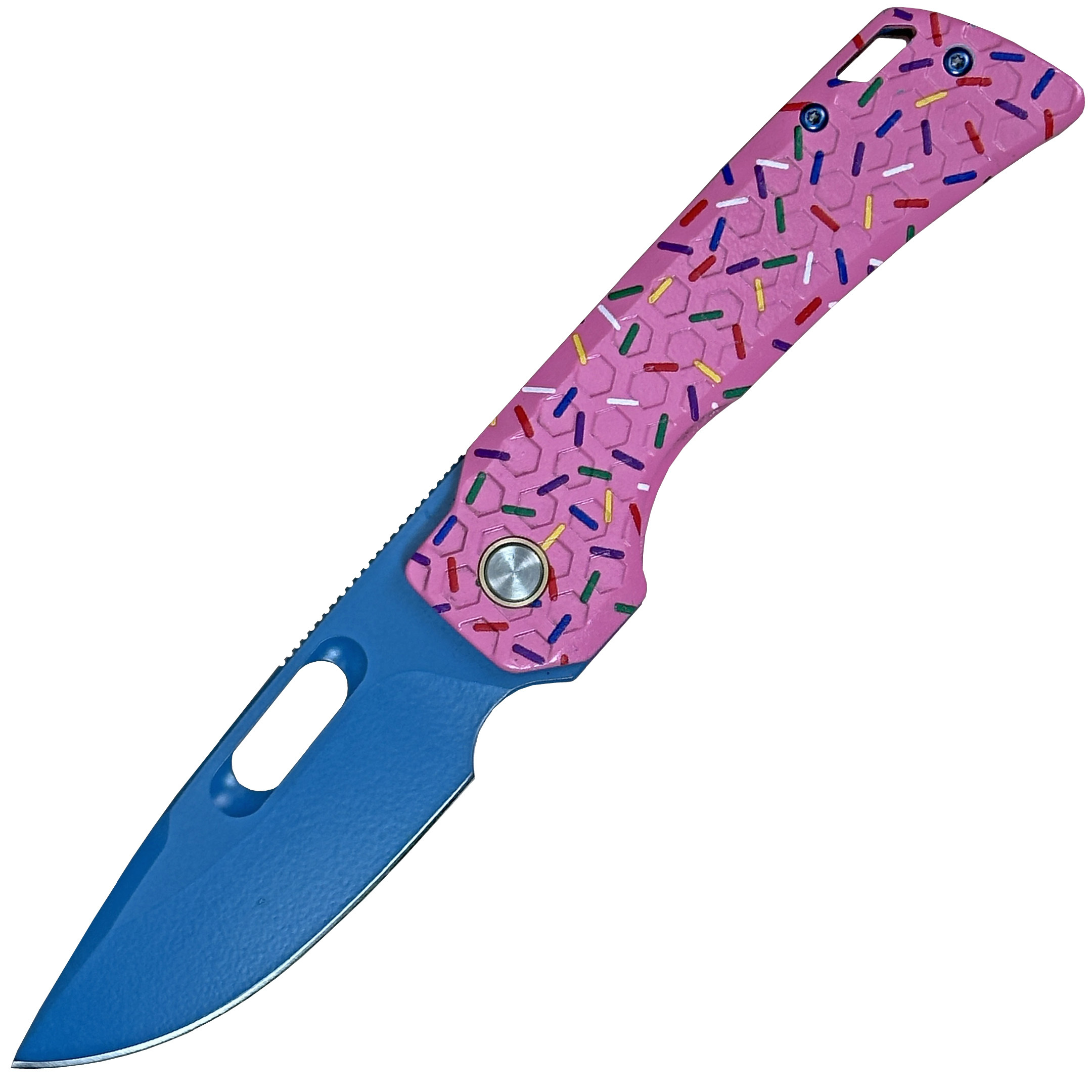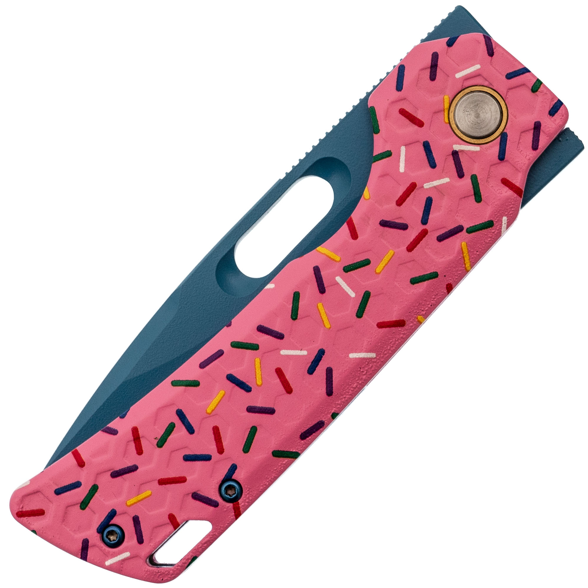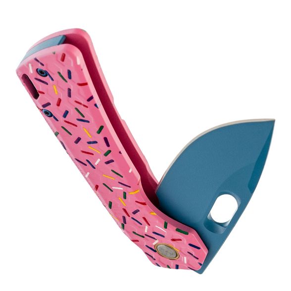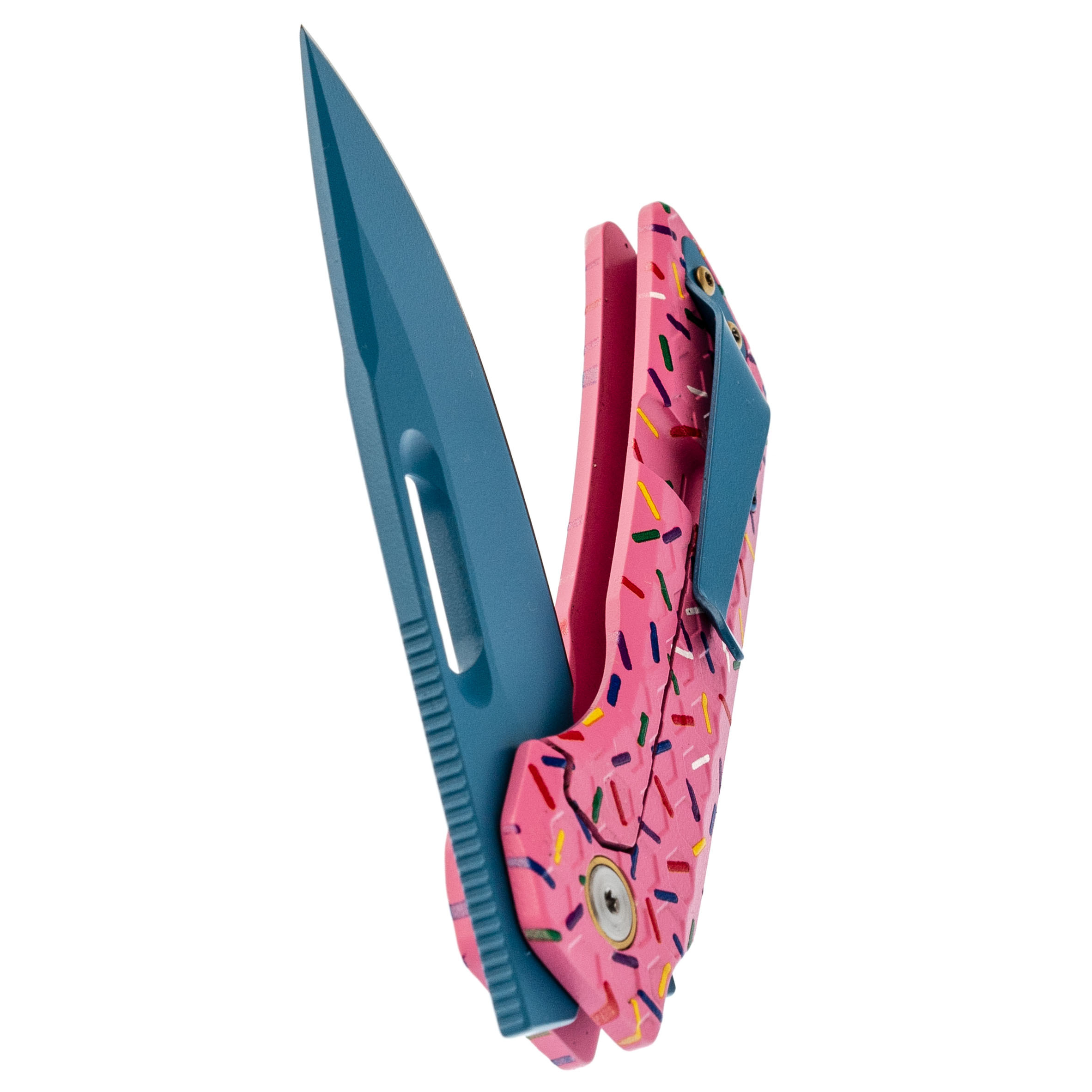 Этот складной нож - вариант для тех, кто хочет универсальный рабочий инструмент, но не готов мириться со скучной внешностью. Голубой клинок и розовая "пончиковая" рукоять создают настроение, а внутри это вполне серьёзный EDC для повседневных задач дома, в офисе и на выездах. Средние габариты и продуманная эргономика позволяют спокойно носить его каждый день и использовать по делу, а не только любоваться яркой расцветкой.