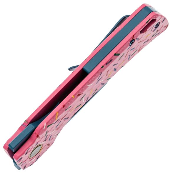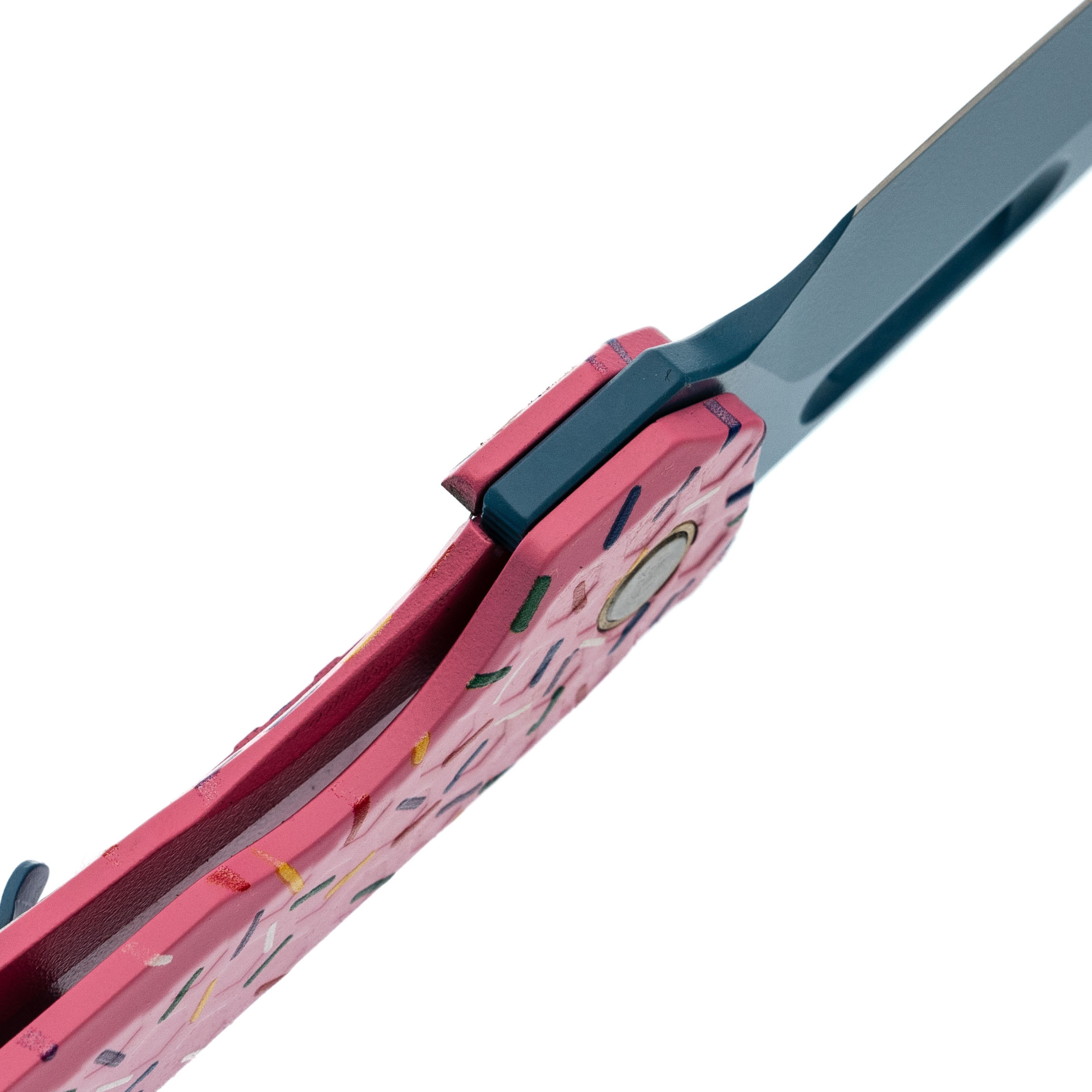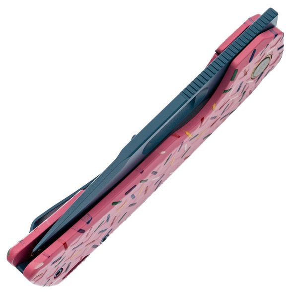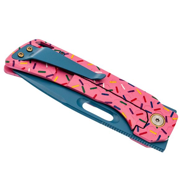Стальная рукоять с "сладкой" пончиковой расцветкой хорошо запоминается и выделяет нож среди привычных тёмных складников. При этом форма продумана для комфортного хвата: граней достаточно, чтобы рука не скользила, но ничего не впивается в ладонь. Надёжный Frame-Lock отвечает за фиксацию клинка в рабочем положении, а карманная клипса делает ношение удобным - нож аккуратно сидит на краю кармана и всегда под рукой, когда он нужен по делу.