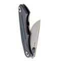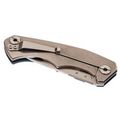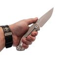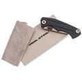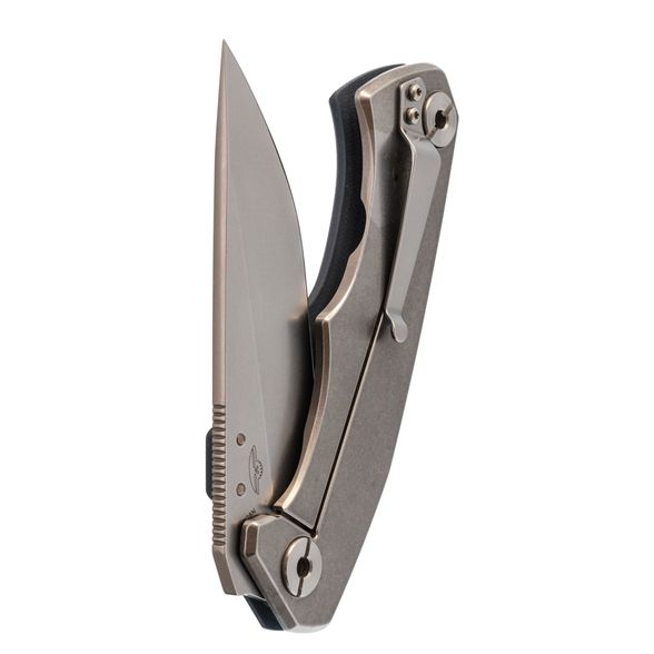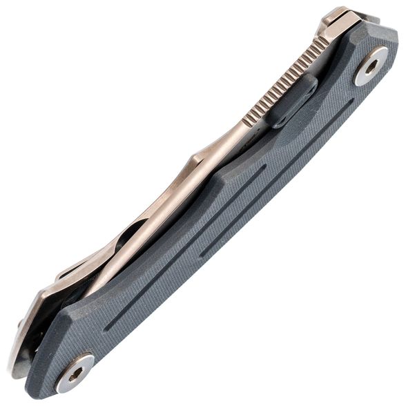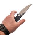 Клинок выполнен из стали 14C28N, эта сталь славится своей высокой ударной вязкостью, отличным сопротивлением коррозии и простотой заточки. Спуски у ножа высокие и прямые, это даёт ему хороший рез, при этом 3.5 мм даёт надёжность, достаточную для большинства задач в городе. Ещё одним интересным решением в ноже является небольшая разгранка режущей кромки как на ножах танто. В работе этого не будет заметно, но есть возможность переточить режущую кромку у кончика на более толстый угол для грубых работ.