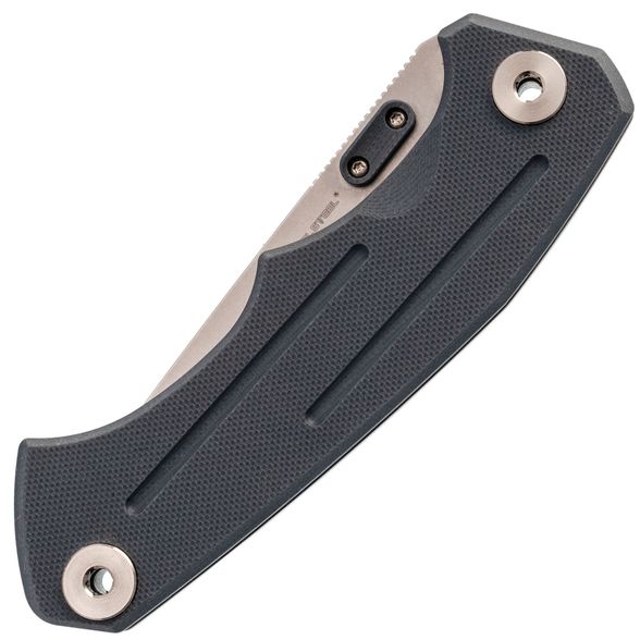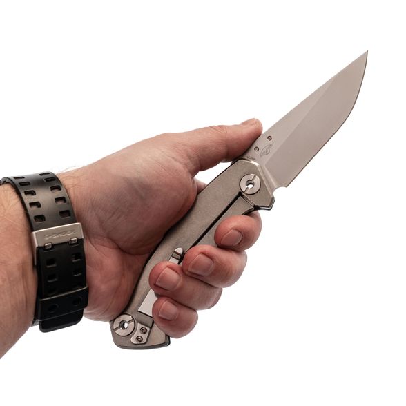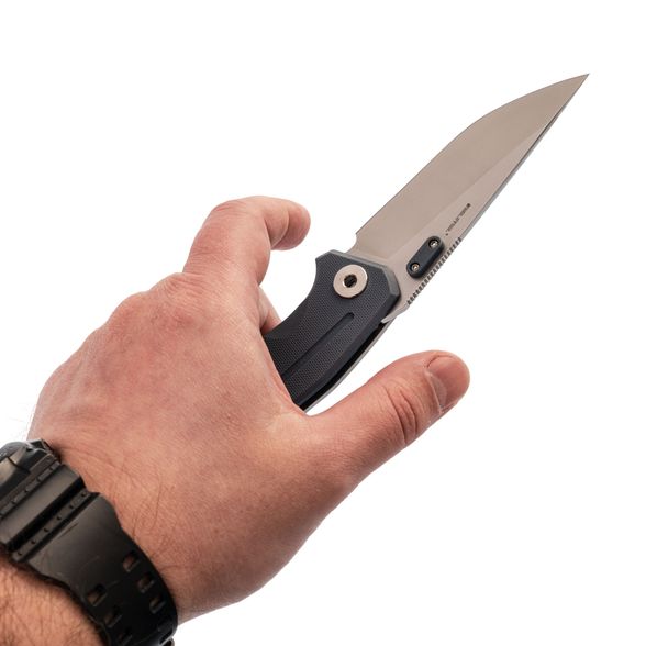 Рукоять ножа состоит из двух частей: с одной стороны накладка из стеклотекстолита G10 - прочный материал, который не боится воды, перепадов температур и прочих условий окружающей среды. С другой стороны плашка из стали с замком Frame-Lock. Такое сочетание обеспечивает ножу высокую надёжность. Форма рукояти имеет ощутимый изгиб и две большие подпальцевые выемки, за счет чего в руке лежит просто прекрасно, особенно в фехтовальном хвате.
