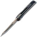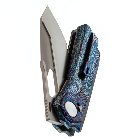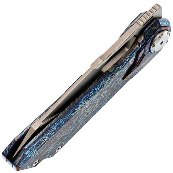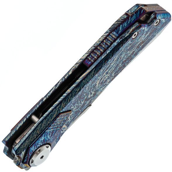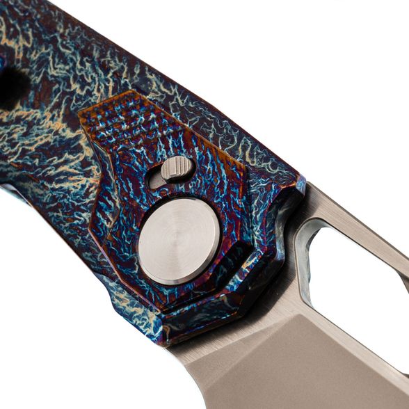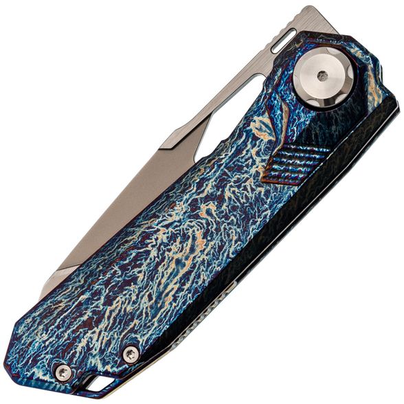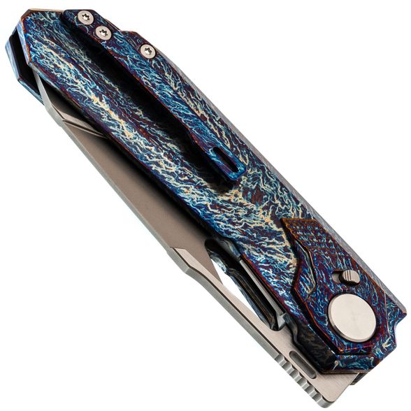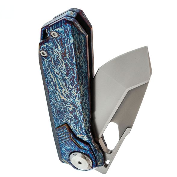 Рукоять ножа выполнена из титана, отличающегося малым весом, высокой прочностью и устойчивостью к коррозии. Поверхность рукояти обработана финишем, создающим рисунок, напоминающий молнии, что придаёт каждому экземпляру уникальную текстуру. В конструкции используется замок Liner-Lock, обеспечивающий надёжную фиксацию клинка, а осевой узел ножа также выполняет роль кнопки, что позволяет безопасно закрывать клинок — это сочетание механики Liner-Lock и Button-Lock. Нож оснащён цельнофрезерованной титановый клипсой в цвет рукояти и имеет темлячное отверстие.