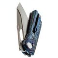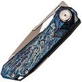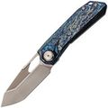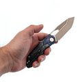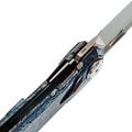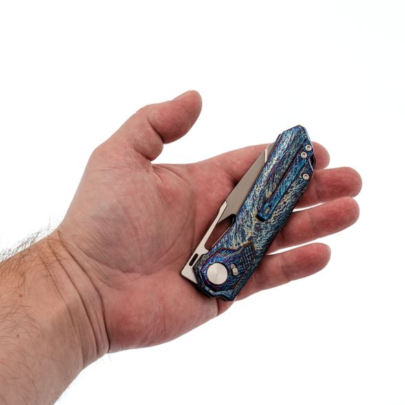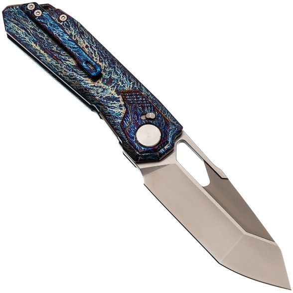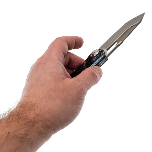 Клинок изготовлен из стали M390, обладающей высокой износостойкостью и устойчивостью к коррозии, что обеспечивает продолжительное удержание остроты. Особый ручной финиш, напоминающий эффект перламутрового покрытия, придаёт клинку выразительный внешний вид. Для извлечения клинка предусмотрены отверстие и фронт-флиппер. Профиль Tanto с двумя режущими кромками позволяет использовать разные части лезвия в зависимости от задачи, обеспечивая универсальность реза.
