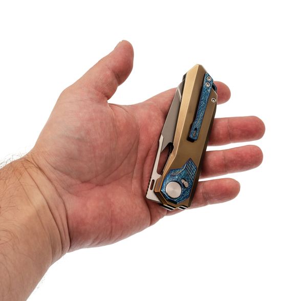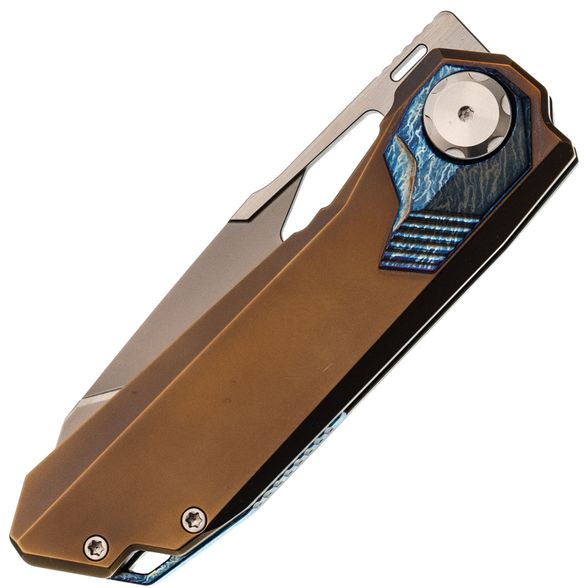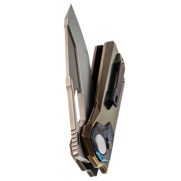 Remette Peregrine Falcon - это не просто складной нож, а результат синтеза премиальных материалов и инженерной мысли. Молодой и перспективный бренд Remette представляет модель, в которой каждая деталь проработана с вниманием к эстетике и функциональности. Уникальный бронзовый анодированный титан рукояти подчёркивает характер ножа: сдержанный, но выразительный. Этот материал не только визуально впечатляет, но и обеспечивает исключительную прочность при минимальном весе, устойчив к коррозии и температурным перепадам.