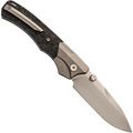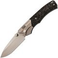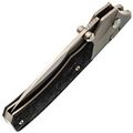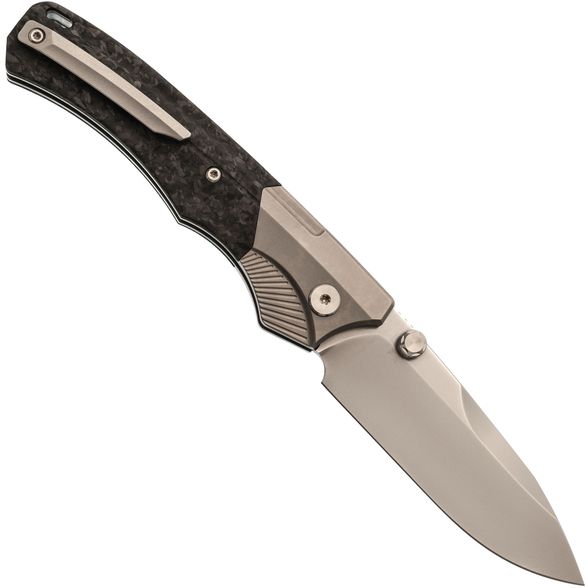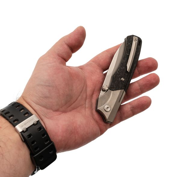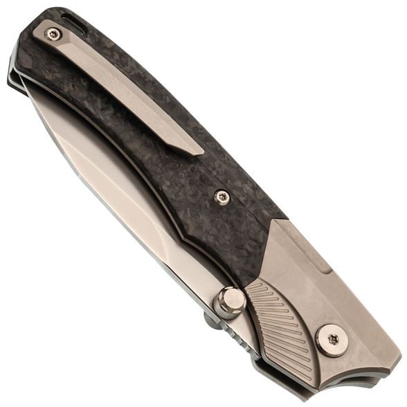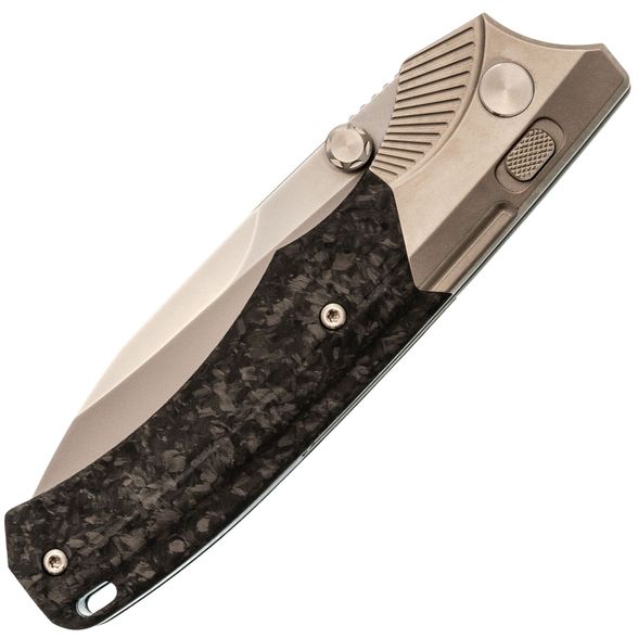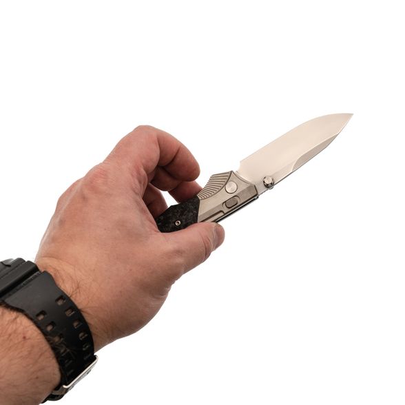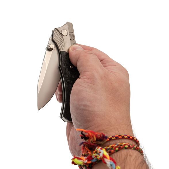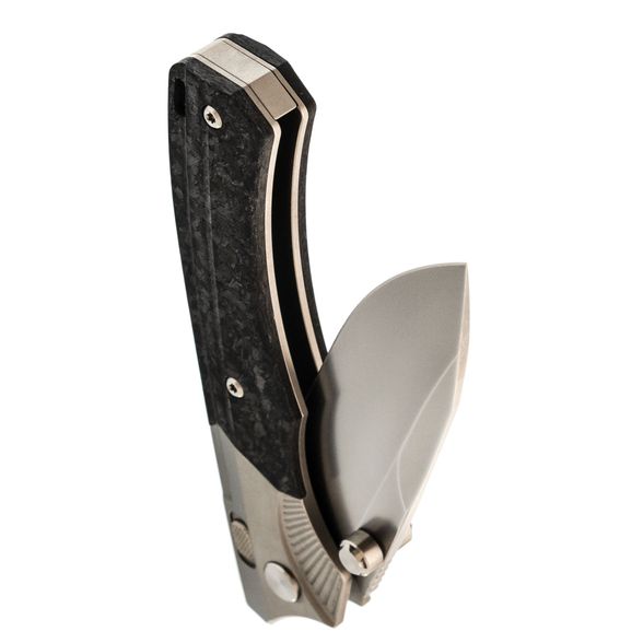 Рукоять ножа WD107 подчеркивает его элегантный внешний вид. Титановые больстеры с насечкой в виде крыльев и накладки из хаотичного карбона придают ножу уникальный стиль. Титановые элементы и карбон - популярный выбор для премиальных ножей благодаря своей легкости, прочности и устойчивости к воздействию окружающей среды. Кнопка замка имеет приятную насечку, обеспечивая надежное сцепление. Рукоять имеет слегка изогнутую форму, что обеспечивает комфортное и надежное удержание ножа в руке.