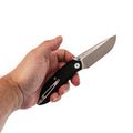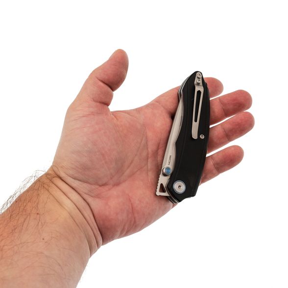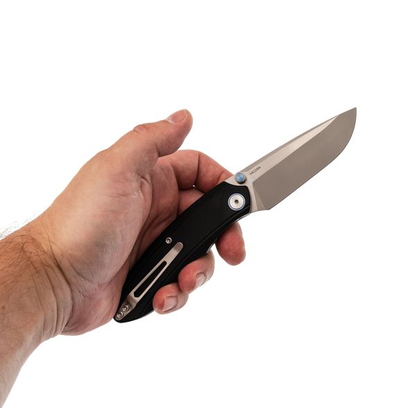 Рукоять тщательно выверена по форме: изгиб повторяет естественное положение кисти, а скруглённые рёбра обеспечивают комфорт даже при длительной работе. Текстурированная поверхность G10 исключает проскальзывание, а клипса позволяет носить нож на кармане или ремне, обеспечивая быстрый доступ. Темлячное отверстие - дополнительная опция для любителей кастомизации и удобства при ношении.