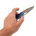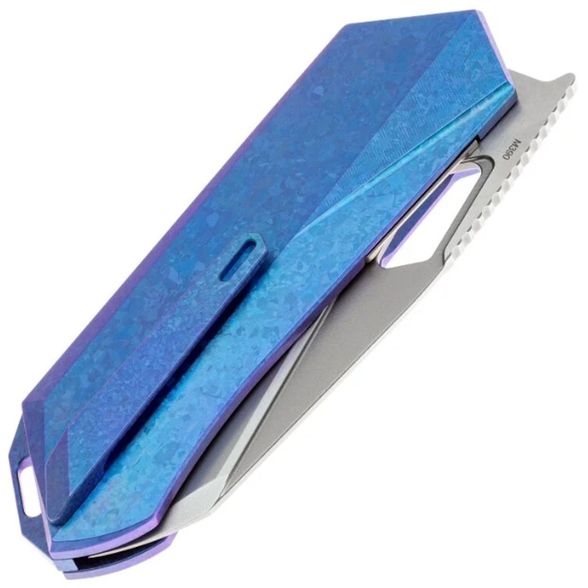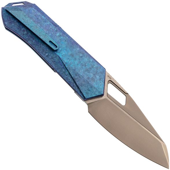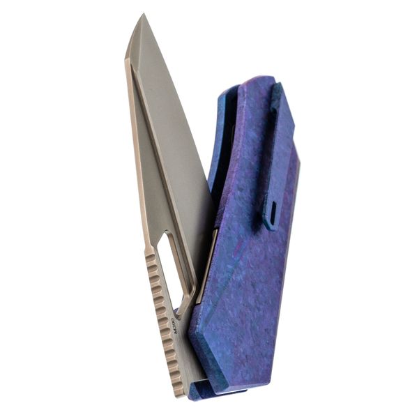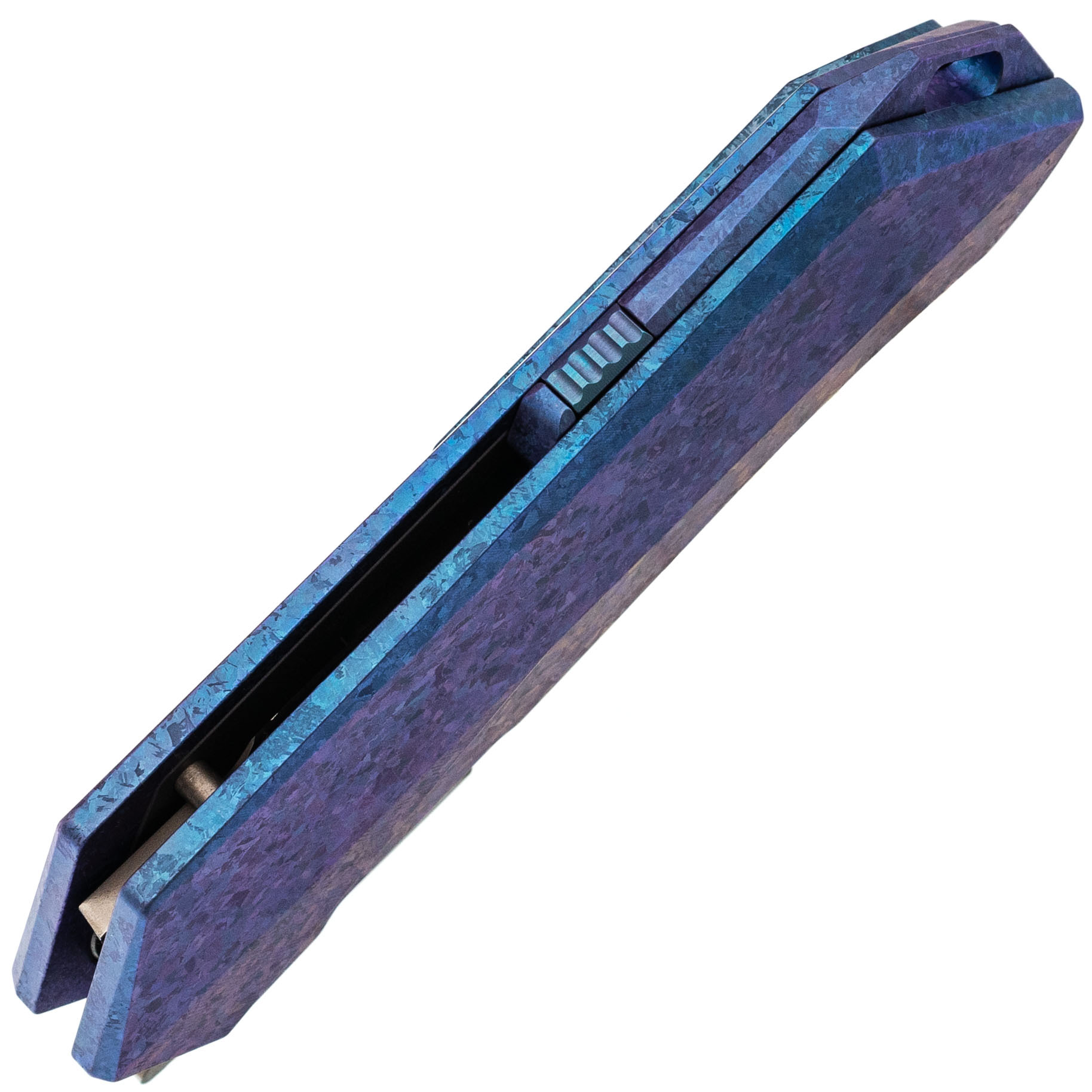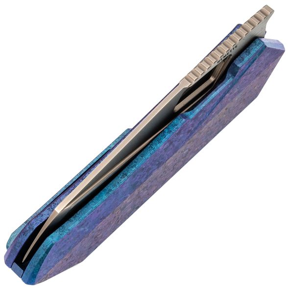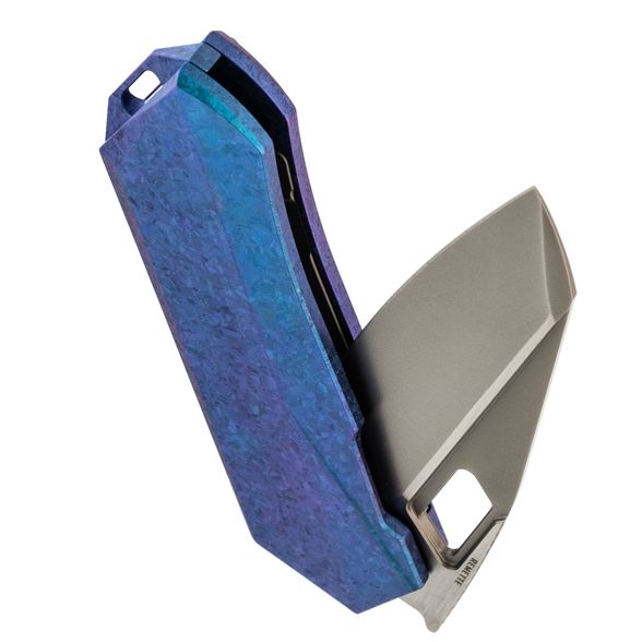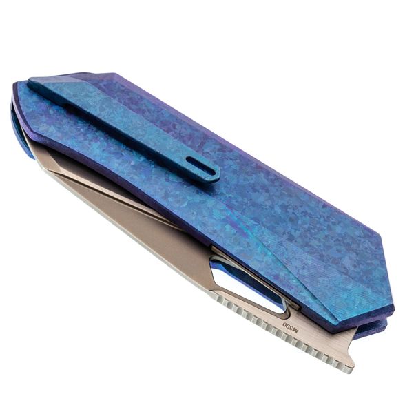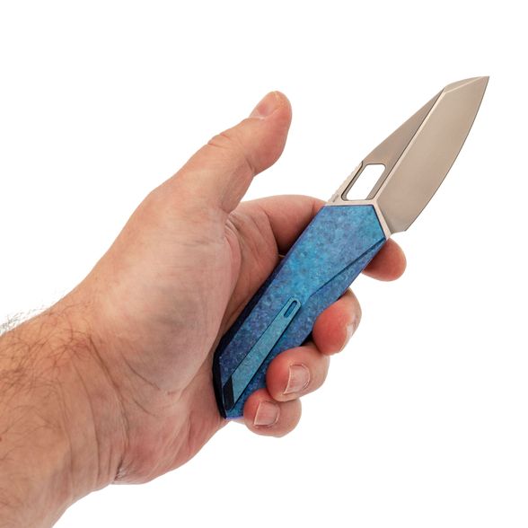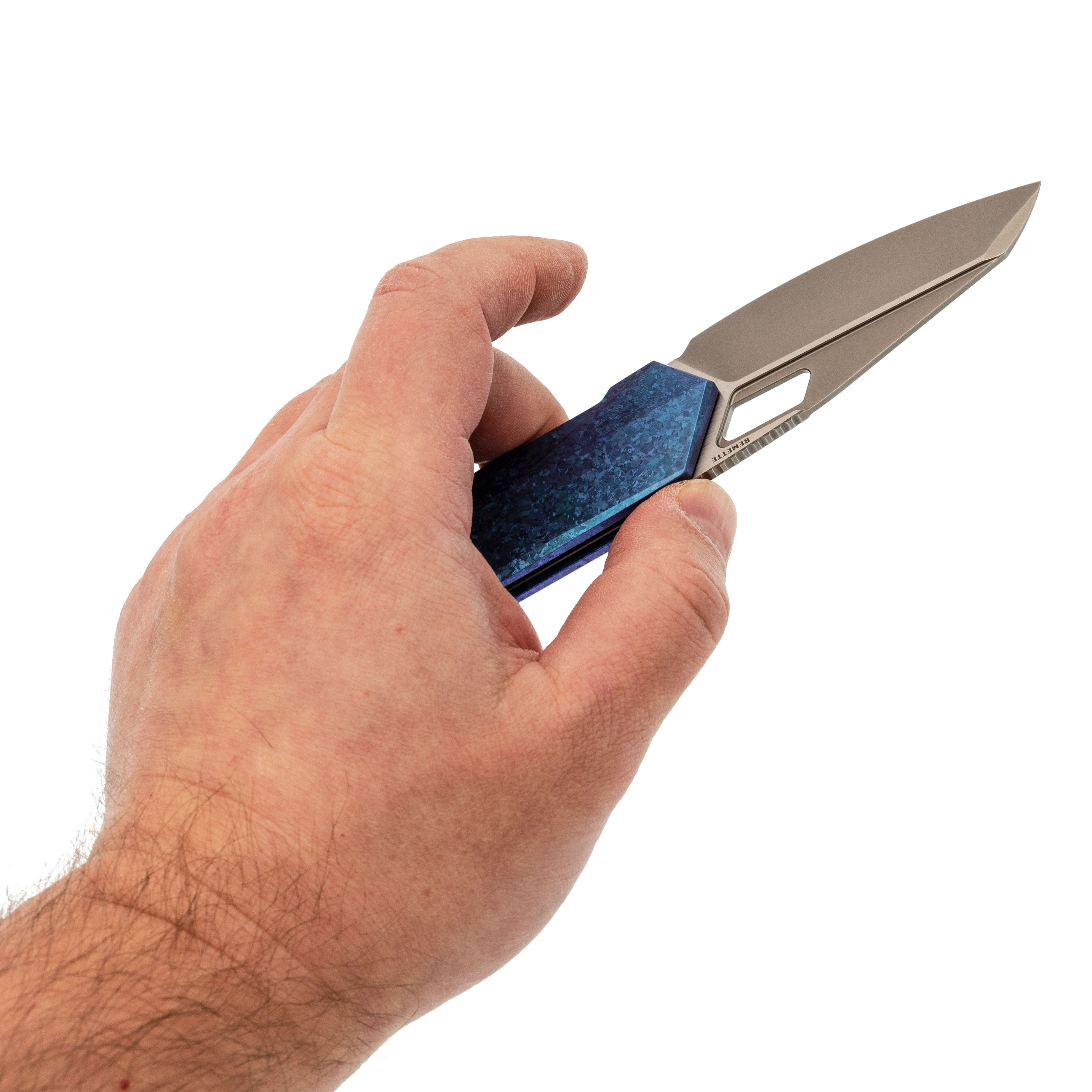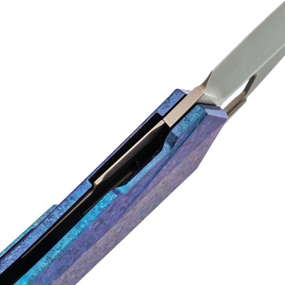 - Титан - легкий и прочный металл, устойчивый к механическим нагрузкам, влаге и температурным перепадам. Использование титана в конструкции рукояти снижает общий вес, повышает долговечность и придает изделию современный внешний вид. Синее анодирование не только подчеркивает стиль, но и повышает устойчивость поверхности к царапинам и истиранию.