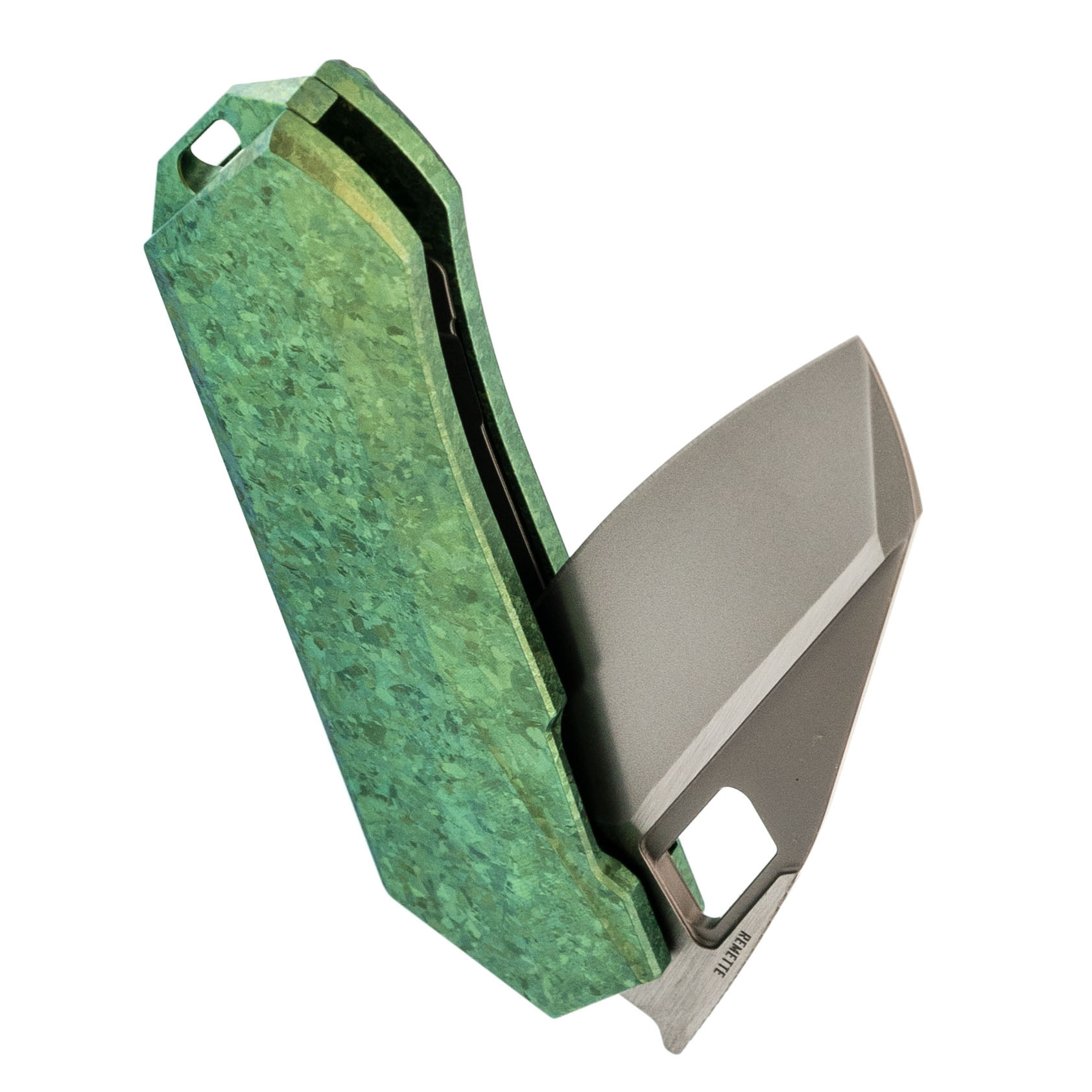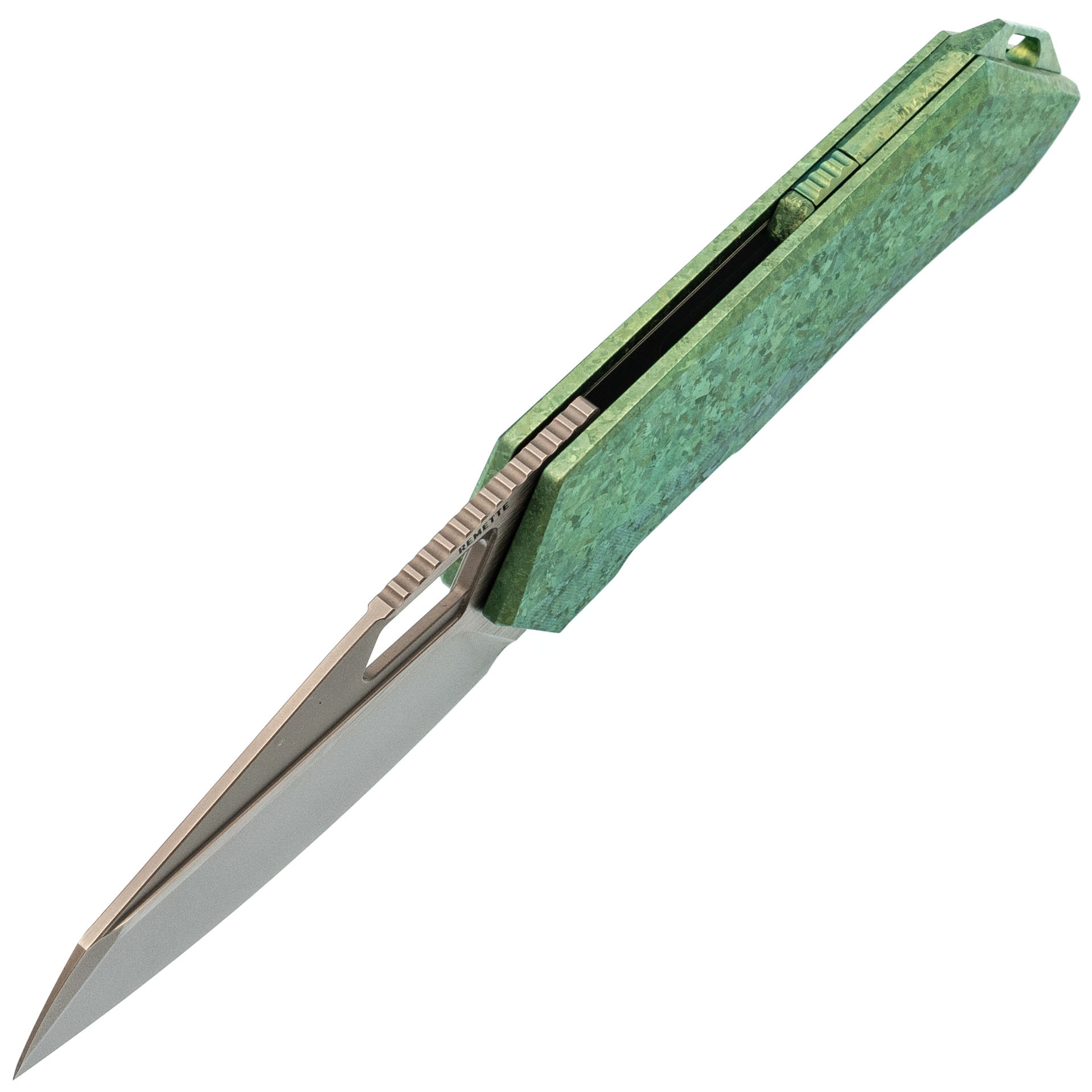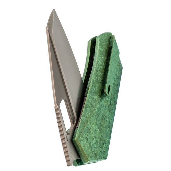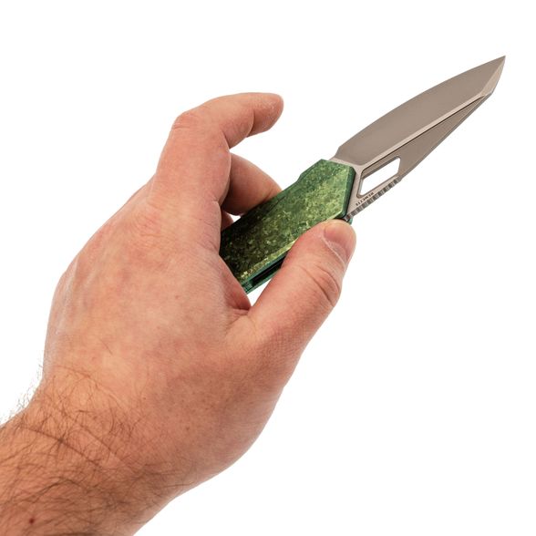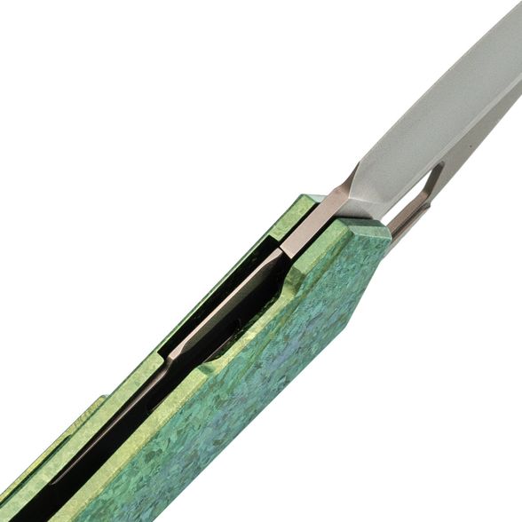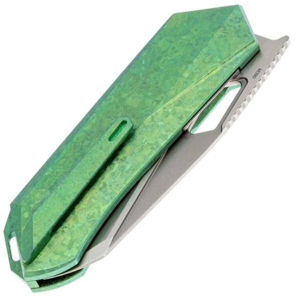 - Титан - прочный и легкий металл, устойчивый к механическим нагрузкам, влаге и температурным перепадам. Применение титана в конструкции рукояти снижает общий вес, повышает долговечность и придает изделию современный внешний вид. Зеленое анодирование не только подчеркивает стиль, но и повышает устойчивость поверхности к царапинам и истиранию.