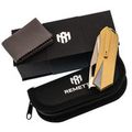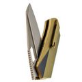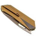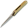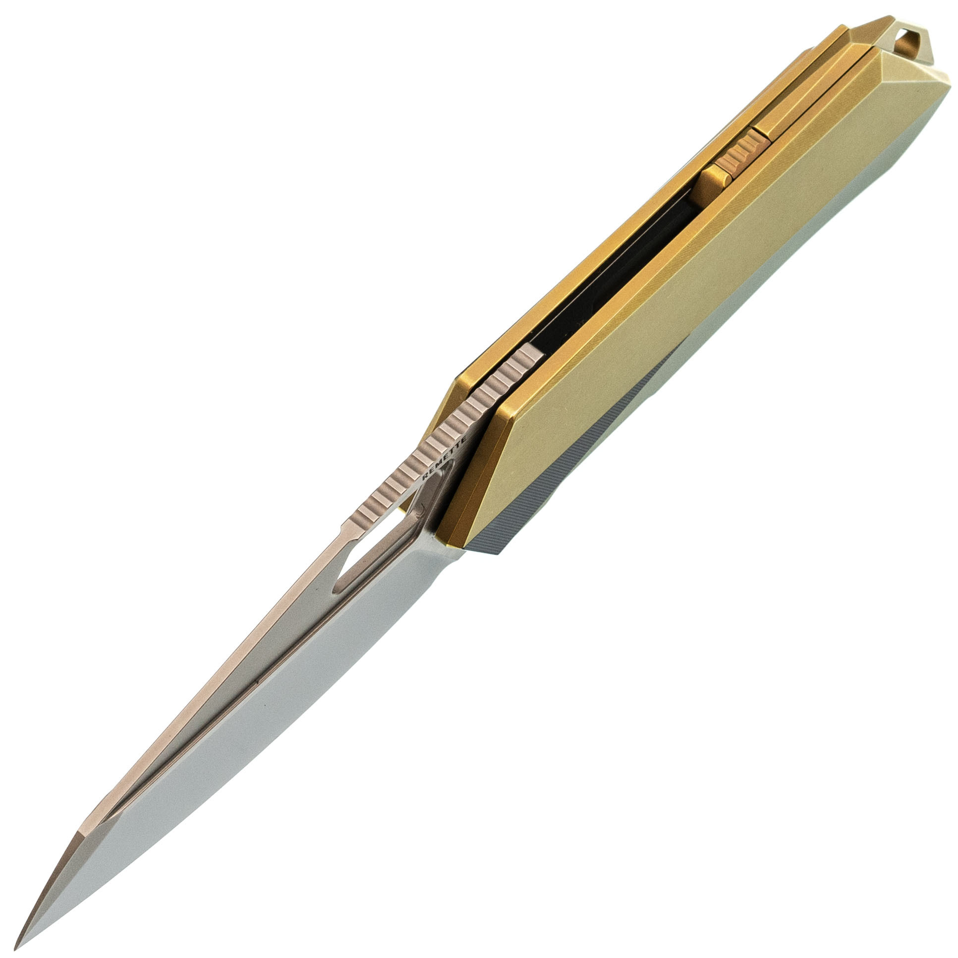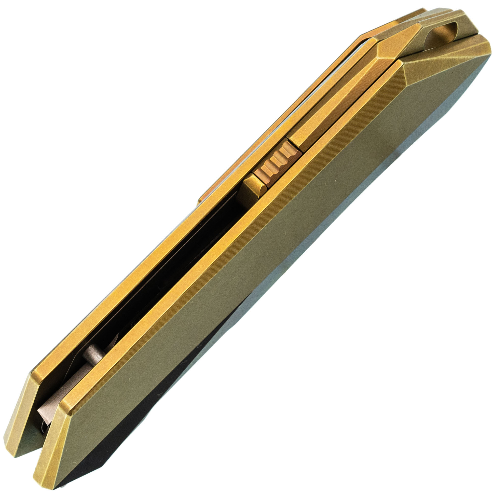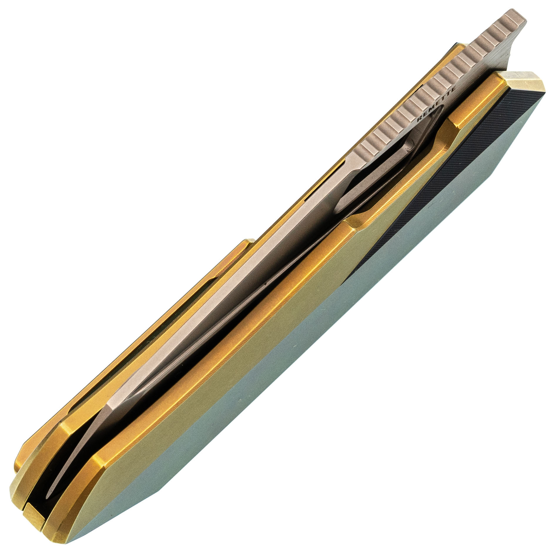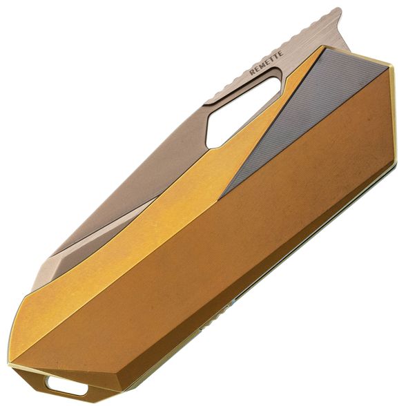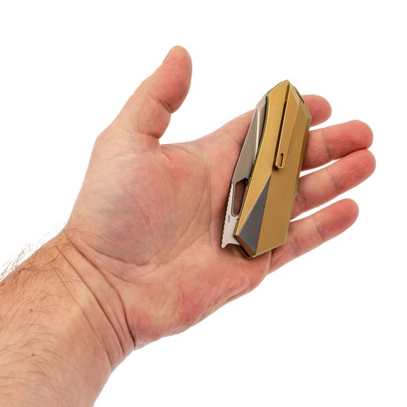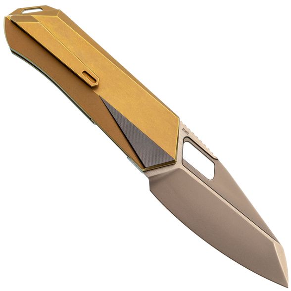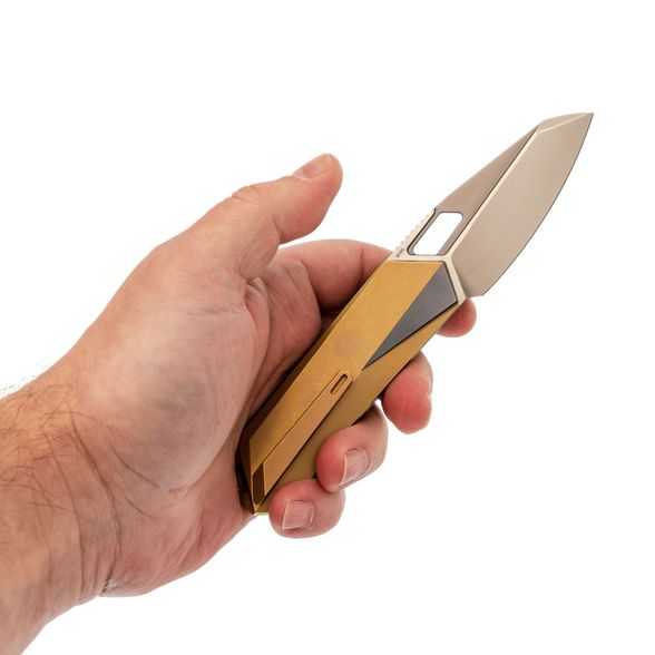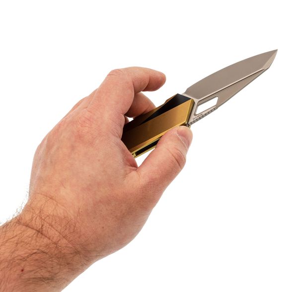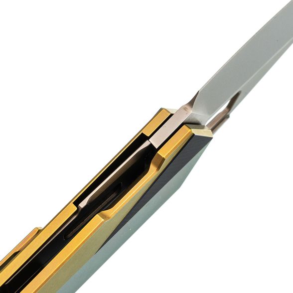 - Титан - легкий и прочный металл, устойчивый к агрессивной среде, механическим нагрузкам и температурным перепадам. Использование титана в конструкции рукояти обеспечивает надежность, снижает общий вес и придает изделию современный внешний вид. Золотистое анодирование не только подчеркивает стиль, но и повышает устойчивость поверхности к царапинам и истиранию.