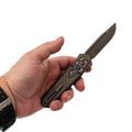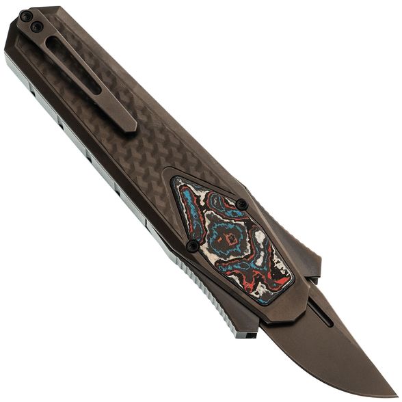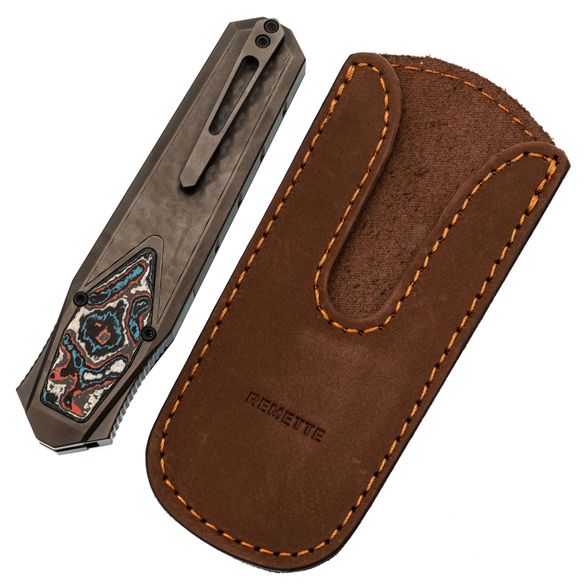 Рукоять Remette Swordfish изготовлена из титана, что гарантирует высокую прочность и долговечность. Декоративная вставка из хаотичного карбона придает ножу уникальный внешний вид и выделяет его среди других моделей. Рукоять имеет текстурированную поверхность с насечками, обеспечивая надежный хват и комфорт при использовании. Этот нож не только функциональный инструмент, но и стильный аксессуар, который будет привлекать внимание любителей качественных и необычных ножевых изделий.