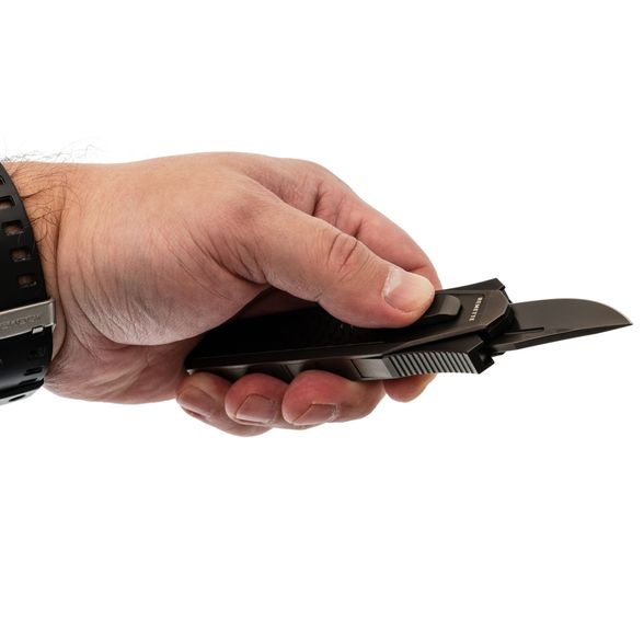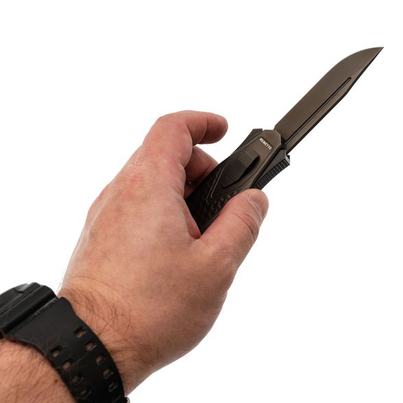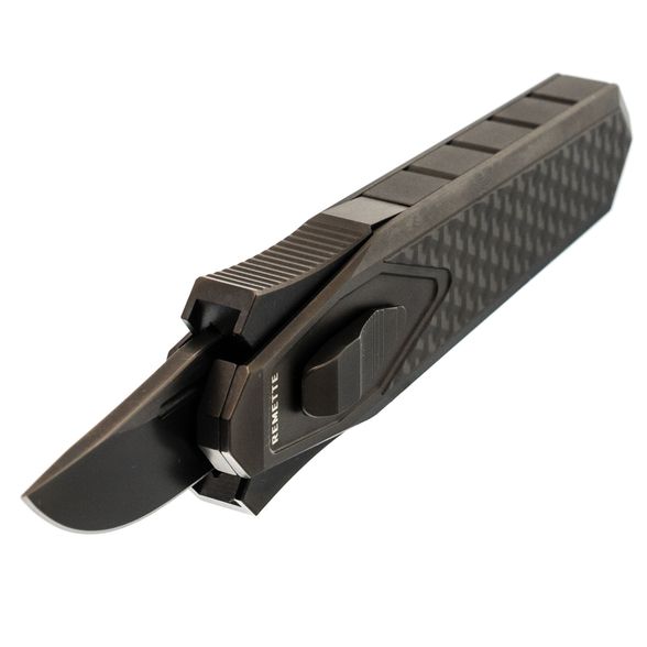 Remette Swordfish - это уникальный и инновационный складной фронтальный нож, который привлекает внимание своей необычной конструкцией. Главная особенность ножа заключается в оригинальном механизме открытия: для раскрытия клинка необходимо нажать на скользящую кнопку и сделать легкий взмах рукой, что обеспечивает быстрый и плавный процесс открытия. Клинок надежно фиксируется в открытом и закрытом положении благодаря двум пружинам, расположенным на торцах рукояти. Это обеспечивает дополнительную безопасность и удобство при использовании. Кроме того, практически полное отсутствие люфта в механизме является редким преимуществом для фронтальных ножей, делая Remette Swordfish исключительным в своем классе.
