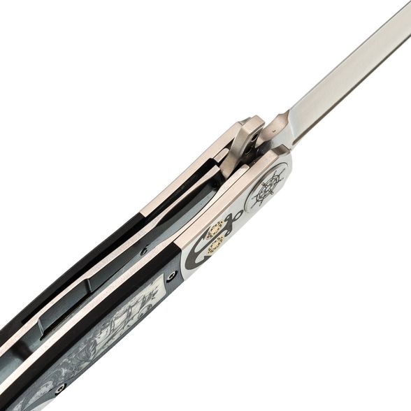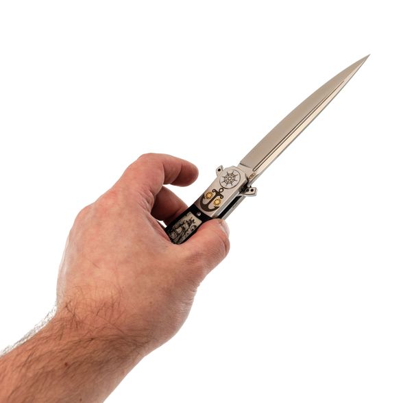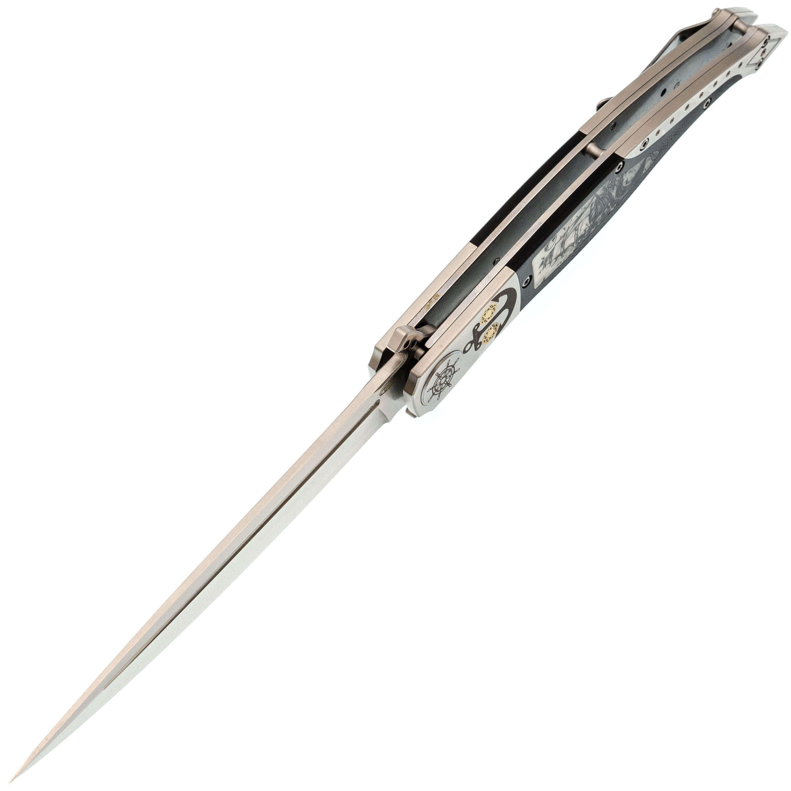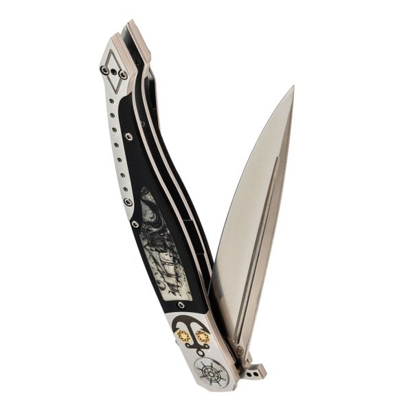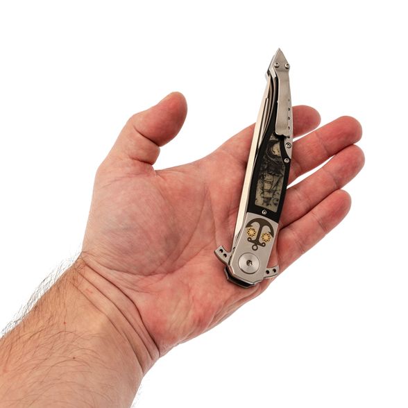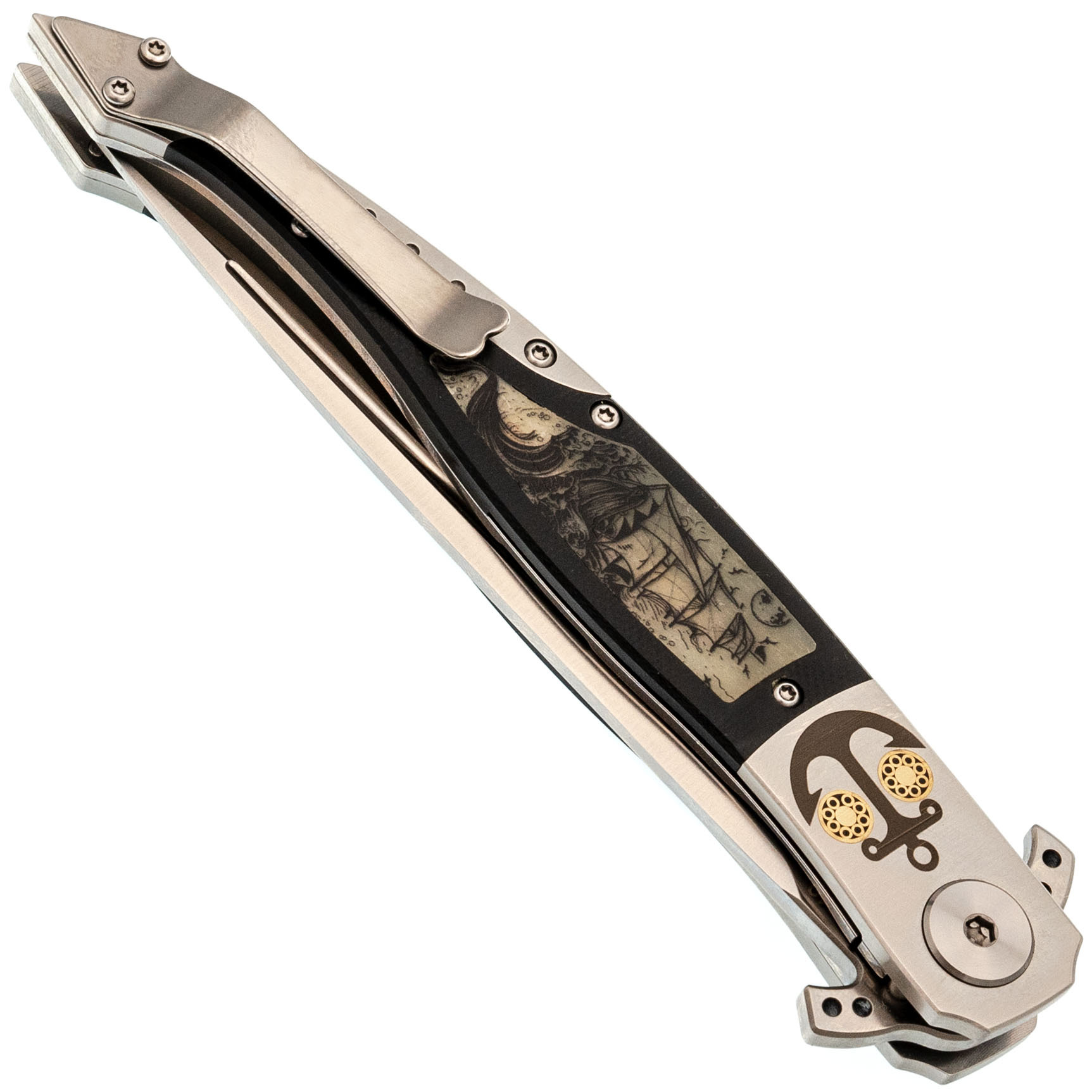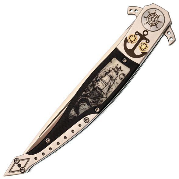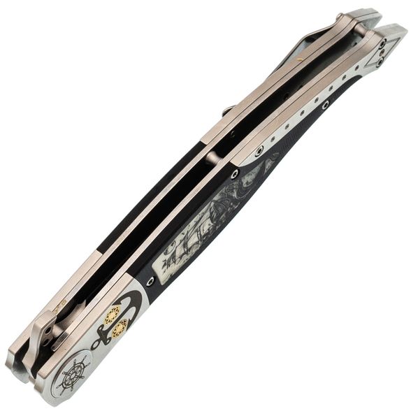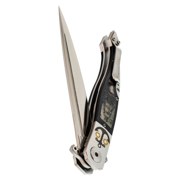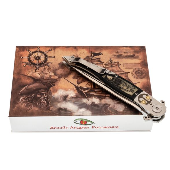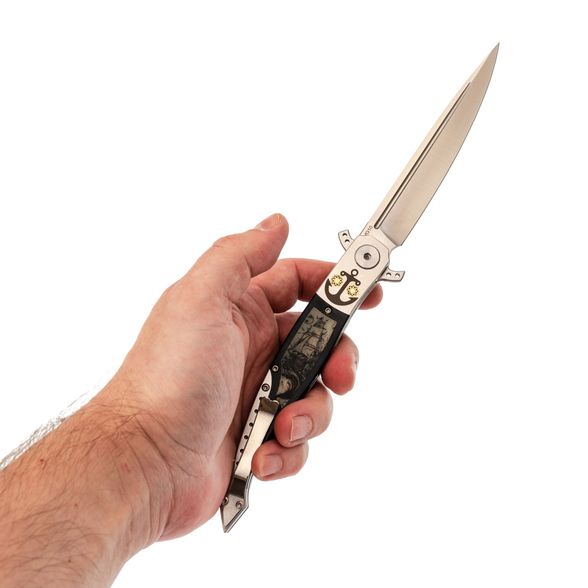 Длинная изогнутая геометрия удобно заполняет ладонь и разгружает пальцы при продолжительном использовании. На плоскостях - множественные рисунки с морской тематикой в паре с костяной вставкой. Получается выразительно, практично и готово к повседневному ношению.