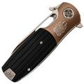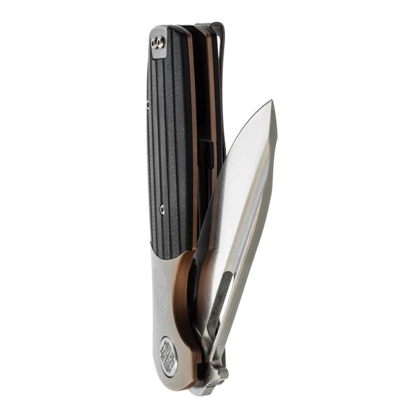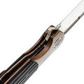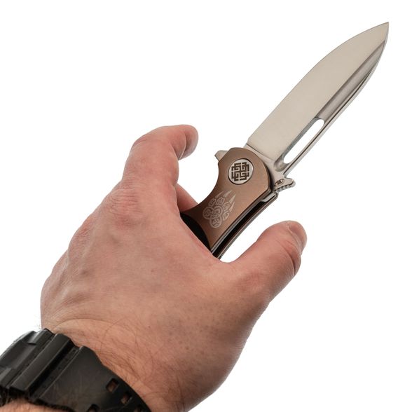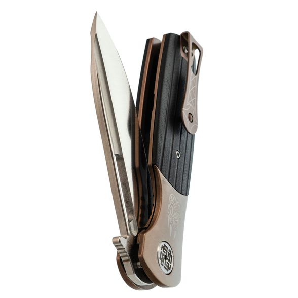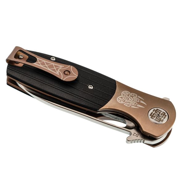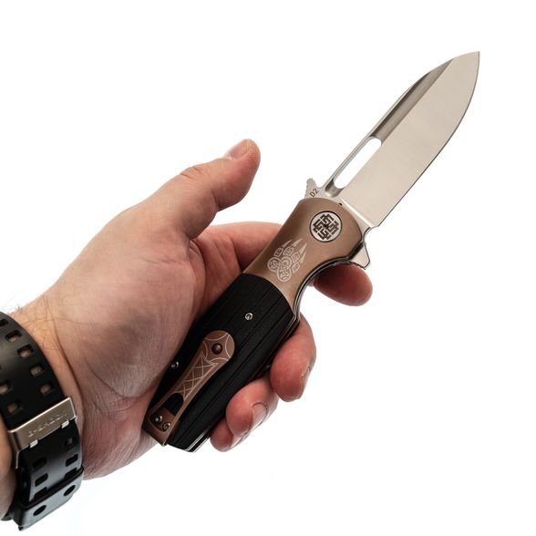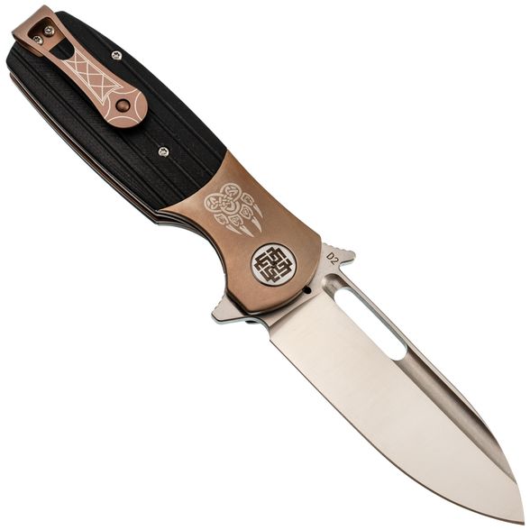 Лезвия из прочной стали D2, которая выдерживает механические нагрузки. Высокая твердость предотвращает возникновение царапин, сколов и вмятин. На клинке имеется в наличии пропил для пальцев или ногтей, за который удобно ухватиться для раскрытия. Мастер наделил носимый аксессуар профилем Drop Point типа перо, который легко проникает в любые материалы. На клинке есть ограничители в виде двух плавников. Для защиты была выполнена механическая обработка и покрытие Satin finish.