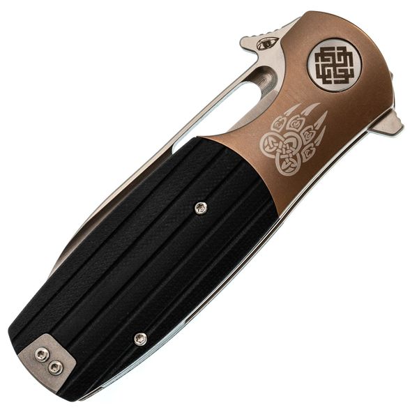 Стилизованной рукояткой. Деталь изготовлена из нескольких вставок из нескольких материалов, скрученных маленькими винтами. Основной материал – G10. Производитель использовал вставки из разных материалов с фирменным изображением. В задней части имеется металлическая деталь на винтах с шестигранными головками. Ручка не выскальзывает даже из мокрых рук.