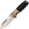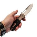 Нож со складным механизмом и лезвием в виде пера. При эксплуатации не создает дискомфорт, а для надежного удержания в руке на рукоятке предусмотрен специальный пропил для пальца. Комбинированная ручка отделана противоскользящим материалом черного цвета, а система открытия снабжена сверхпрочным замком, выдерживающий в том числе, ударные нагрузки, но к категории метательных он не относится.