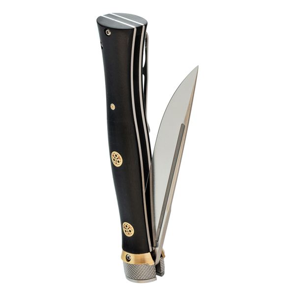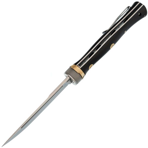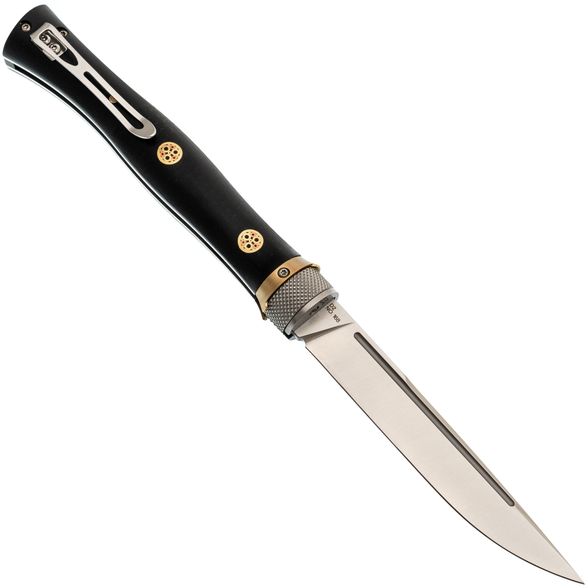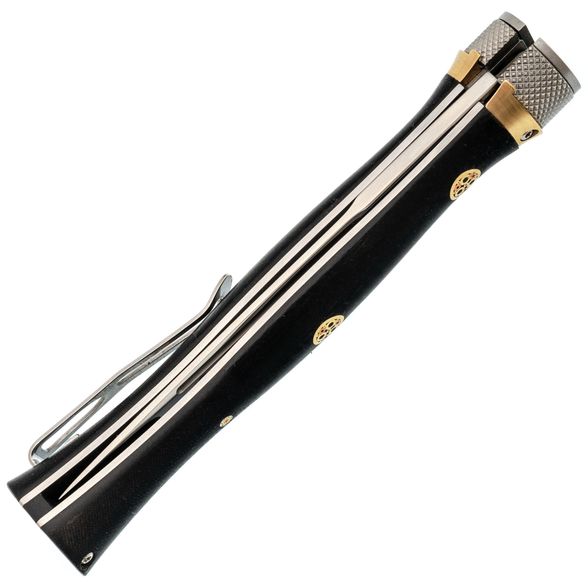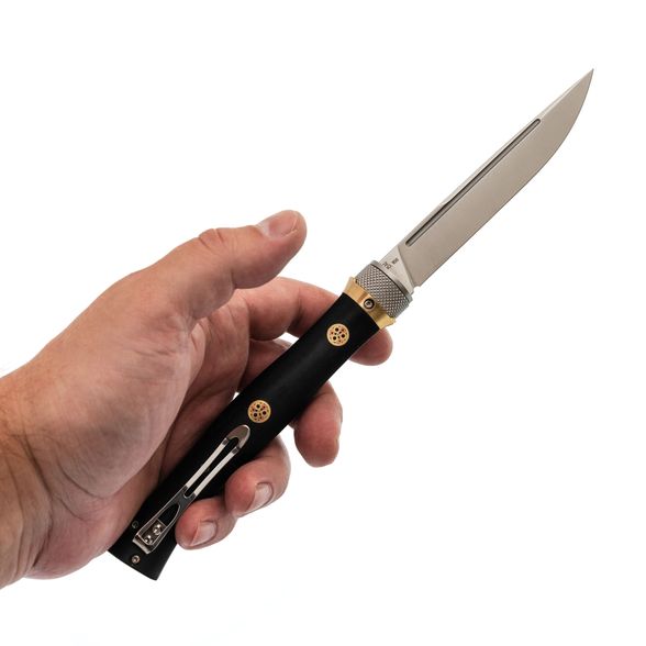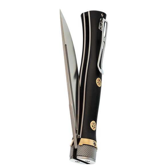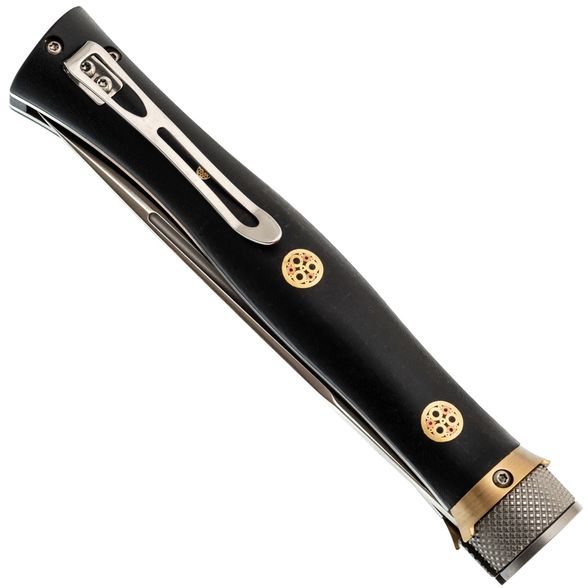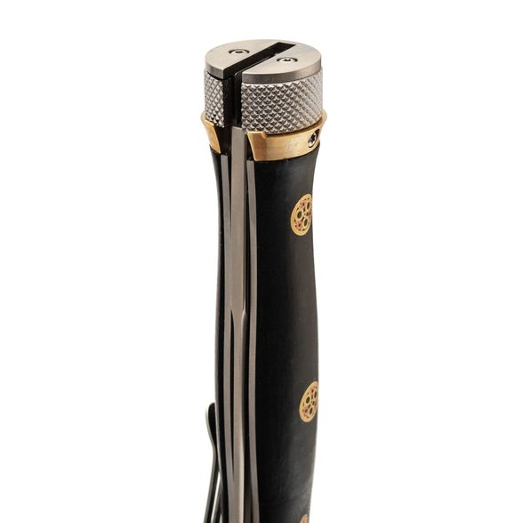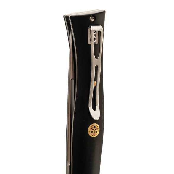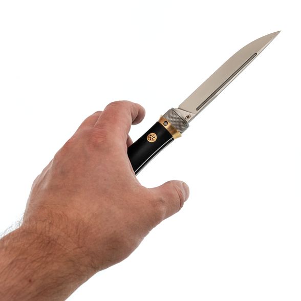 Рукоять ножа арт. Caballero-05 украшена объемными накладками из черного материала G10 и Микарты, придающими ему шарм и изысканность. Замок Viro-Block подчеркивает неторопливый и гордый характер ножа.