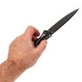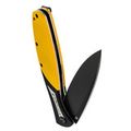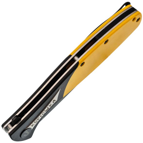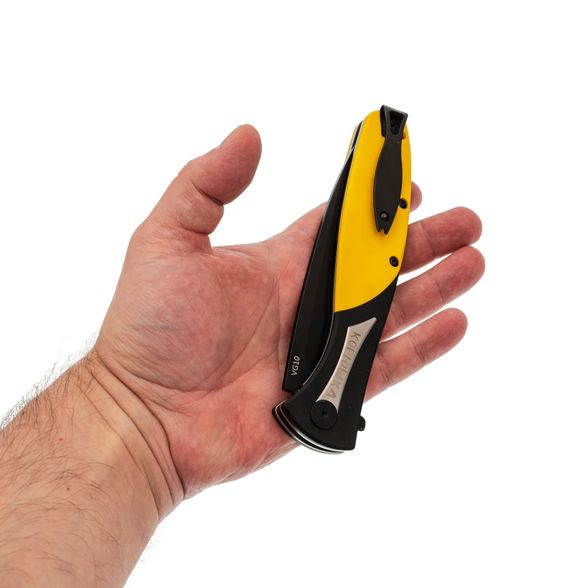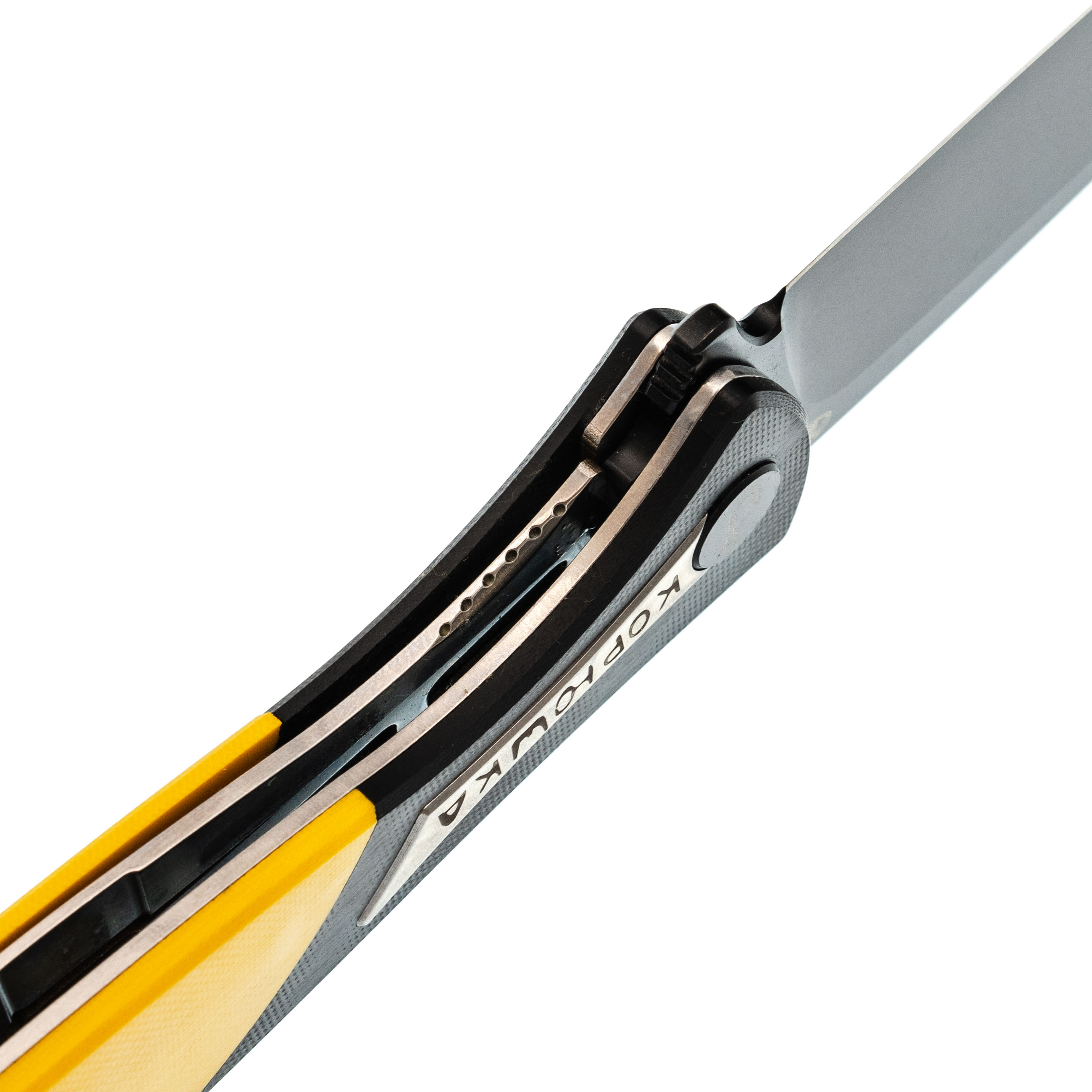 Длина клинка 13 см даёт простор в задачах. Нож уверенно справляется с нарезкой продуктов, подготовкой древесины, строганием и прочей повседневной работой. Профиль Drop-Point универсален и понятен - хорошая линия реза и аккуратный контроль кончика. Флиппер работает чётко, без люфтов и рывков.