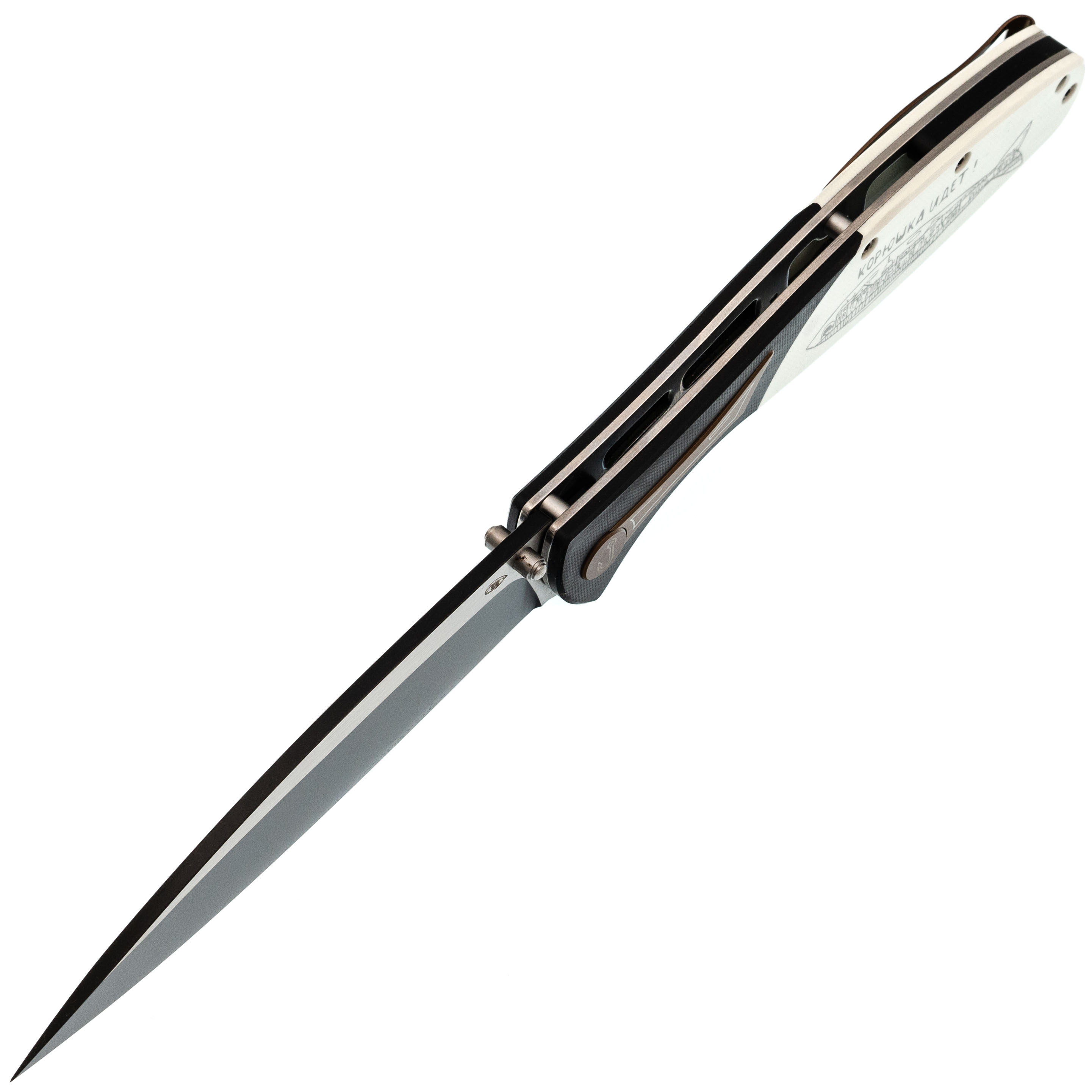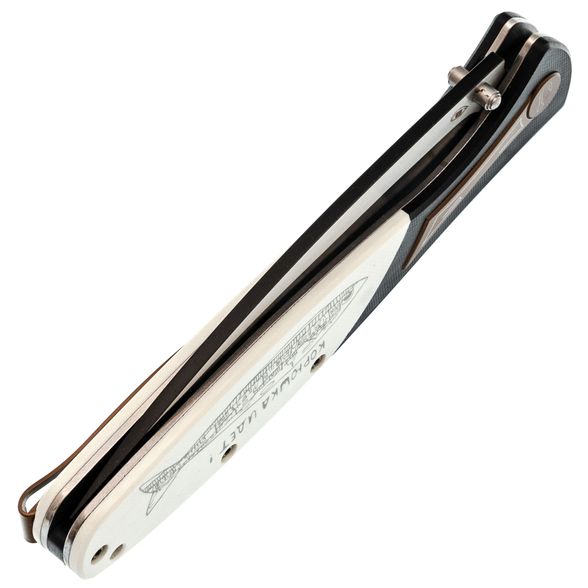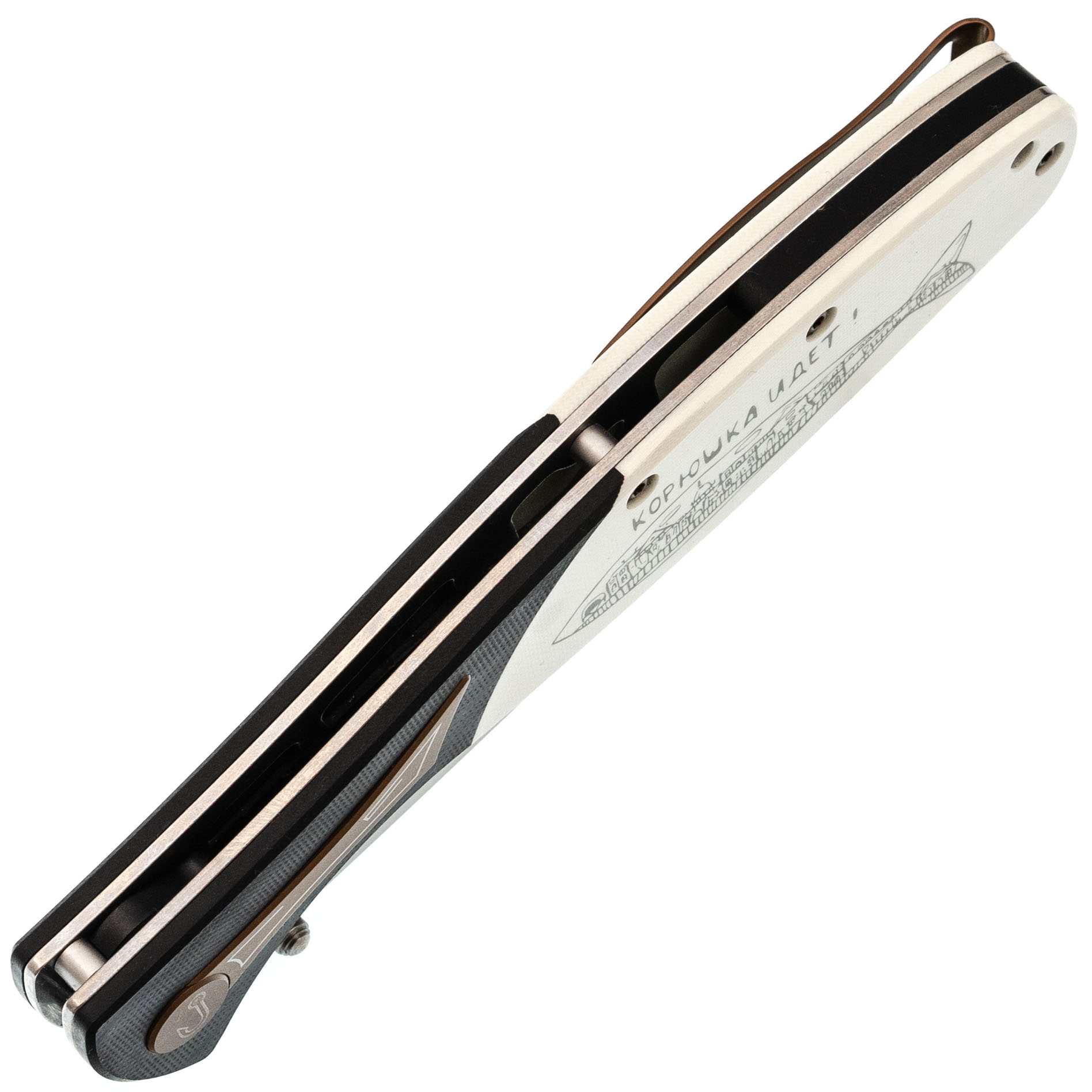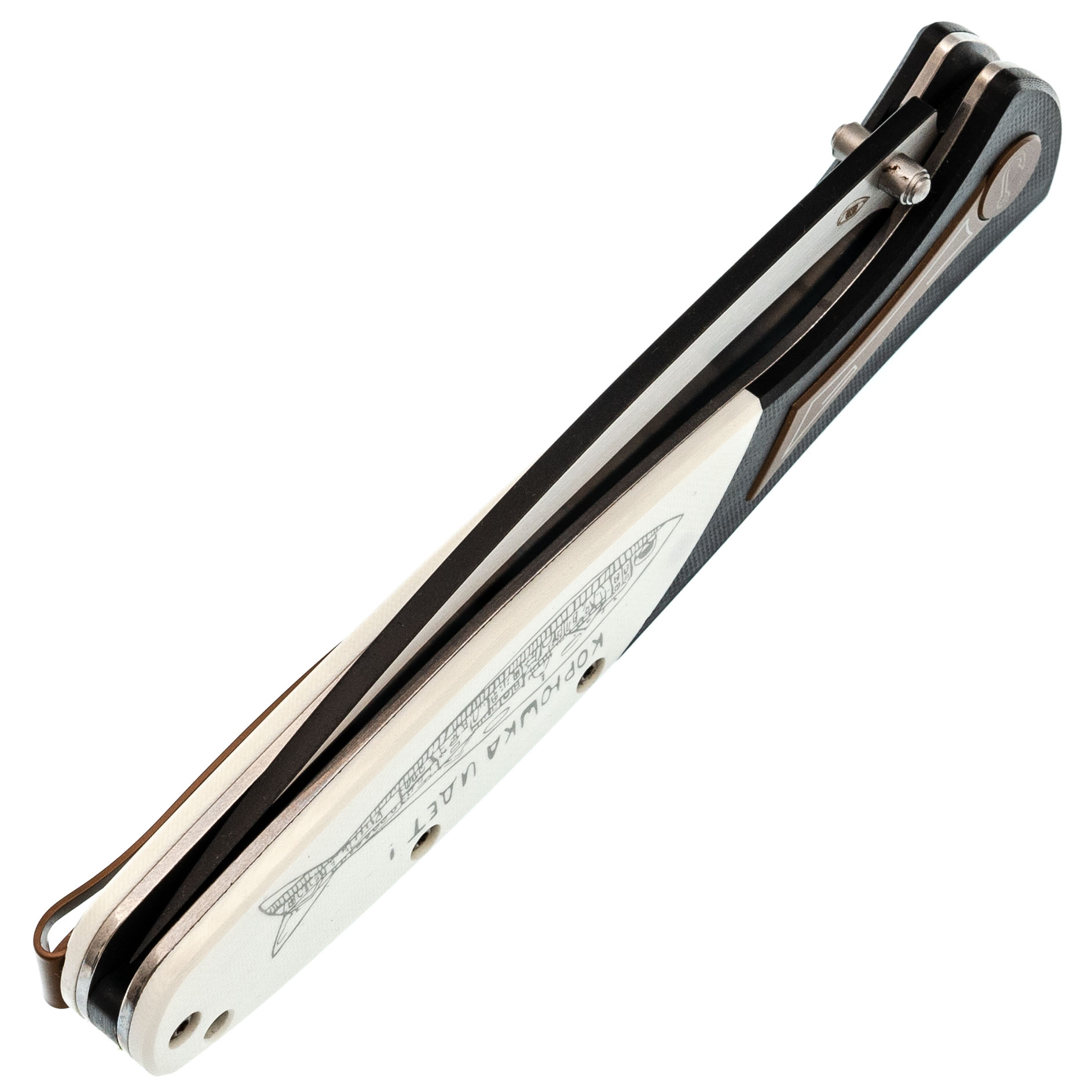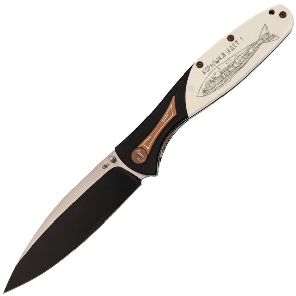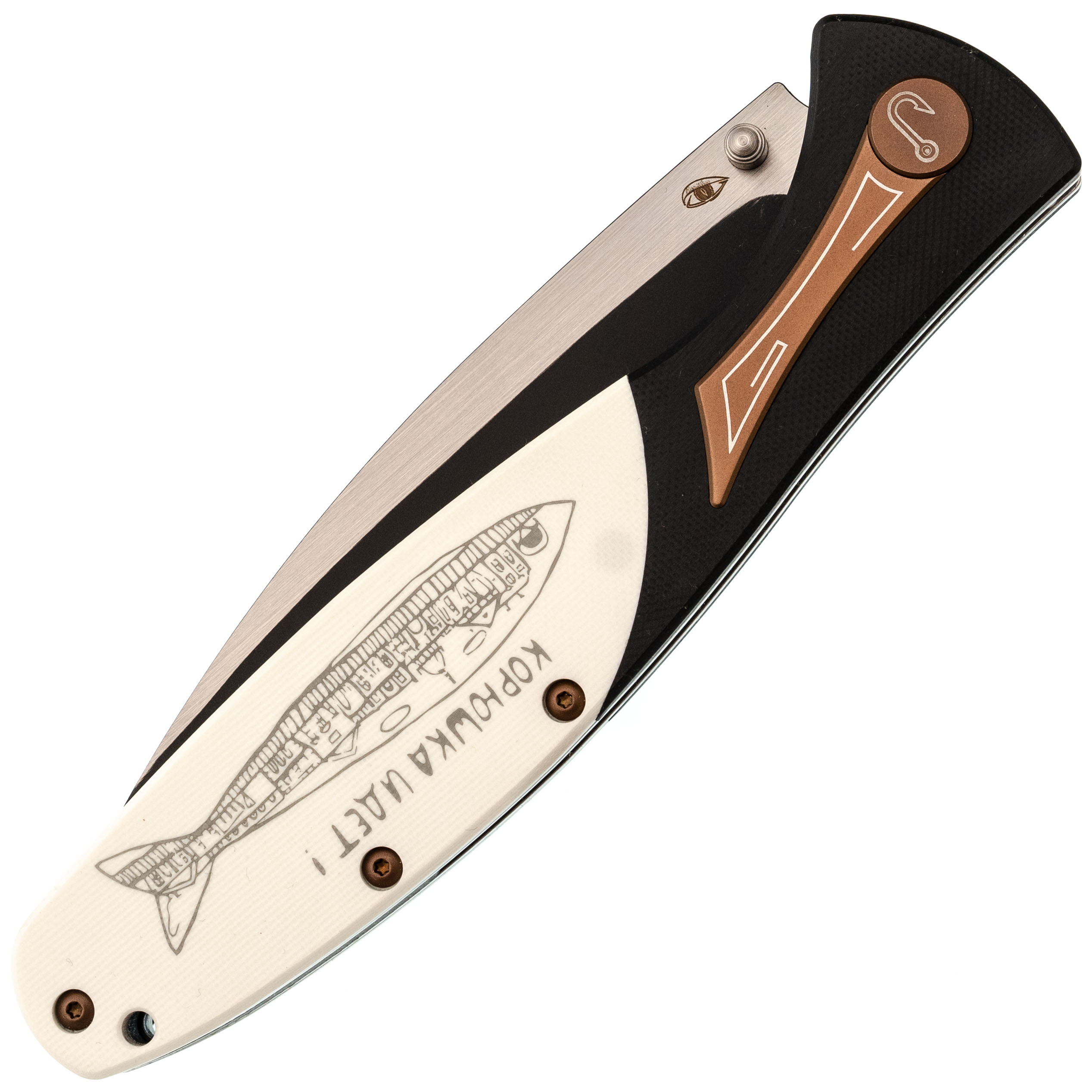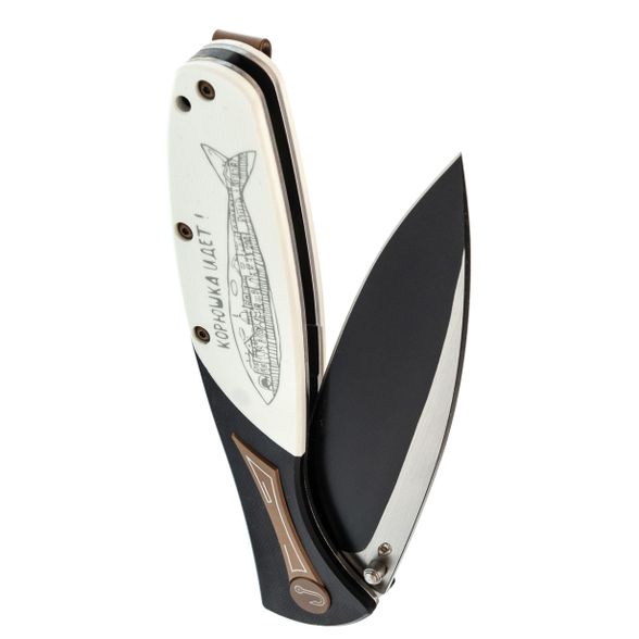 Здесь сочетаются практичность и узнаваемый образ. Чёрное PVD-покрытие защищает клинок и делает внешний вид спокойным. На рукояти - корюшка, вид на Петербург и надпись «Корюшка идёт». Клинок открывается шпеньками, что удобно и привычно.