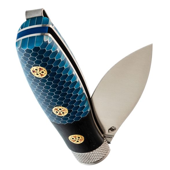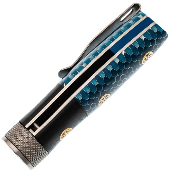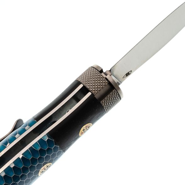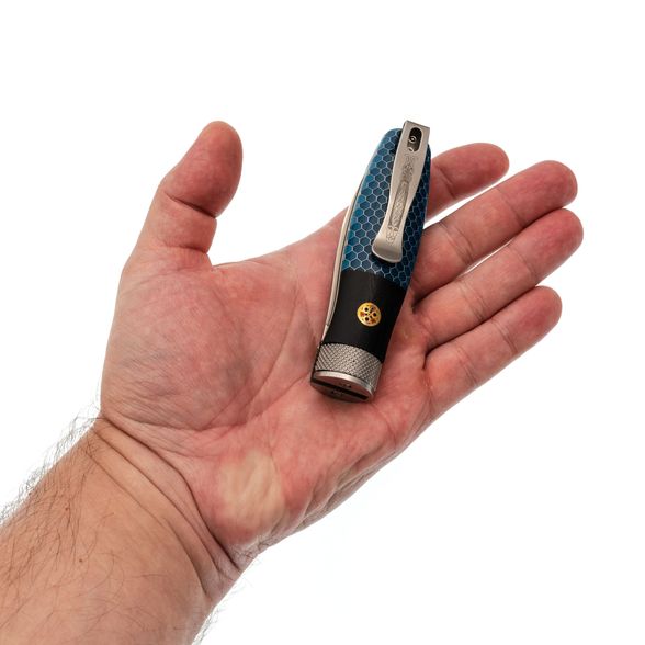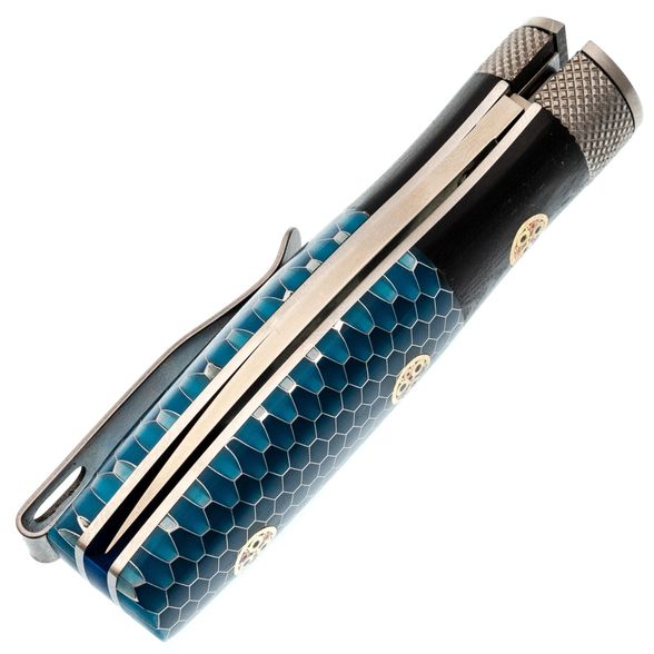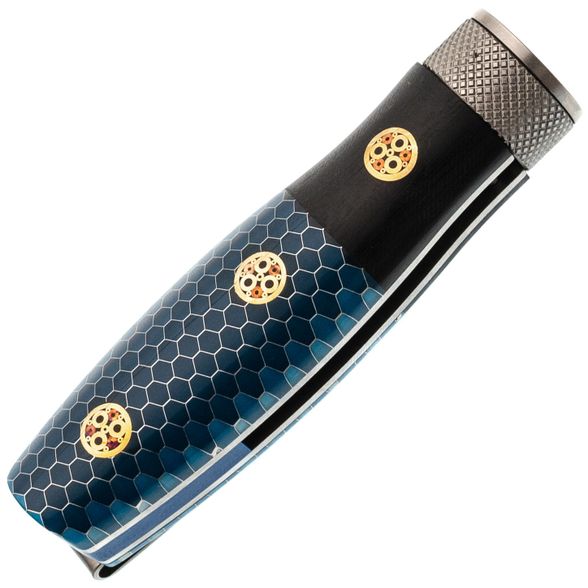 Рукоять из G10 и G Tek с бочкообразной формой идеально заполняет руку, создавая ощущение надежности и комфорта при работе. Мозаичные пины добавляют визуальную привлекательность и делают модель уникальной.