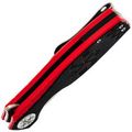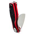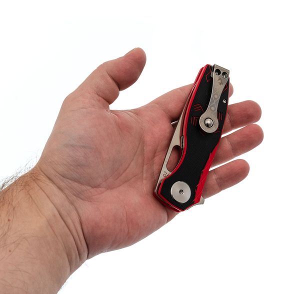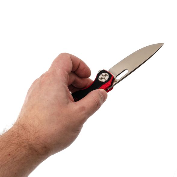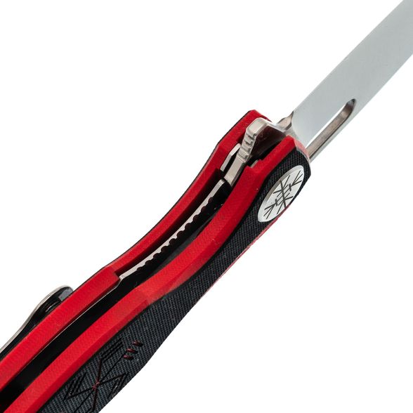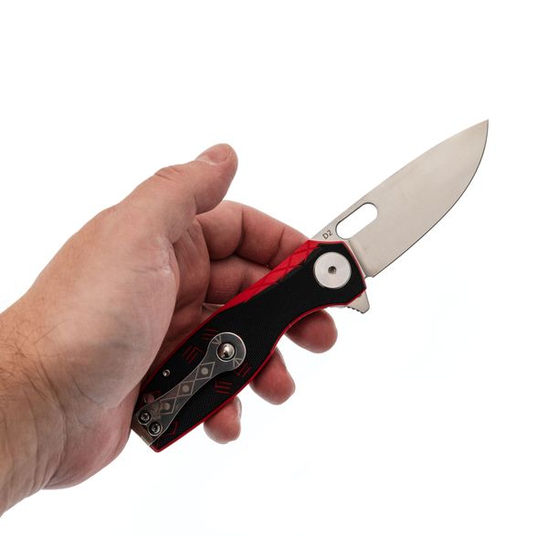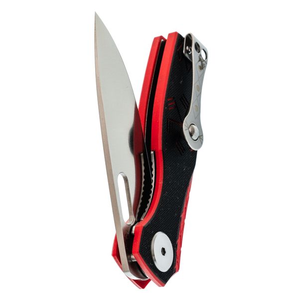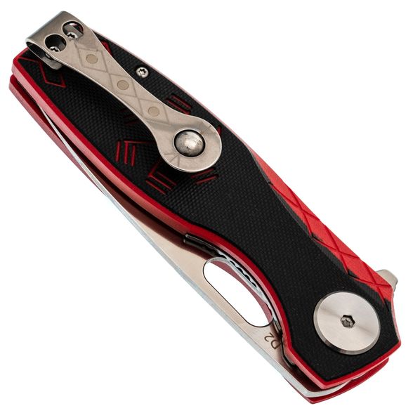 Клинок ножа выполнен из инструментальной стали D2, что обеспечивает ему отличные характеристики прочности и удержания заточки. Сама форма клинка классическая для утилитарных ножей – Clip-Point с прямыми спусками от обуха, что позволяет использовать его как для точных резов, так и для более грубой работы. Сталь D2 закалена до высокой твёрдости, что гарантирует долговечность остроты и устойчивость к износу при длительном использовании. Для удобства открытия на клинке предусмотрен плавник и отверстие, что делает процесс раскрытия ножа быстрым и интуитивно понятным.