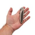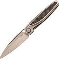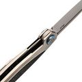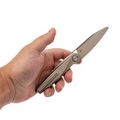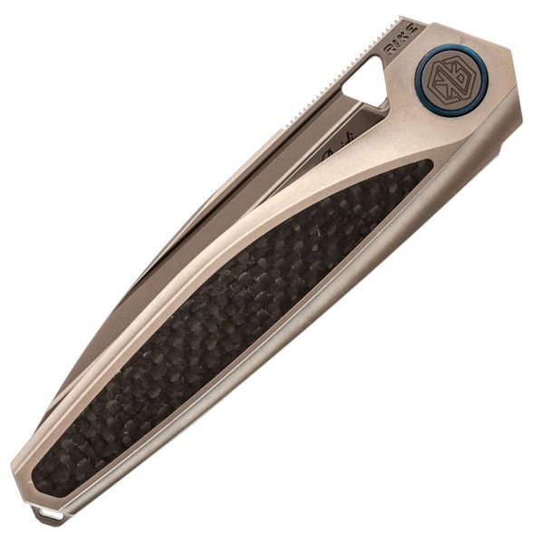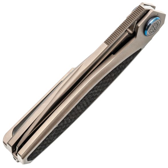 Рукоять модели это гармоничный дуэт титана и карбона. Титановая основа обеспечивает легкость и прочность, в то время как вставки из карбона придают ножу уникальный и завораживающий образ. Плавность рукояти обеспечивает комфорт и безопасность при удержании. Еще одной особенностью является замок Liner-Lock, который крепится к рукояти изнутри на винты. Хотя его надежность не является самой впечатляющей среди складных ножей, её достаточно для повседневного использования. Основное преимущество такой конструкции замка заключается в возможности простой замены, что обеспечивает длительный срок службы ножа.