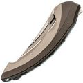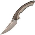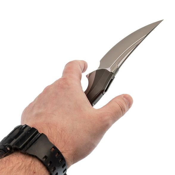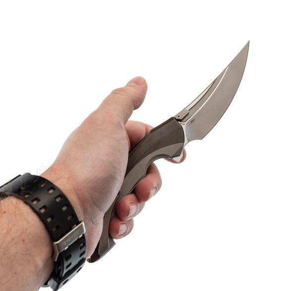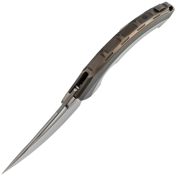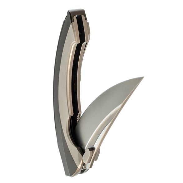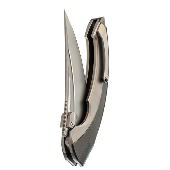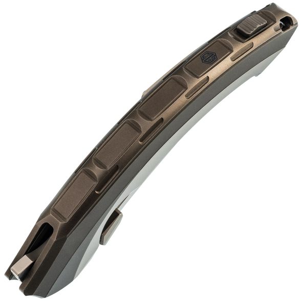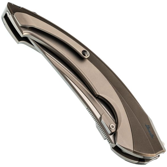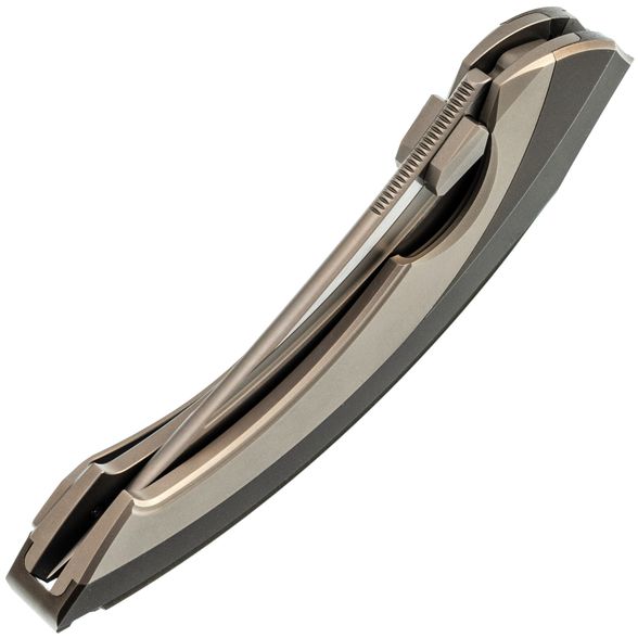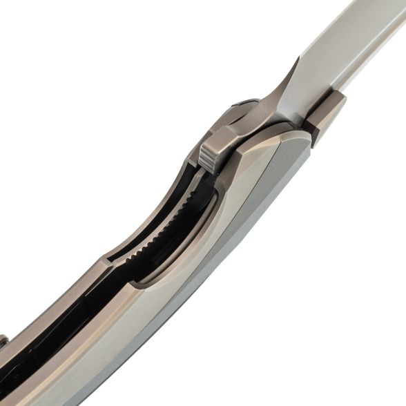 Рукоять выполнена полностью из титана и имеет интегрированный замок Liner-Lock. Изогнутая форма и глубокая подпальцевая выемка позволяют ножу прекрасно лежать в любой руке. Клипса тоже выполнена из титана и имеет керамический шарик, дабы не рвать карман. Главной особенностью ножа является его разборная конструкция - все винты спрятаны под титановую крышку, которая снимается благодарю нажатию специальной кнопки. Отсутствие винтов на ноже смотрится весьма непривычно, что только добавляет плюсиков в технологичный дизайн ножа.