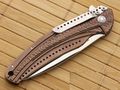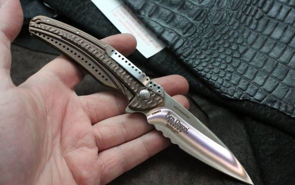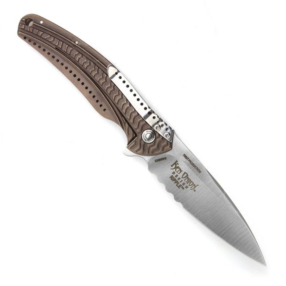 Складной нож CRKT Ripple Bronze Combo, сталь Acuto 440 - отличается исключительным качеством изготовления, а также почти невероятной шелковистой плавностью и быстротой открывания благодаря использованию внутренней шарикоподшипниковой системы IKBS. Клинок модифицированного дроп-пойнта имеет высокую полую заточку, завальцованную верхнюю кромку и сатинированную отделку. Сталь клинка - высокоуглеродистая нержавеющая сталь Acuto 440 с показателем HRC 57-59. Лезвие мгновенно открывается нажатием любой рукой на клинковый флиппер. Для безопасности в закрытом состоянии клинок оснащен шариковым фиксатором. Даже самые лучшие обычные подшипники, вращающие лезвие, имеют некоторую степень трения, которое препятствует первоначальному движению, или "заедание". В отличие от них, открывание лезвия Ripple происходит практически без трения благодаря системе шарикоподшипников IKBS. В этой инновационной и простой конструкции шарикоподшипники встроены в нержавеющий поворотный винт. Она компактна и при необходимости регулируется на винте поворота лезвия. Система IKBS не только отличается исключительной плавностью открывания и закрывания, но и долговечна, не требует особого ухода, а также позволяет получить нож с высокой жесткостью и отсутствием люфта клинка.