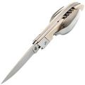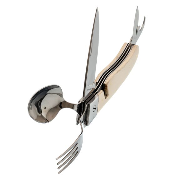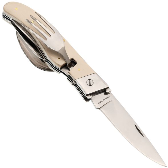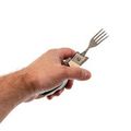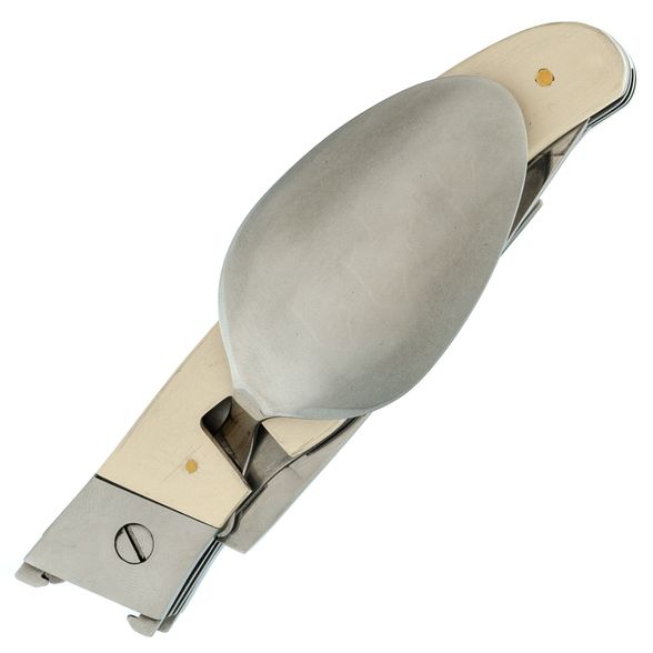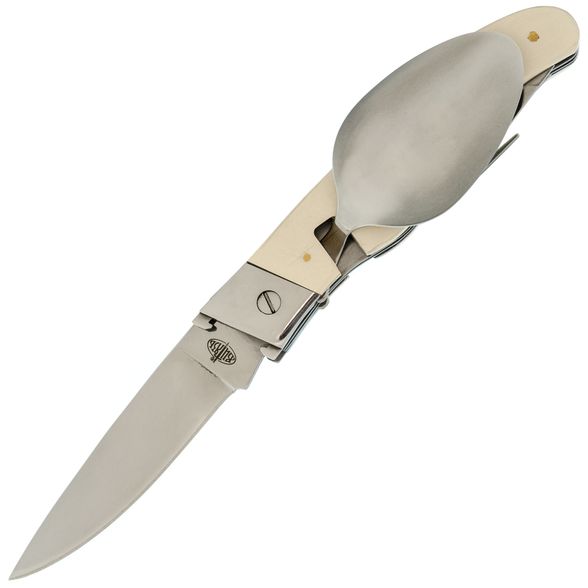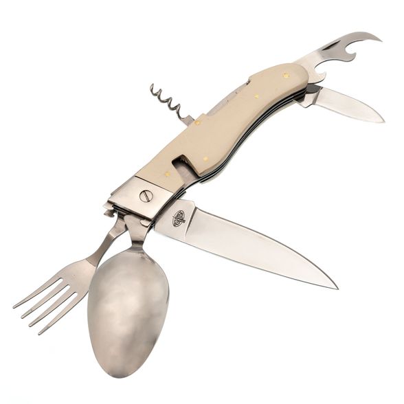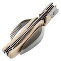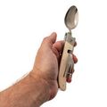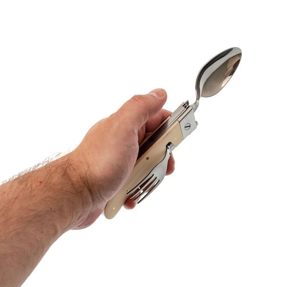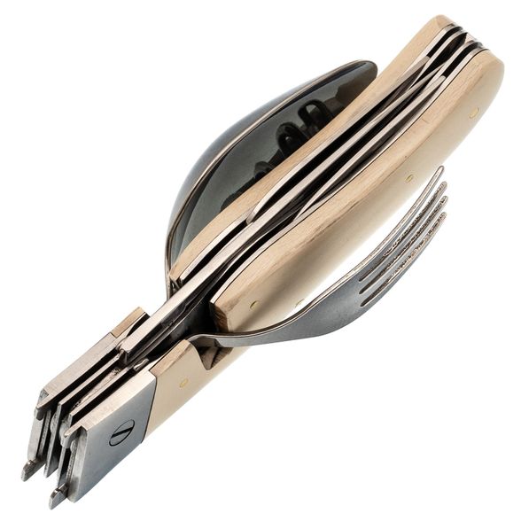 Рукоять с плавным изгибом ложится в ладонь естественно, не скользит и помогает контролировать движение. Все элементы - от ложки с вилкой до открывалок и штопора - подпружинены и фиксируются Slip-Joint-механизмом, чтобы детали не "гуляли" при работе. В итоге получается аккуратный, понятный в использовании туристический комплект для повседневных вылазок.