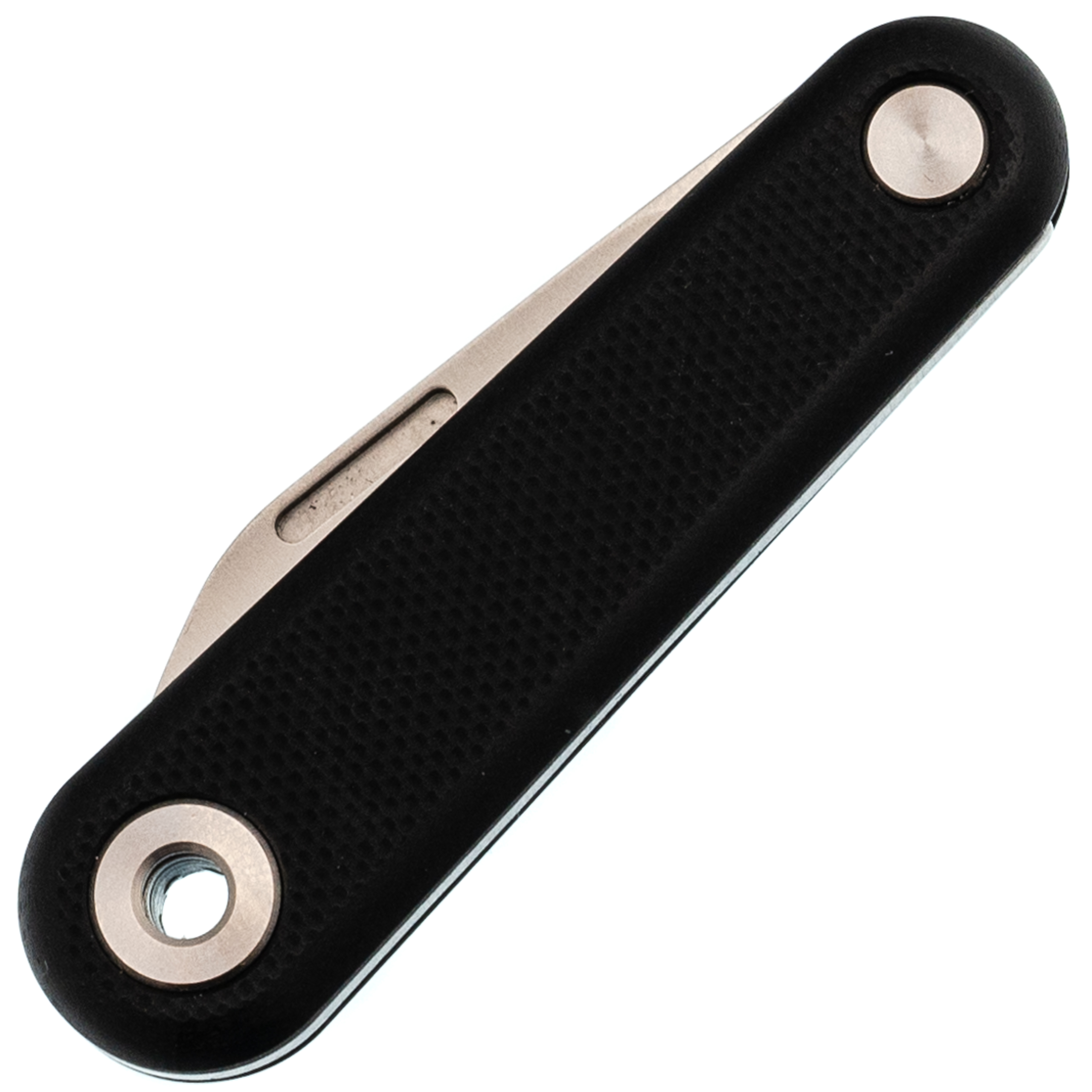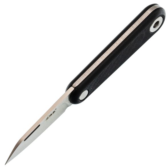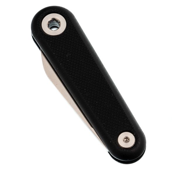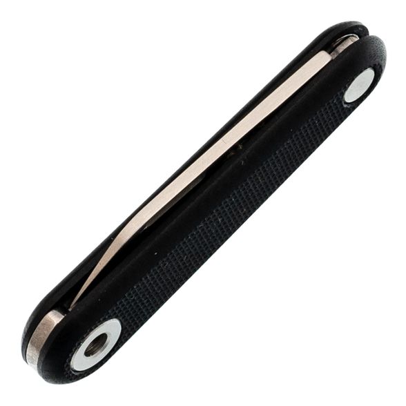 - Рукоять из чёрного G10. Армированный стеклотканью пластик, который используют в авиации и ножах: он не треснет от удара, не разбухнет от воды и не потеряет вид через год носки. Текстура слегка шершавая - рука не скользит.