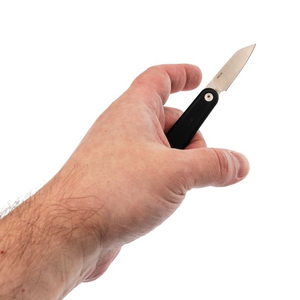 - Сталь клинка - шведская 12C27. Это одна из самых популярных нержавеек для повседневных ножей: она не ржавеет, неплохо держит заточку и при этом легко правится даже простым керамическим точилом. Для мелких работ - самое то.