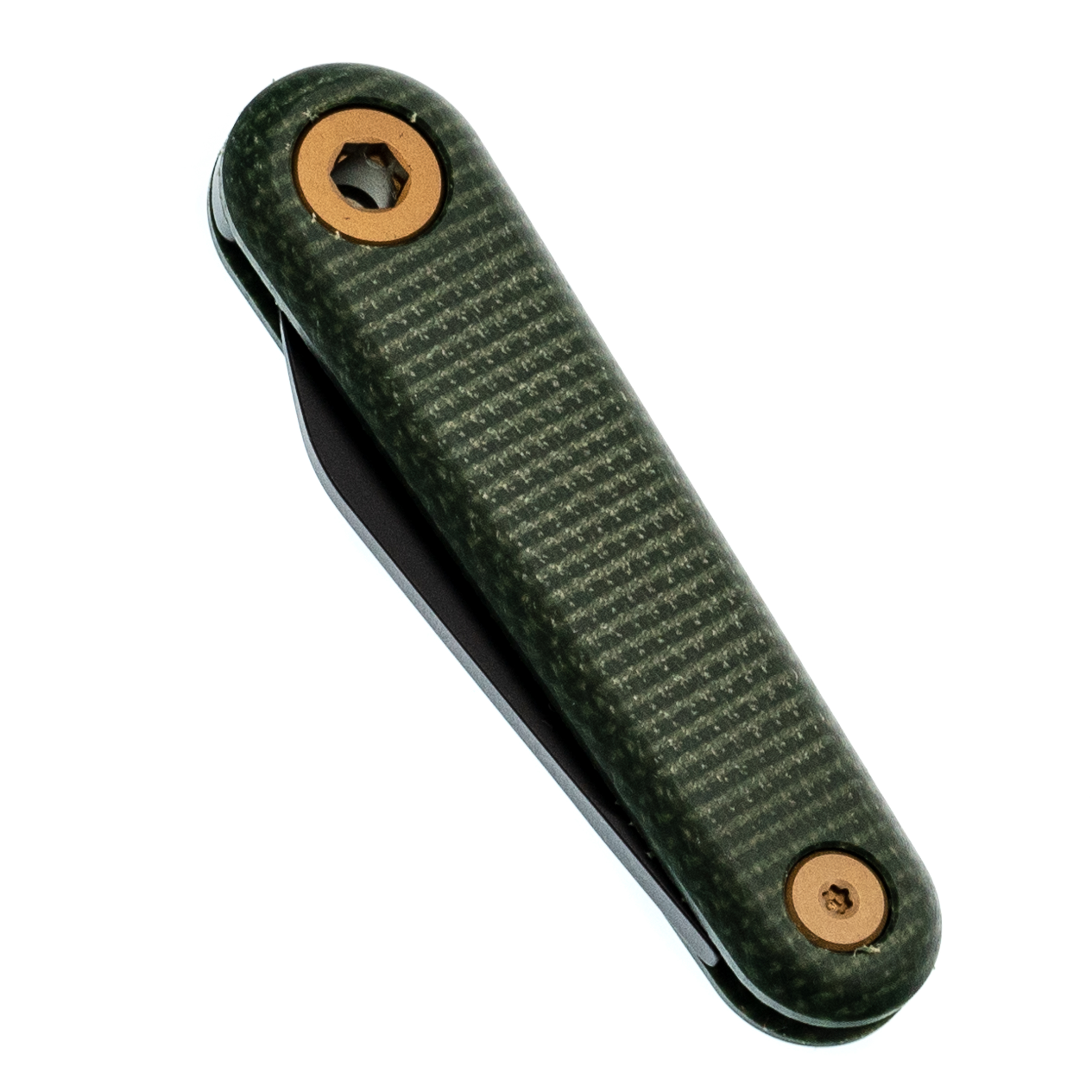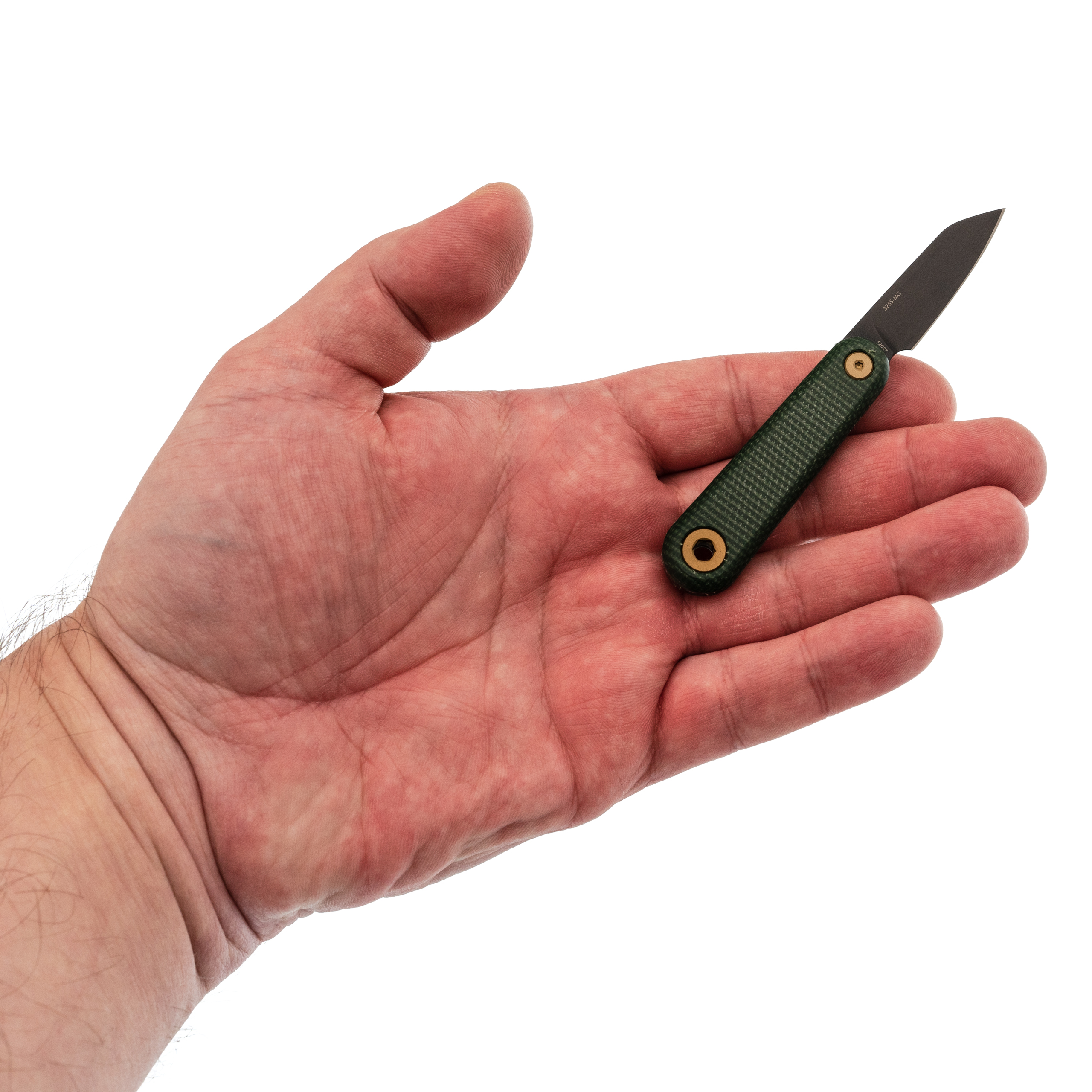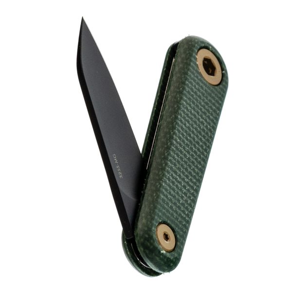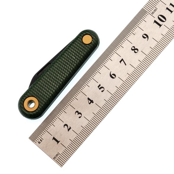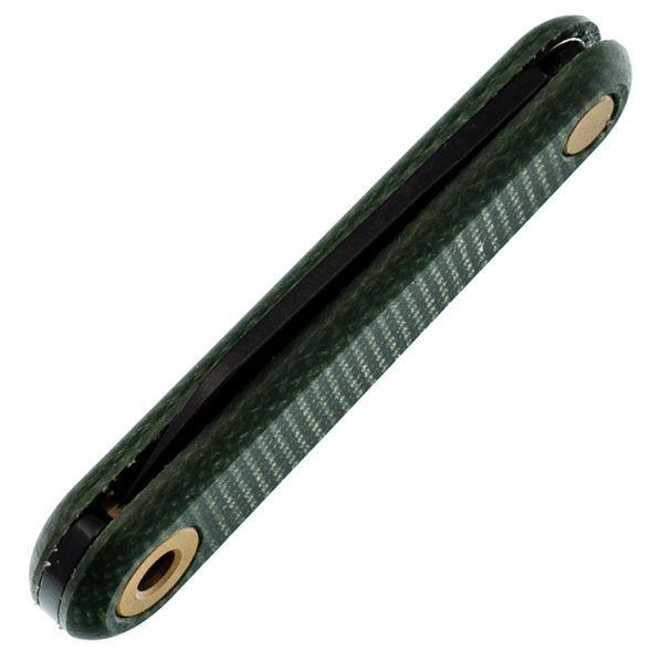 - Рукоять из зелёной микарты. Это спрессованные под давлением слои ткани, пропитанные эпоксидной смолой. Материал тёплый на ощупь, в руке не скользит даже мокрой, со временем приобретает благородную патину. Зелёный цвет с лёгкой текстурой придаёт ножу естественный, "природный" вид.