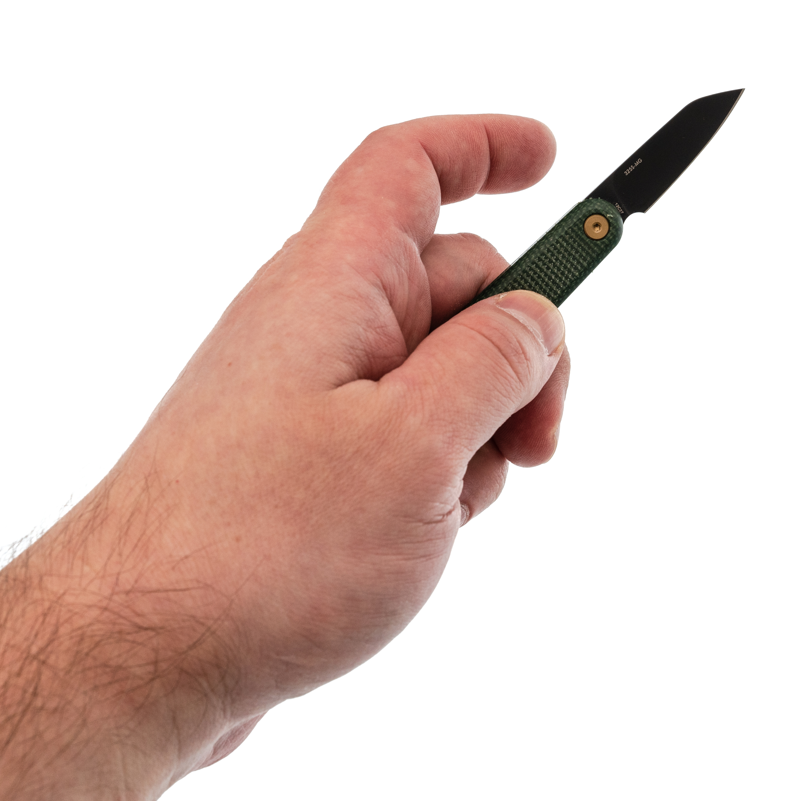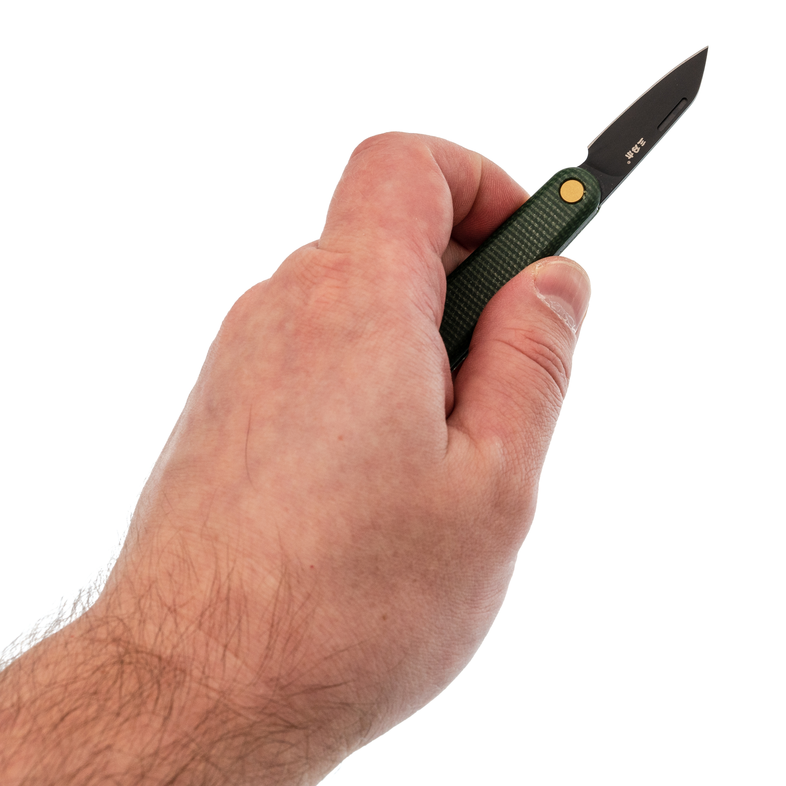 Форма рукояти намеренно простая - параллелепипед со сглаженными рёбрами. Её можно держать как угодно: пальцы сами находят удобное положение. Зелёная микарта выглядит стильно и не скользит.