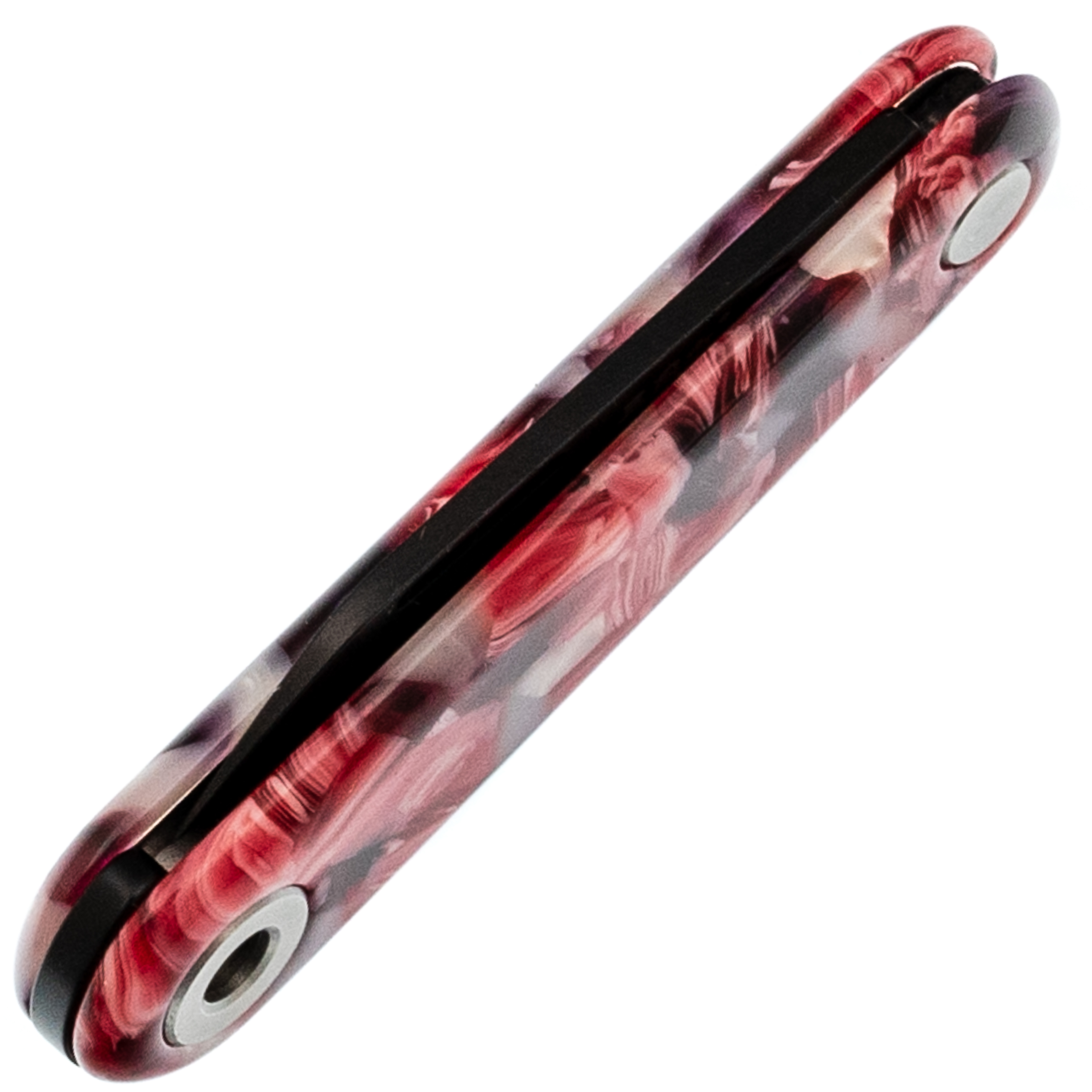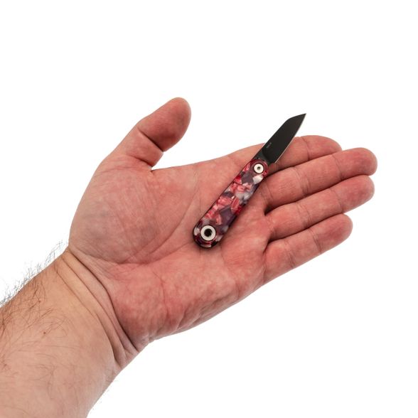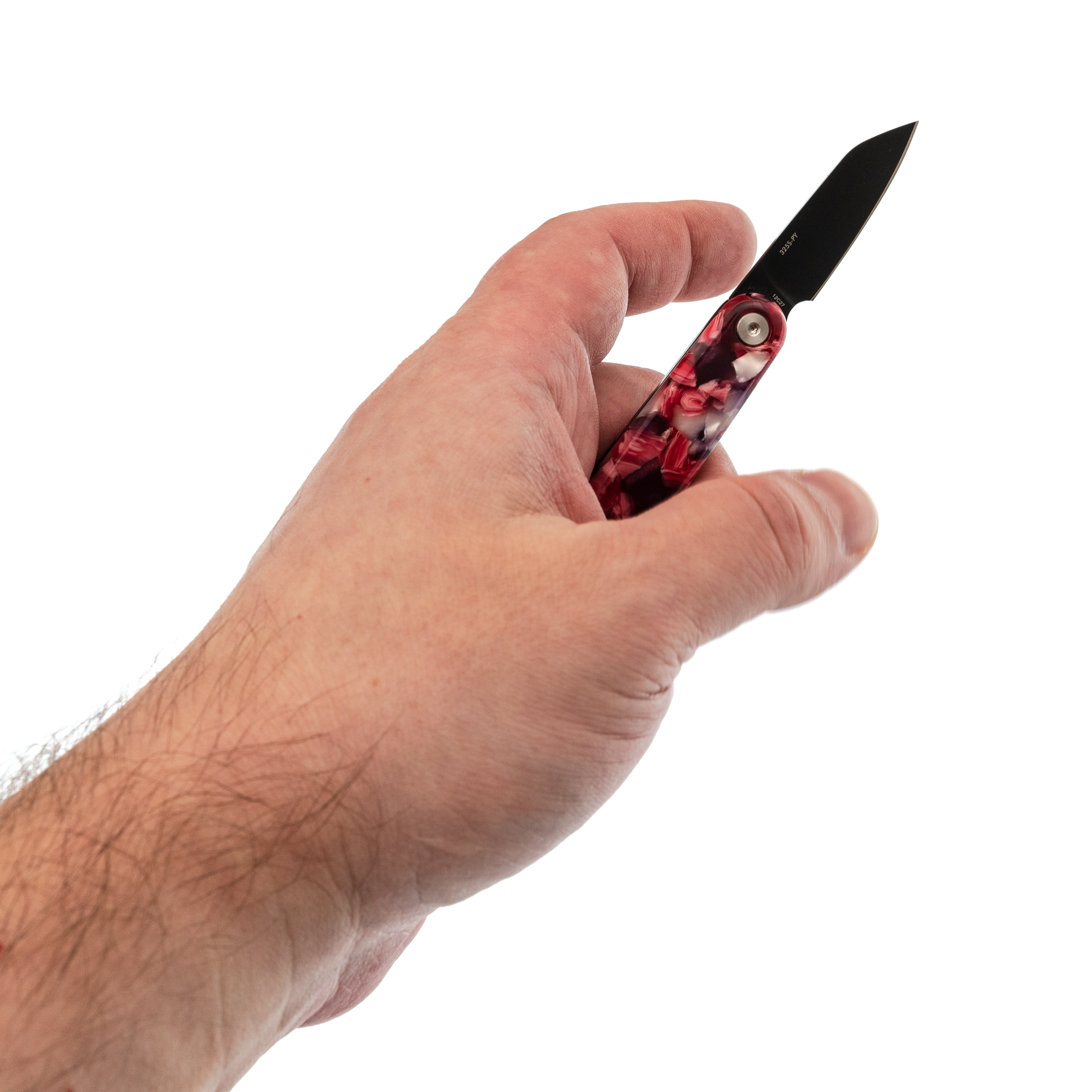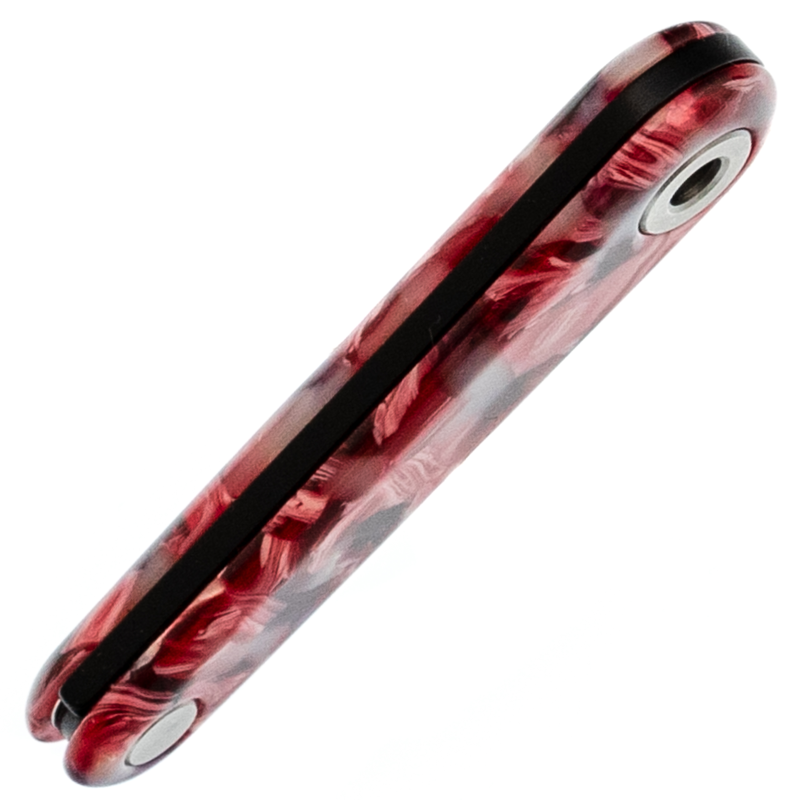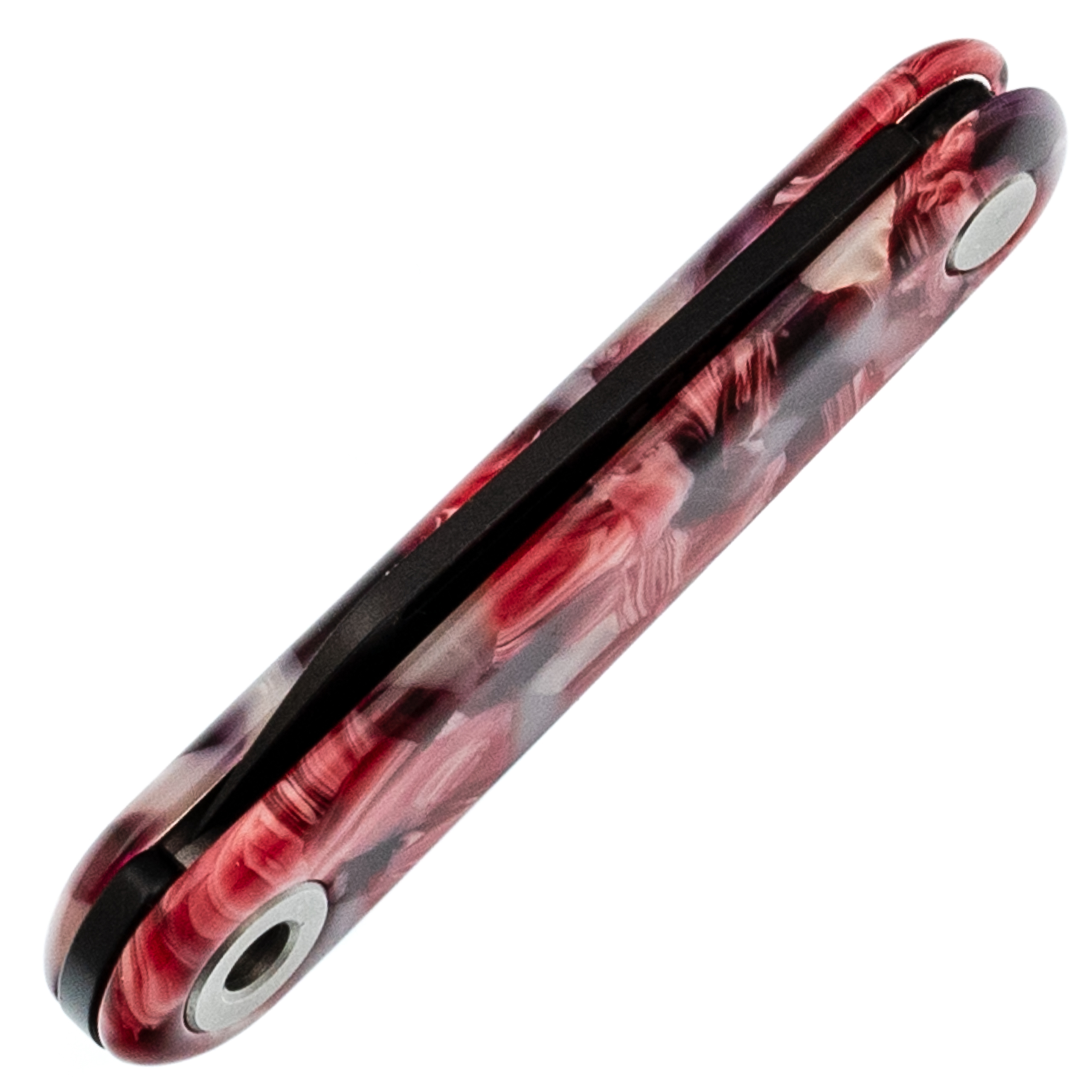 - Рукоять из эпоксидной смолы с хаотичным узором. Сочетание красного, розового и белого создаёт абстрактный рисунок - ни одного одинакового ножа. Смола прочная, как хороший пластик, не боится ударов и царапин. Поверхность гладкая, но благодаря форме рукояти не скользит в ладони.
