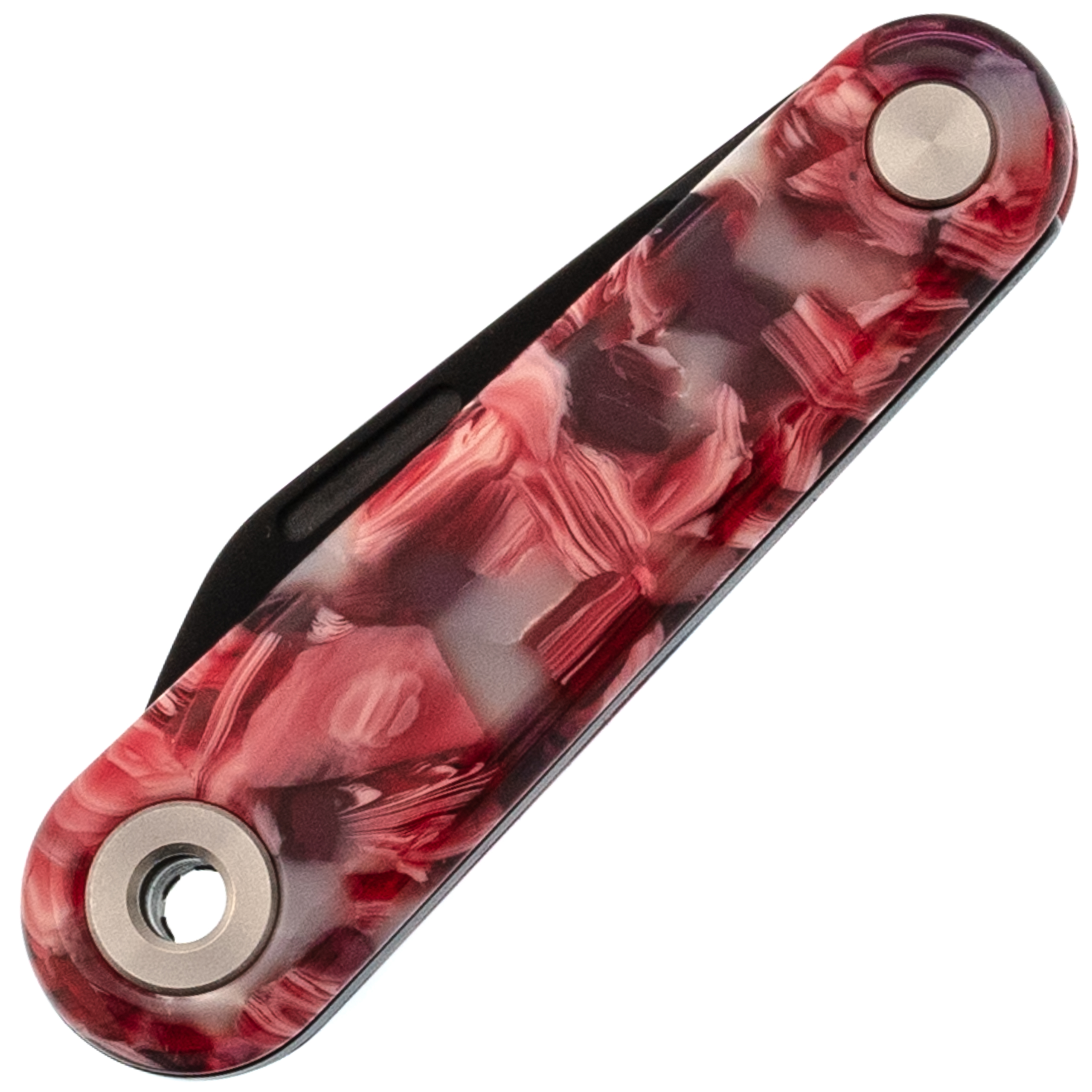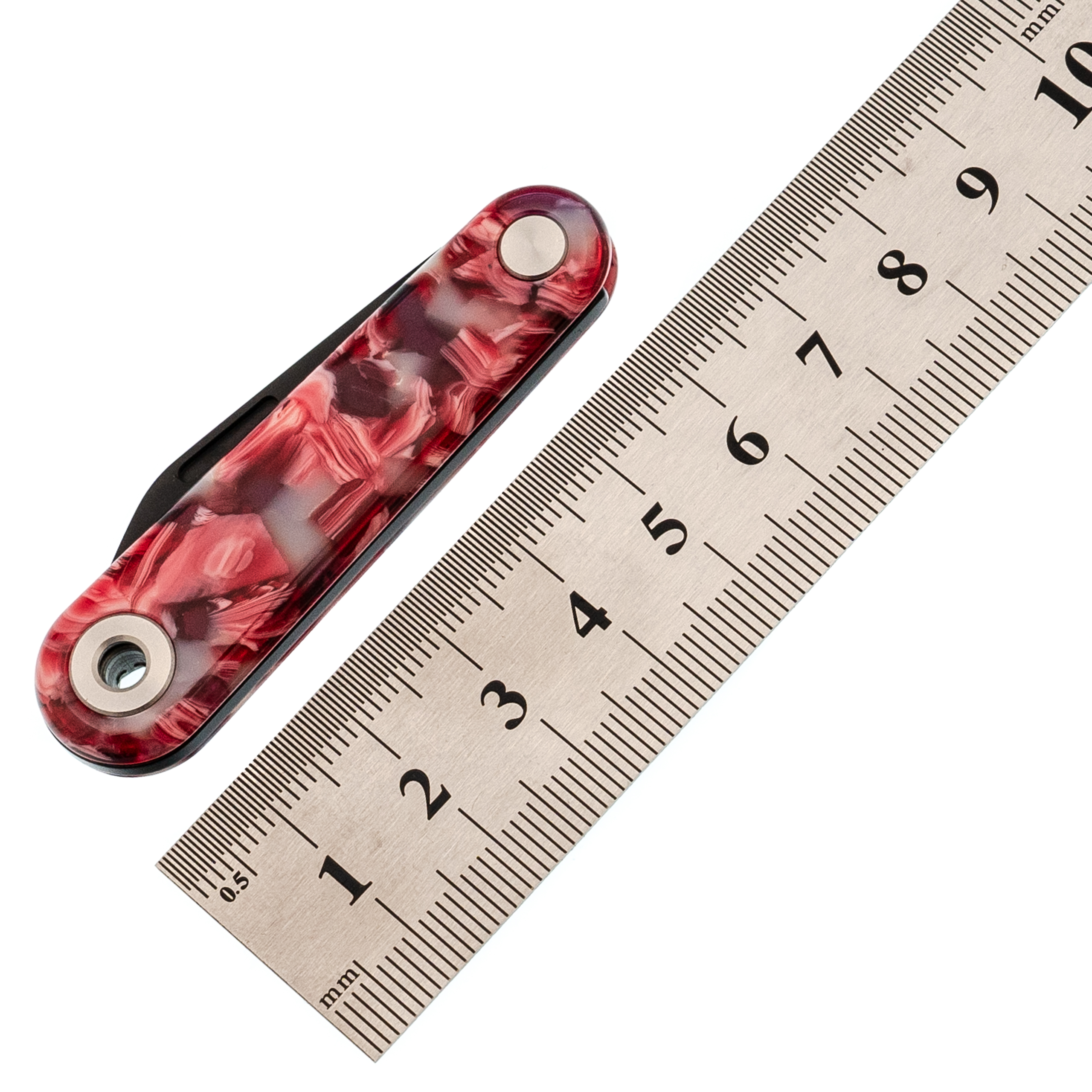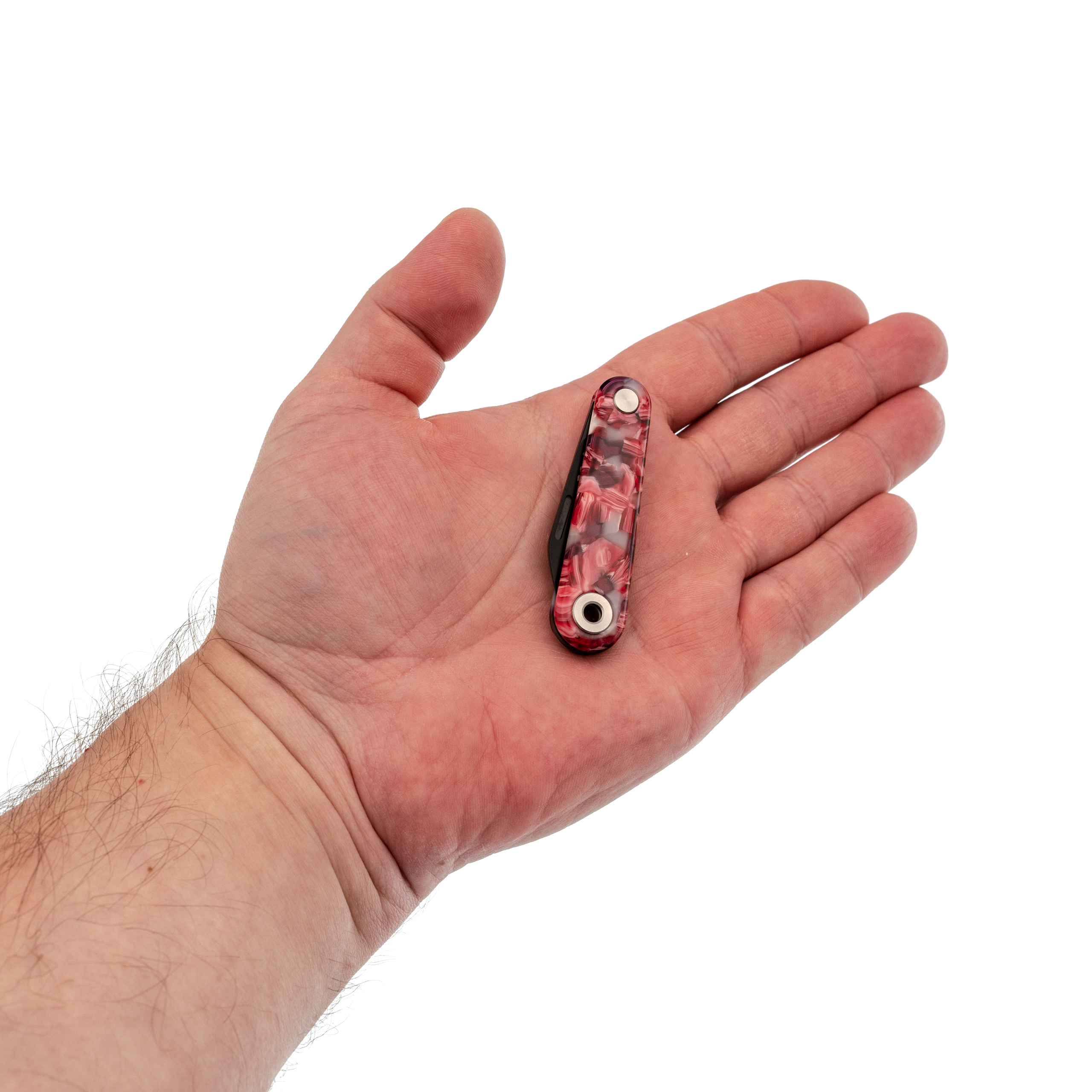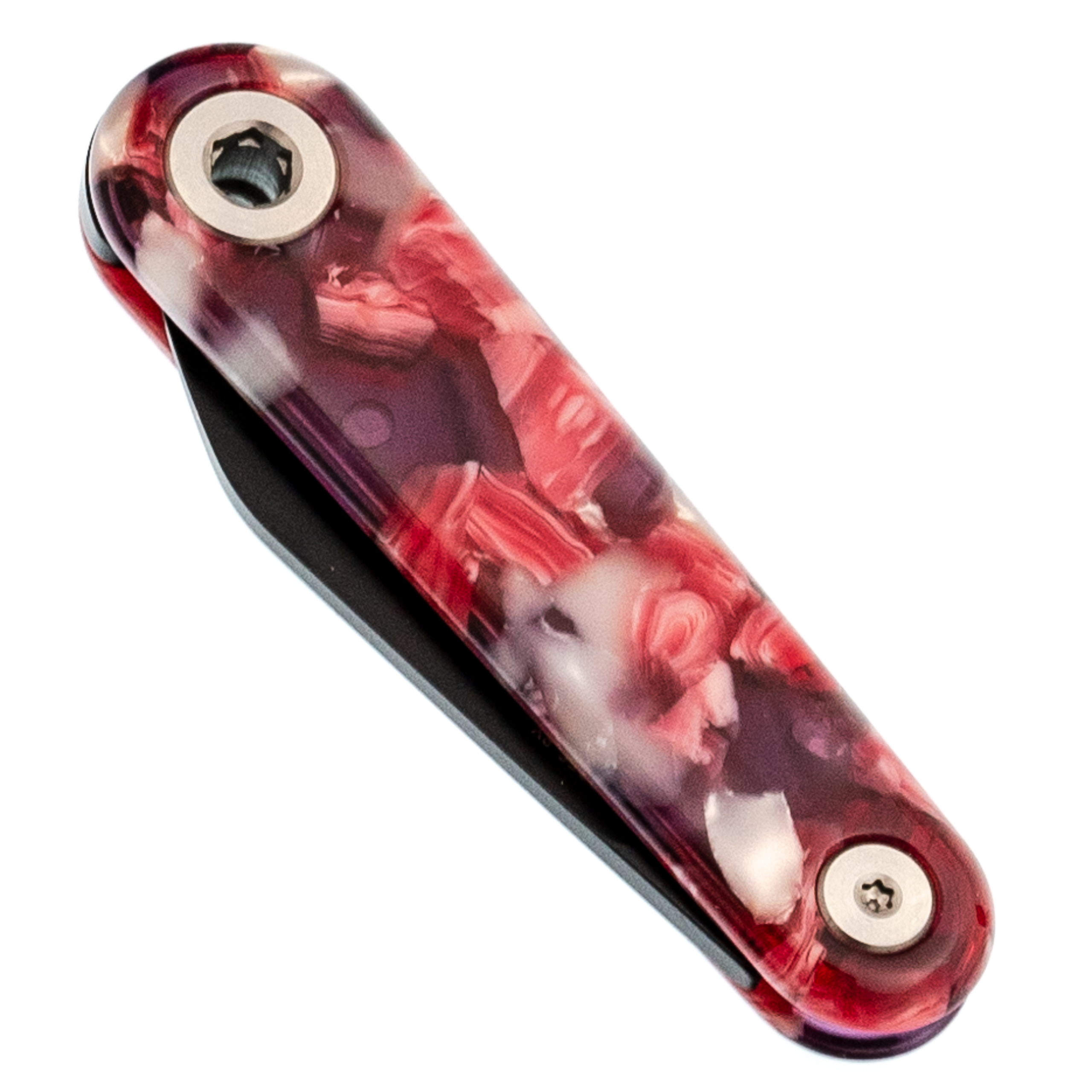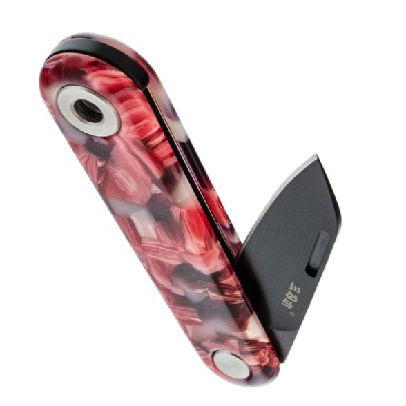 - Рукоять из эпоксидной смолы с хаотичным узором. Сочетание красного, розового и белого создаёт абстрактный рисунок - ни одного одинакового ножа. Смола прочная, как хороший пластик, не боится ударов и царапин. Поверхность гладкая, но благодаря форме рукояти не скользит в ладони.