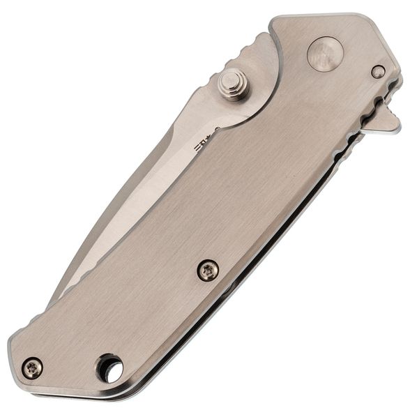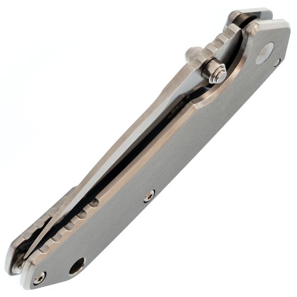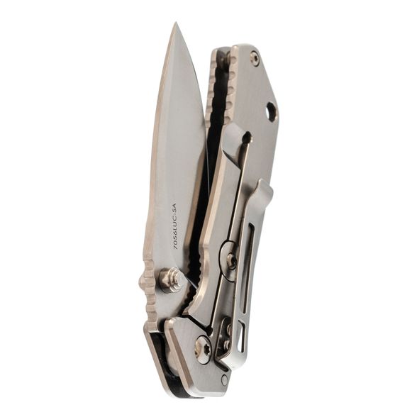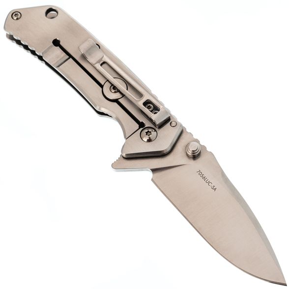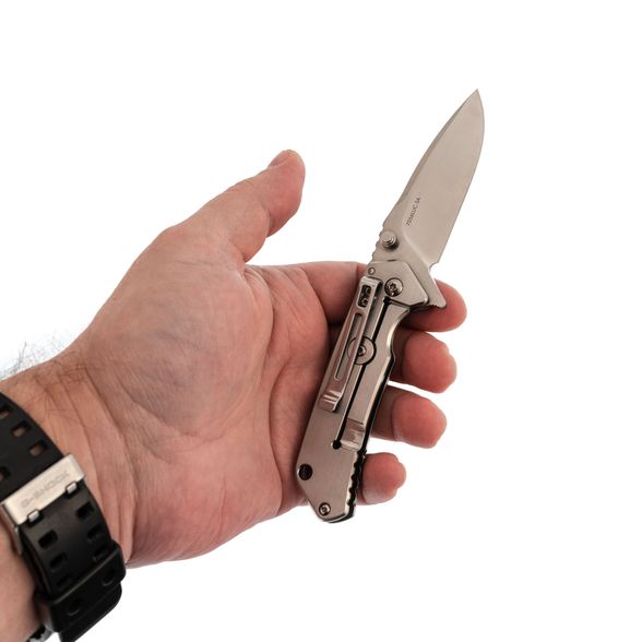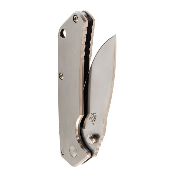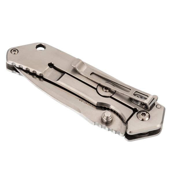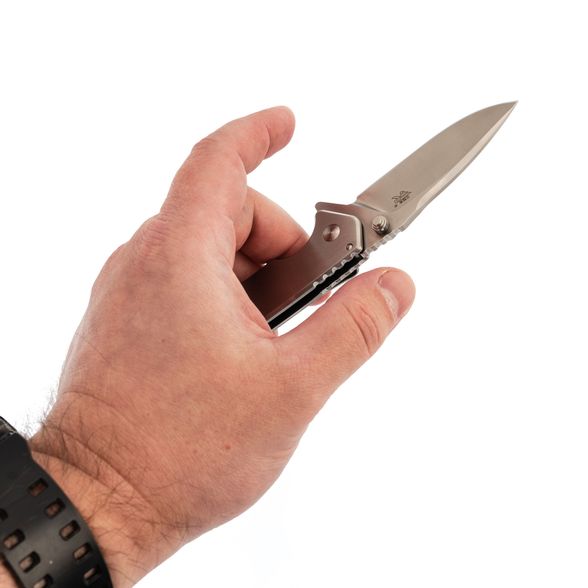 Цельнометаллическая рукоять отличается строгим утилитарным стилем. Её форма продумана для удобного хвата, а умеренная увесистость делает нож сбалансированным в руке. Повседневное ношение облегчает карманная клипса, а отверстие под темляк добавляет практичности при транспортировке и использовании в туристических условиях.