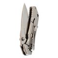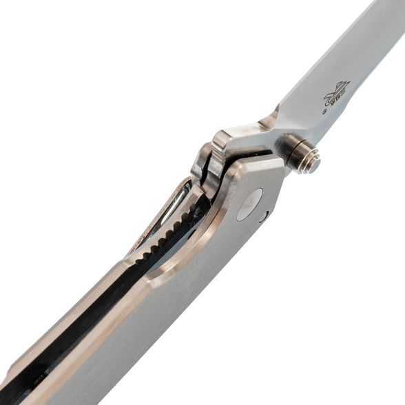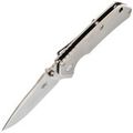 Клинок выполнен в профиле Drop-Point - одном из самых универсальных для складных ножей. Прямые спуски к режущей кромке обеспечивают эффективный и контролируемый рез. Широкое лезвие удобно в работе с самыми разными материалами. Открытие ножа возможно как с помощью шпеньков с обеих сторон, так и с помощью плавника. За безопасность отвечает надёжный замок Frame-Lock с ограничителем, исключающим чрезмерное открытие.